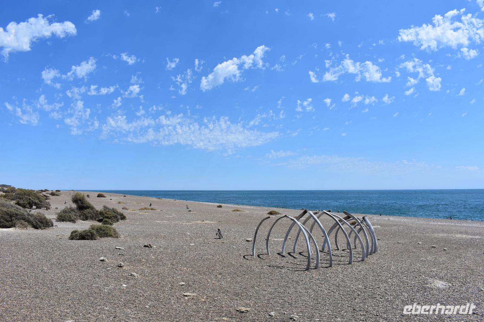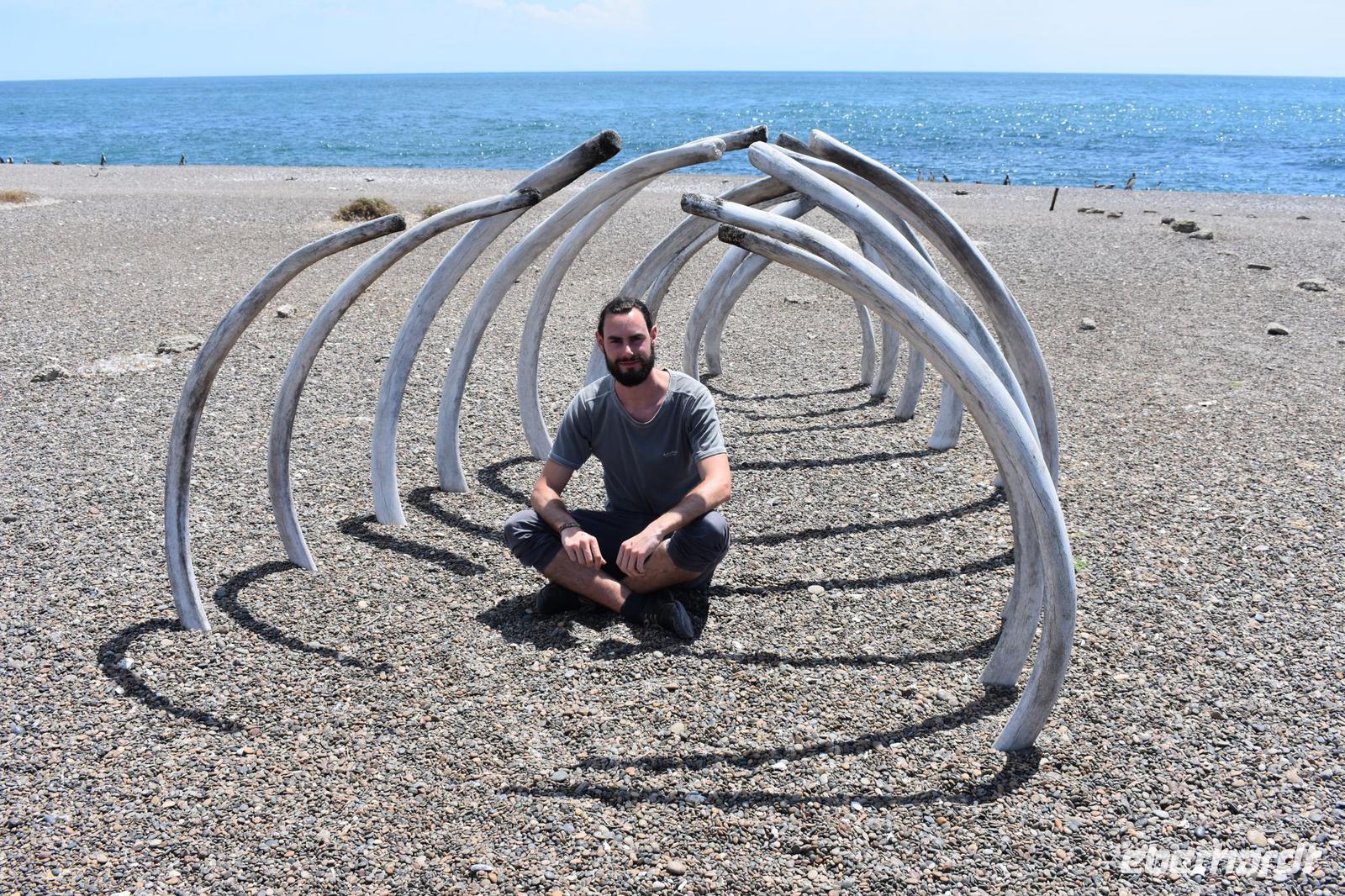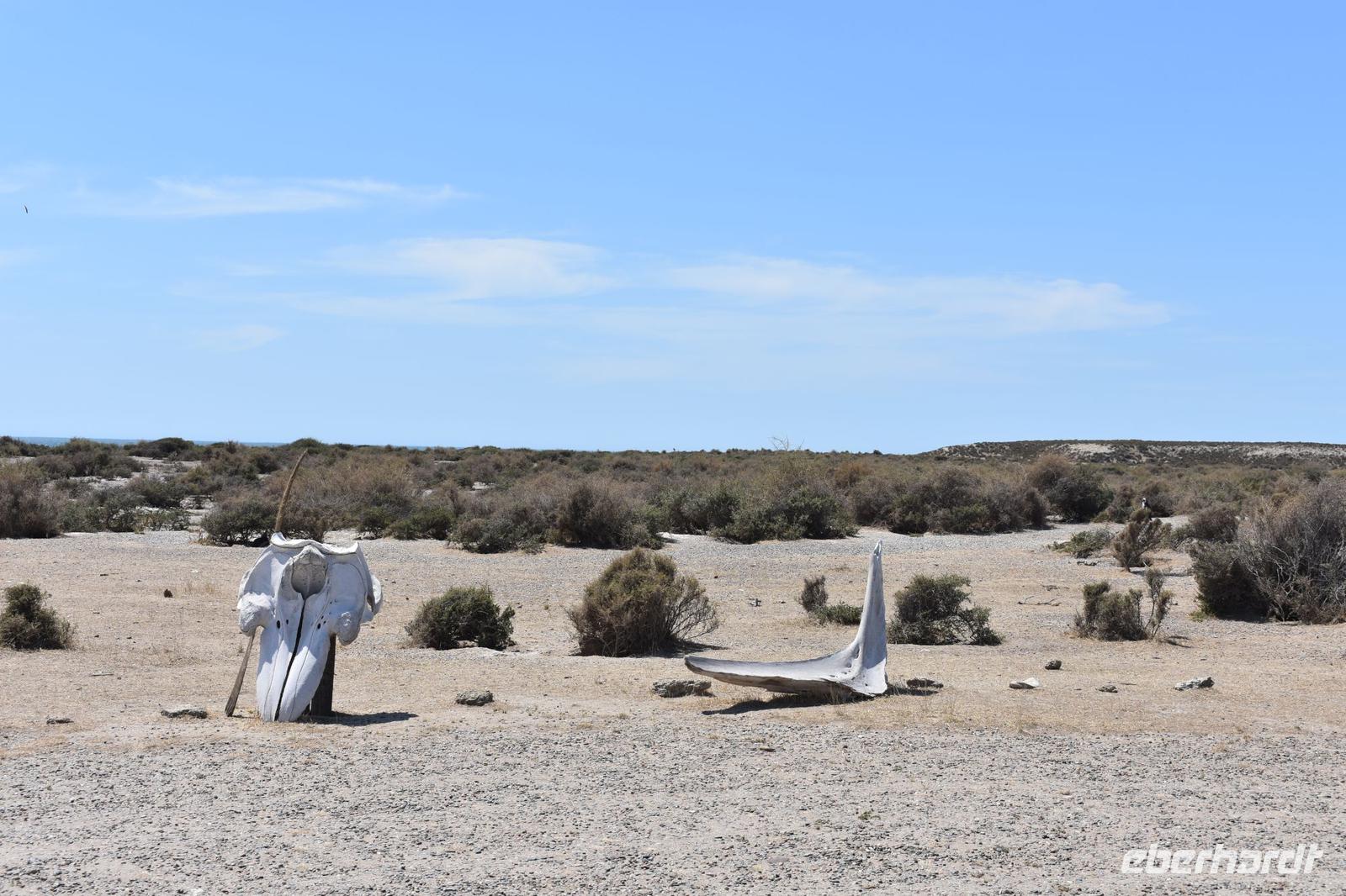 Wir saßen noch beim Frühstück an Deck, unter freien Himmel wohlgemerkt - die Luft war klar und das Wasser glatt wie ein Spiegel. Wir fuhren langsam in die Bucht Golfo Nuevo ein und legten an Puerto Madryn gegen 9 Uhr an. Auf dem Weg dorthin sah man in der Ferne auch eine kleine Gruppe Wale. Alle von unserer Reisegruppe waren bereit, so konnten wir als eine der Ersten von Bord gehen. Nicht weit von der Gangway entfernt wartete auch schon Robby, unser örtlicher Reiseführer, auf uns. Der erste Stopp in Richtung Nationalpark des UNESCO-Weltnaturreservates war das Centro de Visitantes. Dort konnten wir einen kleinen Eindruck über die Vielfalt der Halbinsel Valdes erlangen. Mich hat hier besonders das Skelett eines südlichen Glattwals, oder auch Südkaper genannt, beeindruckt. Ein wirkliches Meeresungeheuer, bei dem ich mir gut vorstellen konnte, dass die früheren Seefahrer einst Angst vor solch einem Tier hatten und es als Ungeheuer bezeichneten. Der südliche Glattwal ist erschreckend groß und könnte sicher einen Menschen verspeisen, wenn er sich nicht auf Krebse spezialisiert hätte.