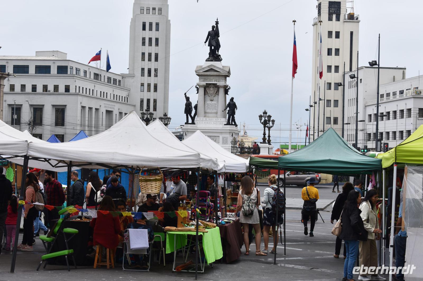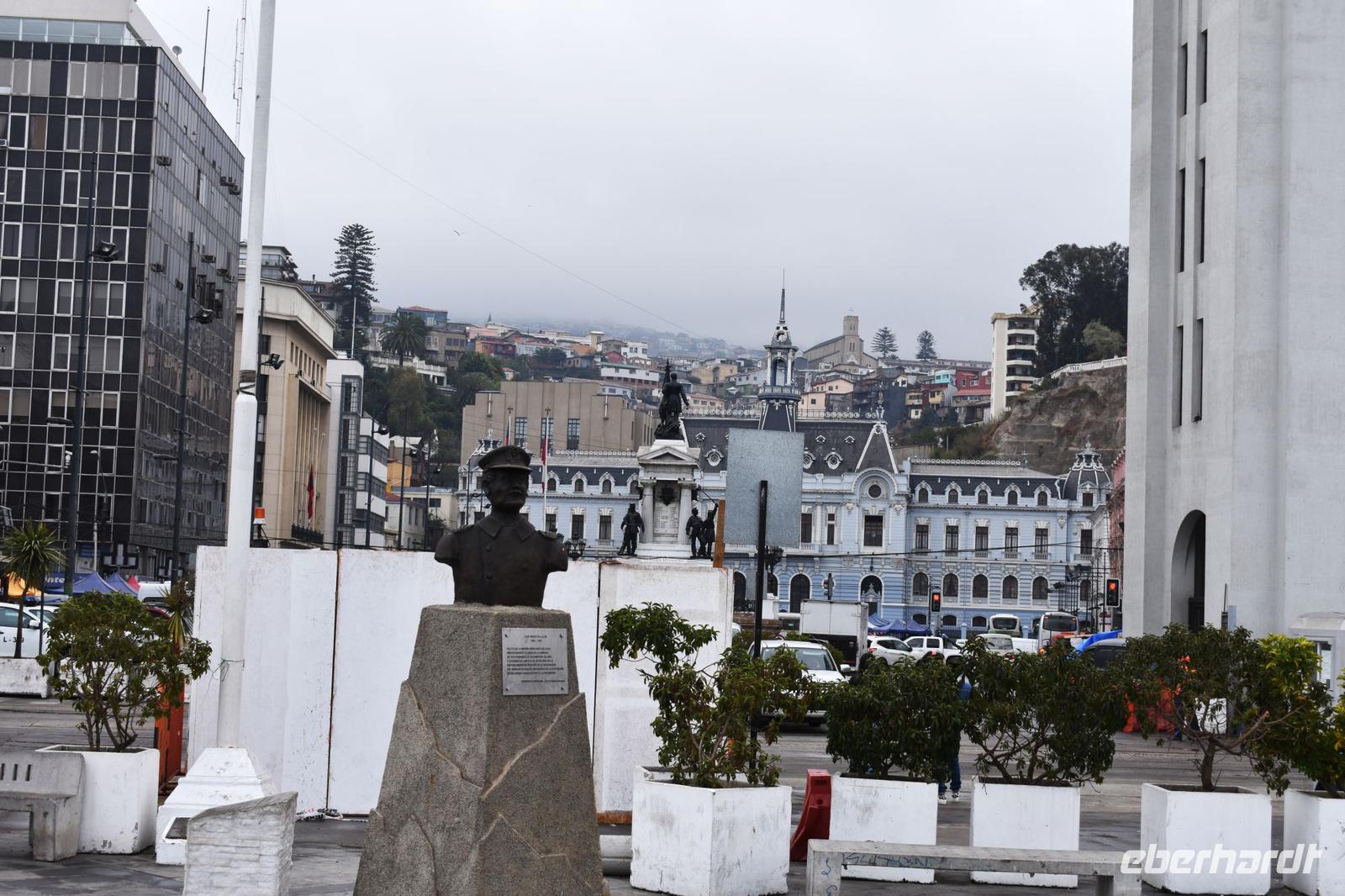 Wir hatten gehofft da sich die dicke graue Wolke von gestern Nachmittag wieder verziehen würde, doch leider war dem nicht so. Im Gegenteil, zwischenzeitlich hatten wir einen kurzen Nieselregen zu spüren bekommen. Aber dennoch konnten wir die imposante chilenische Stadt genießen. Zuerst fuhren wir mit dem Bus am Kongress und dem Triumph-Bogen der einst wichtigsten Hafenstadt Südamerikas am Pazifik. Dann besichtigten wir den Hafen, wo auch die Marine ein Denkmal besitz - Monumento a Los Heroes de Iquique. Das Denkmal gedenkt den gefallenen Marinesoldaten, die am 21. Mai 1879 in den Kämpfen von Iquique und Punta Gruesa gefallen waren. Besonders hervorgehoben wird hier der Fregattenkapitän Arturo Prat. Denn er gilt als Held des Salpeterkriegs, wo Chile gegen Peru und Bolivien gewann und Bolivien damit den wichtigen Zugang zum Meer verlor.