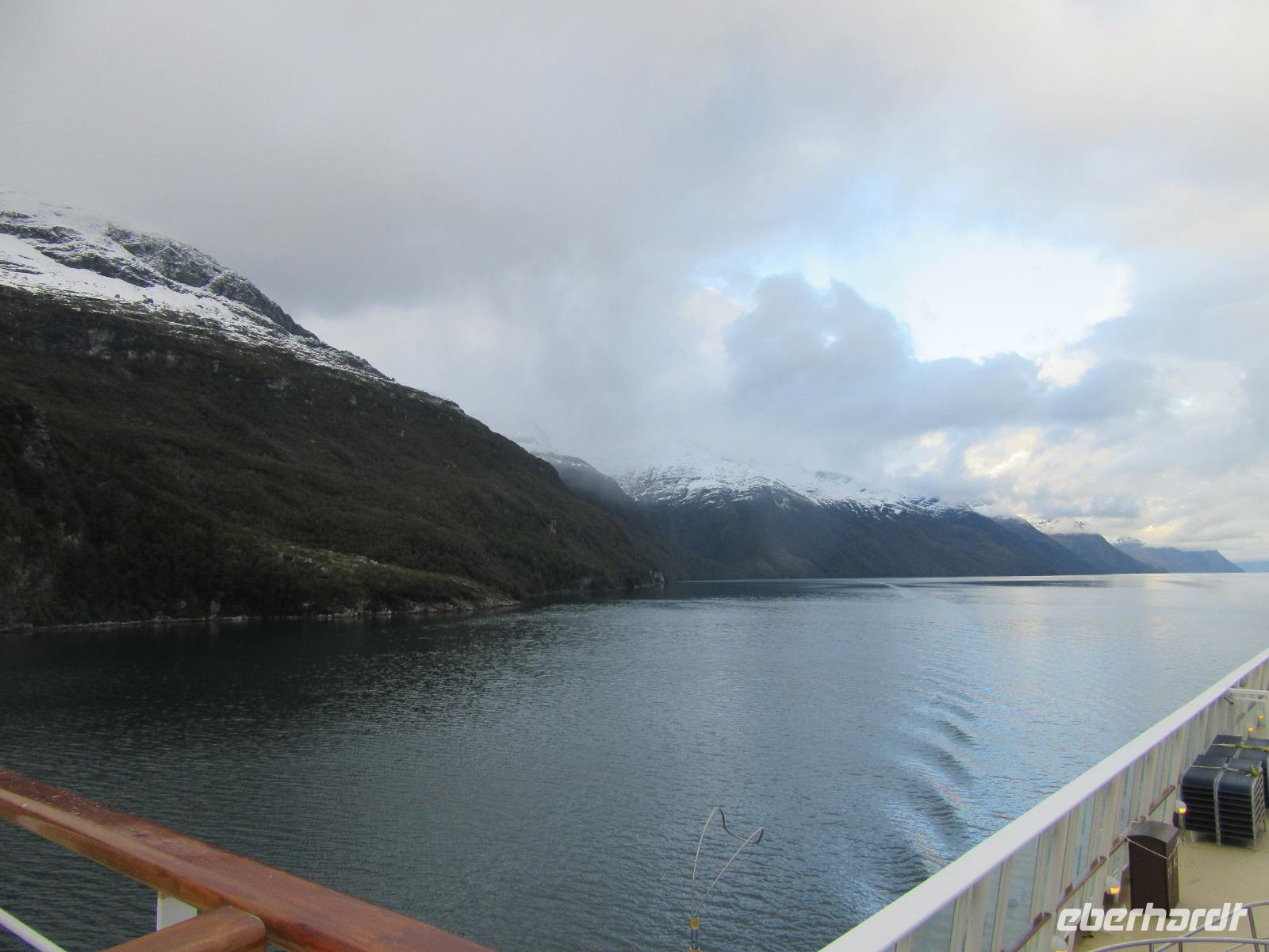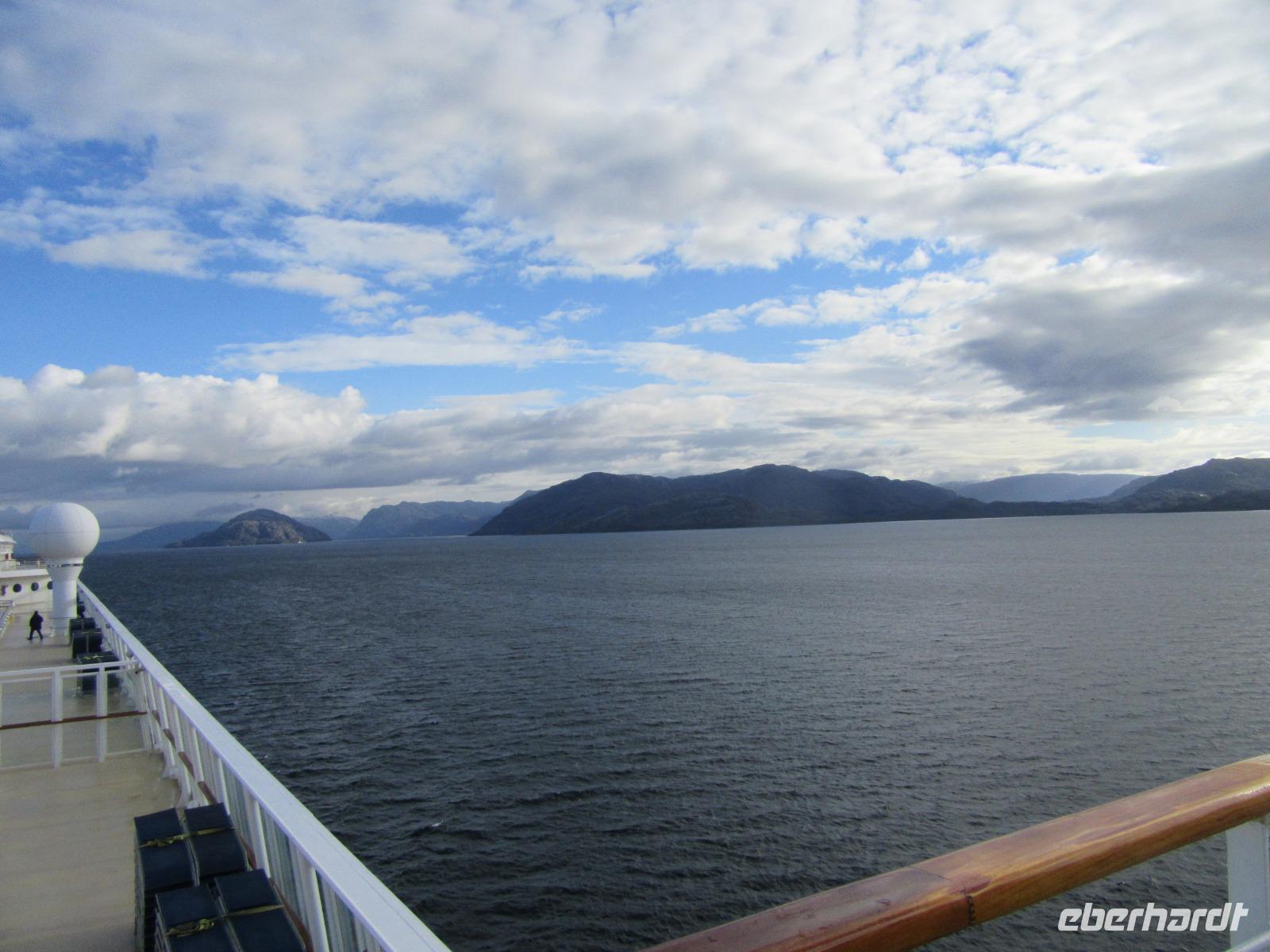 Heute konnten wir aufatmen: wir hatten eine ruhige Fahrt durch die Magellan-Straße und genossen unsere Fahrt durch die chilenischen Fjorde entlang der schneebedeckten Berge und vielen kleinen grünen Inseln. Trotz der Kälte genossen wir die frische Luft an Deck und nutzen die Zeit für tolle Fotoaufnahmen. Um 11 Uhr war ich dann wieder an der Rezeption und stand den Gästen für Fragen zur Verfügung. Wir saßen noch gemütlich an der Bar und tauschten uns ein wenig aus, bevor ich mit einigen Gästen zum Mittagessen verabredet war. Wir ließen uns ein leckeres Menü im A-la-Carte-Restaurant Seven Seas schmecken und schauten uns anschließend eine Flamenco-Show im Theater an. Der restliche Tag wurde ganz individuell gestaltet: sei es in der Sauna, im Whirlpool, an einer der Bars bei Live-Musik oder an der frischen Luft. Um 18.00 Uhr trafen wir uns schließlich zum täglichen gemeinsamen Abendessen und freuten uns auf ein weiteres köstliches 3-Gang-Menü. Nach dem Abendessen schaute ich mir mit einigen Gästen noch eine Musical-Cabaret-Show an und anschließend die Abschieds-Show der Beatles. In der Observation Lounge ließen wir dann - wie jeden Abend - den Tag bei einem leckeren Drink ausklingen - Cheers!