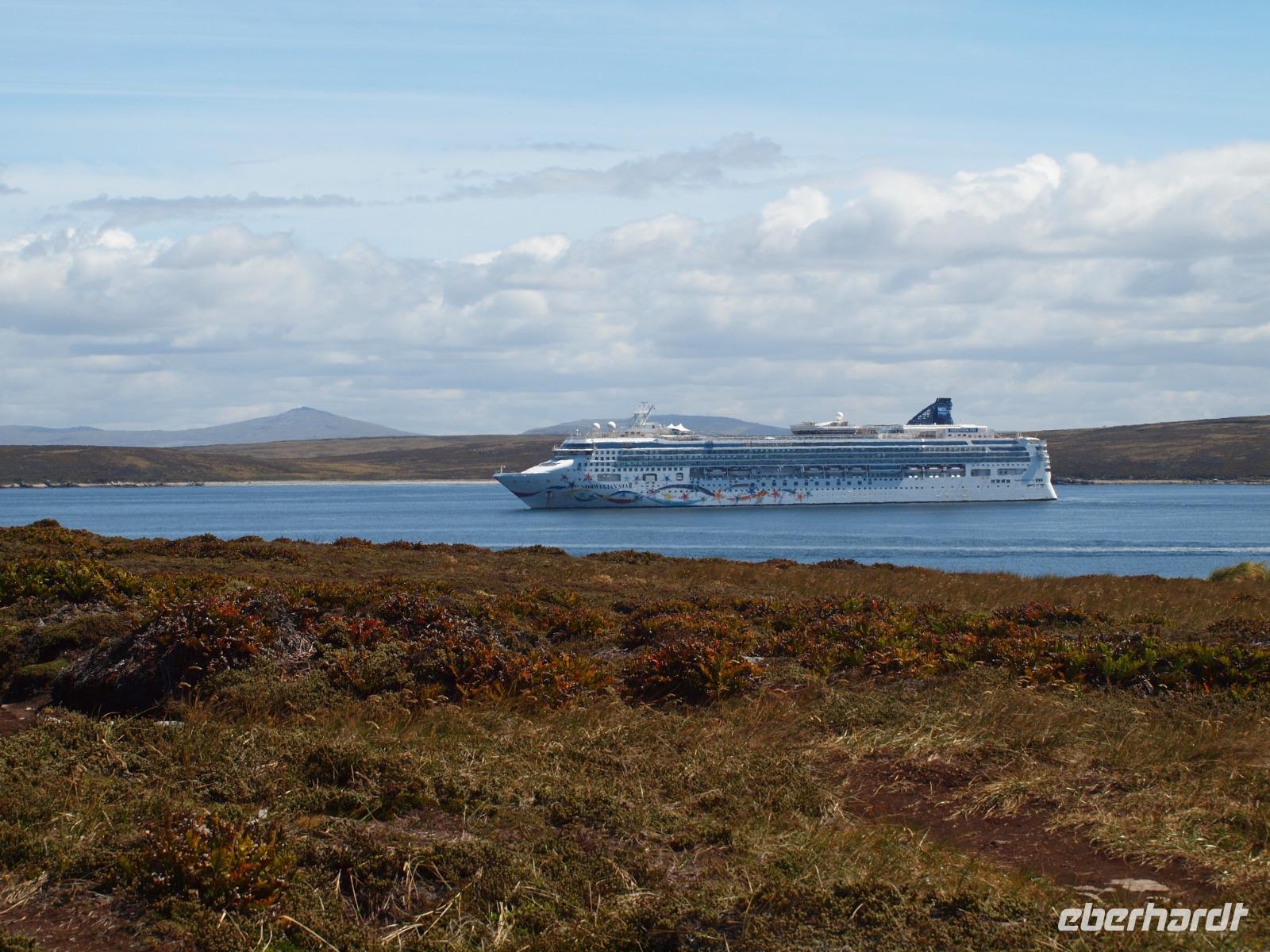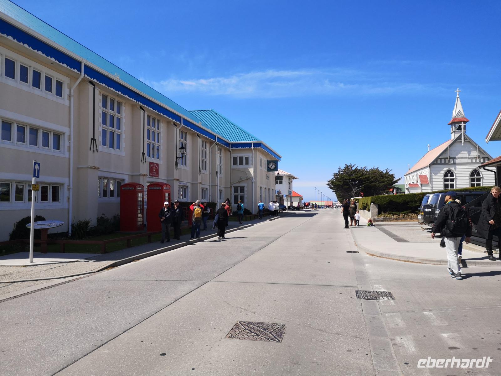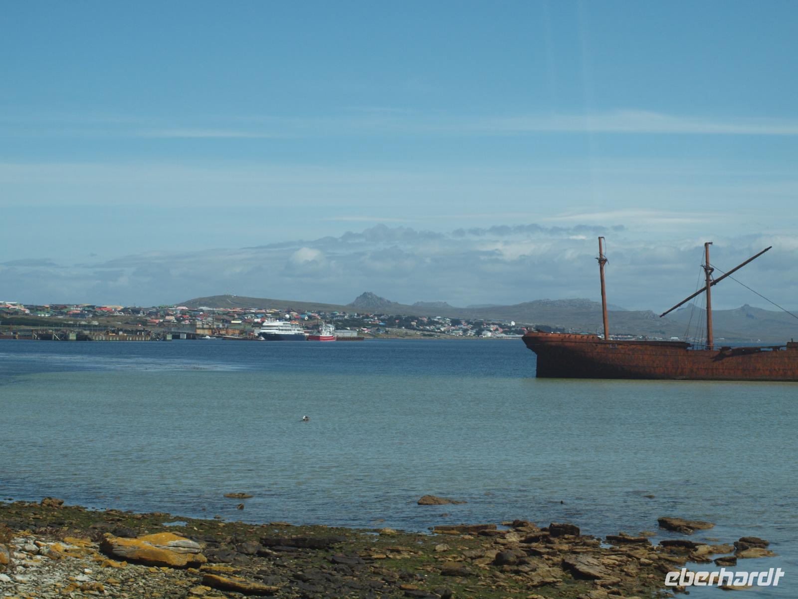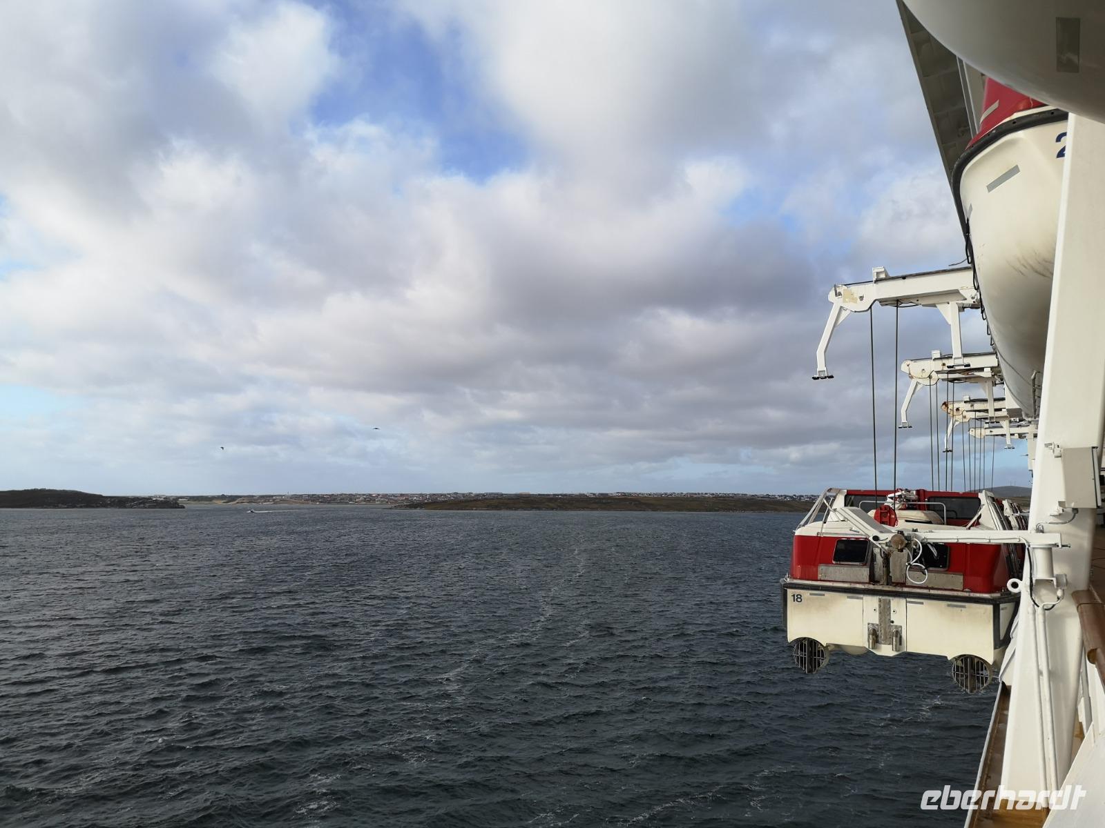 Da heute nicht alle von uns einen Ausflug über unser Schiff gebucht haben, unternehmen wir einen eigenen kleinen Ausflug. So versuchen wir gegen 11 Uhr von Bord zu gehen, was sich als etwas schwierig gestaltet, da die Fahrzeit mit den Tenderbooten nach Stanley wesentlich länger dauert, als bei den anderen Häfen. So stehen wir recht lange Schlange und endlich wieder Land unter unseren Füßen zu haben. Gleich am Hafen sehen wir schon die lebendigen Reklameschilder auf welchen „Gypsy Cove" zu lesen ist. Wir ergattern uns die Tickets und schlagen uns zum Bus durch. Die Transferzeit dauert etwa 15 Minuten. Bei schönstem Wetter erreichen wir die kleine Kolonie der Magellanpinguine. Ein kurzer Rundweg führt uns quasi an den Nestern der kleinen Frackträger vorbei, sogar einige Jungtiere sind zu erspähen. Zurück in Stanley schlendern wir noch etwas die Hafenstraße auf und ab, in einem gemütlichen Café kehren wir zum Ende hin noch ein und genießen einen warmen Kaffee und ein Stück Kuchen - richtig lecker! Auf dem Weg zurück zum Hafen sehen wir schon von weitem die lange Schlange - na dann stellen wir uns mal an um auf unser schwimmendes Hotel zurück zu kommen.