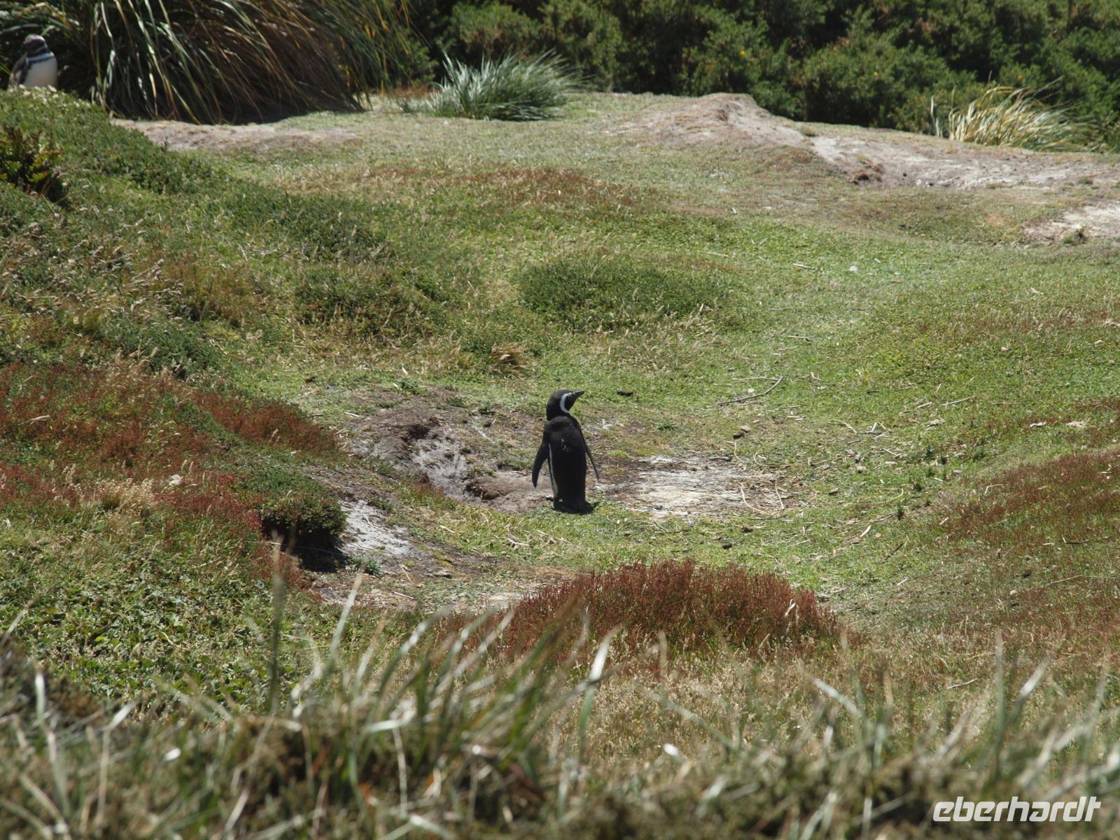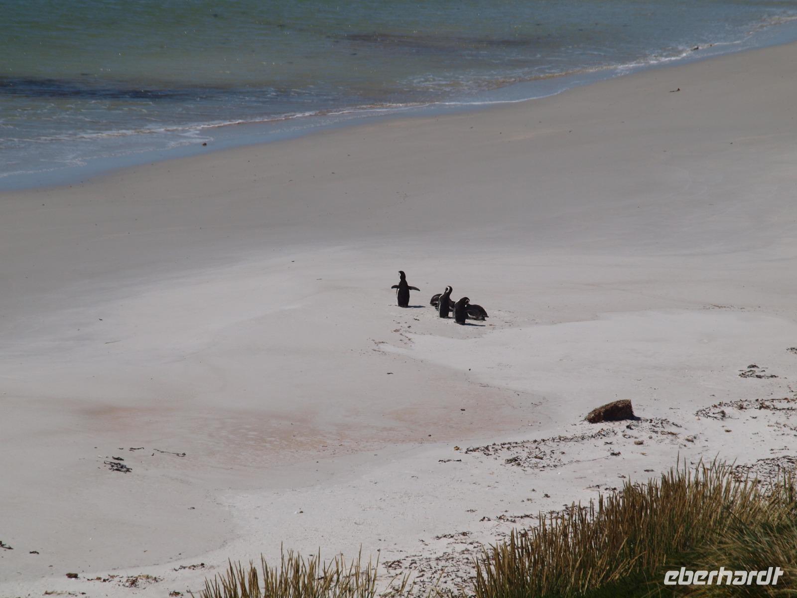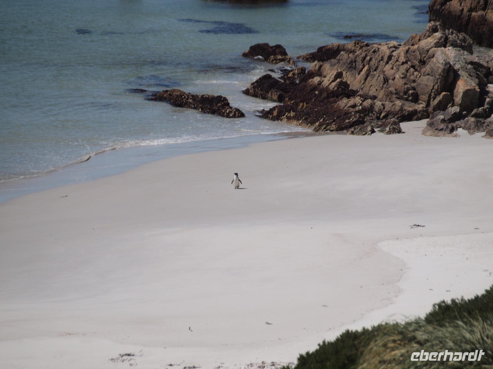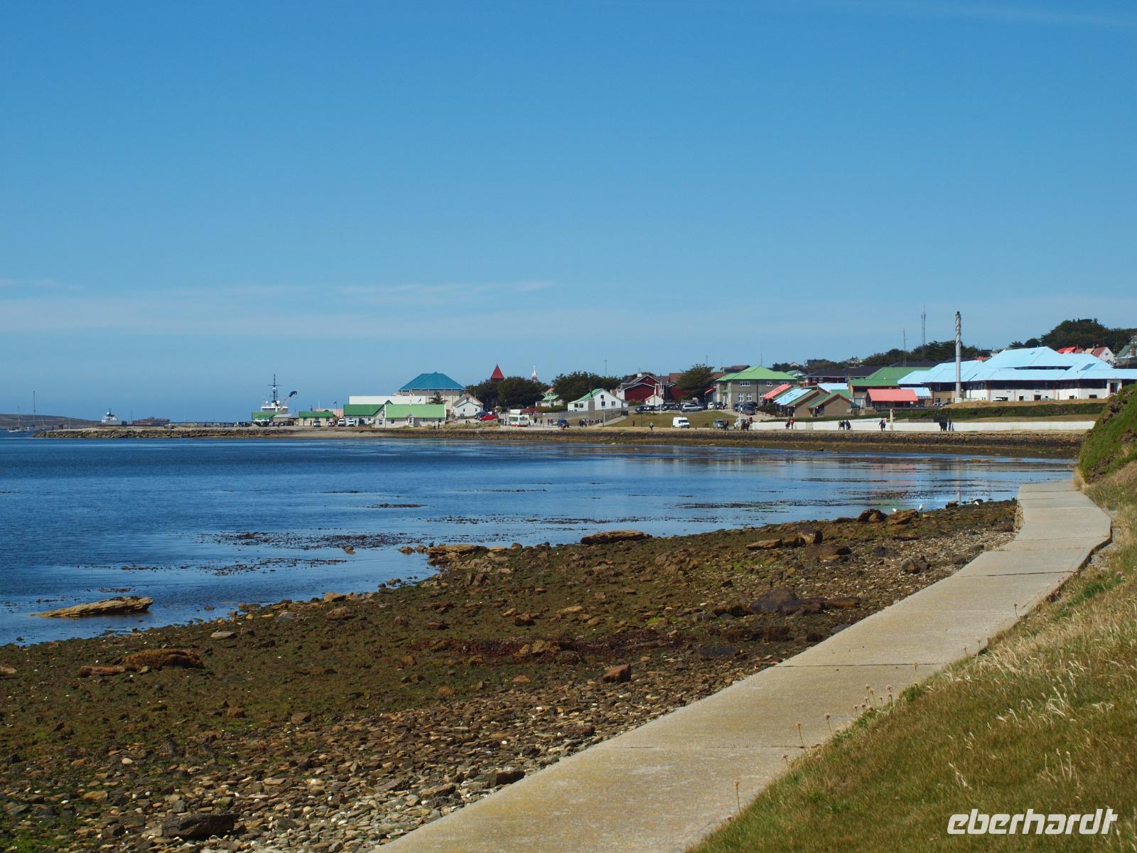 Da heute nicht alle von uns einen Ausflug über unser Schiff gebucht haben, unternehmen wir einen eigenen kleinen Ausflug. So versuchen wir gegen 11 Uhr von Bord zu gehen, was sich als etwas schwierig gestaltet, da die Fahrzeit mit den Tenderbooten nach Stanley wesentlich länger dauert, als bei den anderen Häfen. So stehen wir recht lange Schlange und endlich wieder Land unter unseren Füßen zu haben. Gleich am Hafen sehen wir schon die lebendigen Reklameschilder auf welchen „Gypsy Cove" zu lesen ist. Wir ergattern uns die Tickets und schlagen uns zum Bus durch. Die Transferzeit dauert etwa 15 Minuten. Bei schönstem Wetter erreichen wir die kleine Kolonie der Magellanpinguine. Ein kurzer Rundweg führt uns quasi an den Nestern der kleinen Frackträger vorbei, sogar einige Jungtiere sind zu erspähen. Zurück in Stanley schlendern wir noch etwas die Hafenstraße auf und ab, in einem gemütlichen Café kehren wir zum Ende hin noch ein und genießen einen warmen Kaffee und ein Stück Kuchen - richtig lecker! Auf dem Weg zurück zum Hafen sehen wir schon von weitem die lange Schlange - na dann stellen wir uns mal an um auf unser schwimmendes Hotel zurück zu kommen.