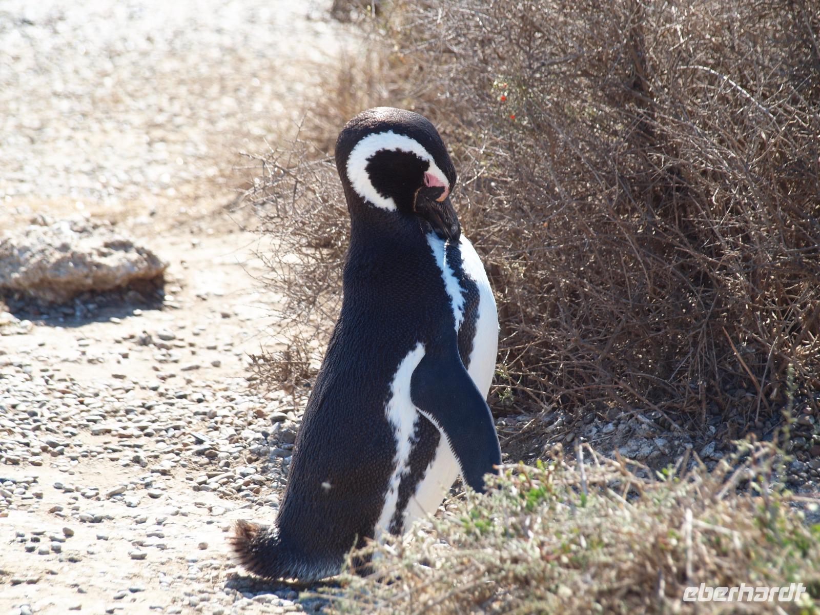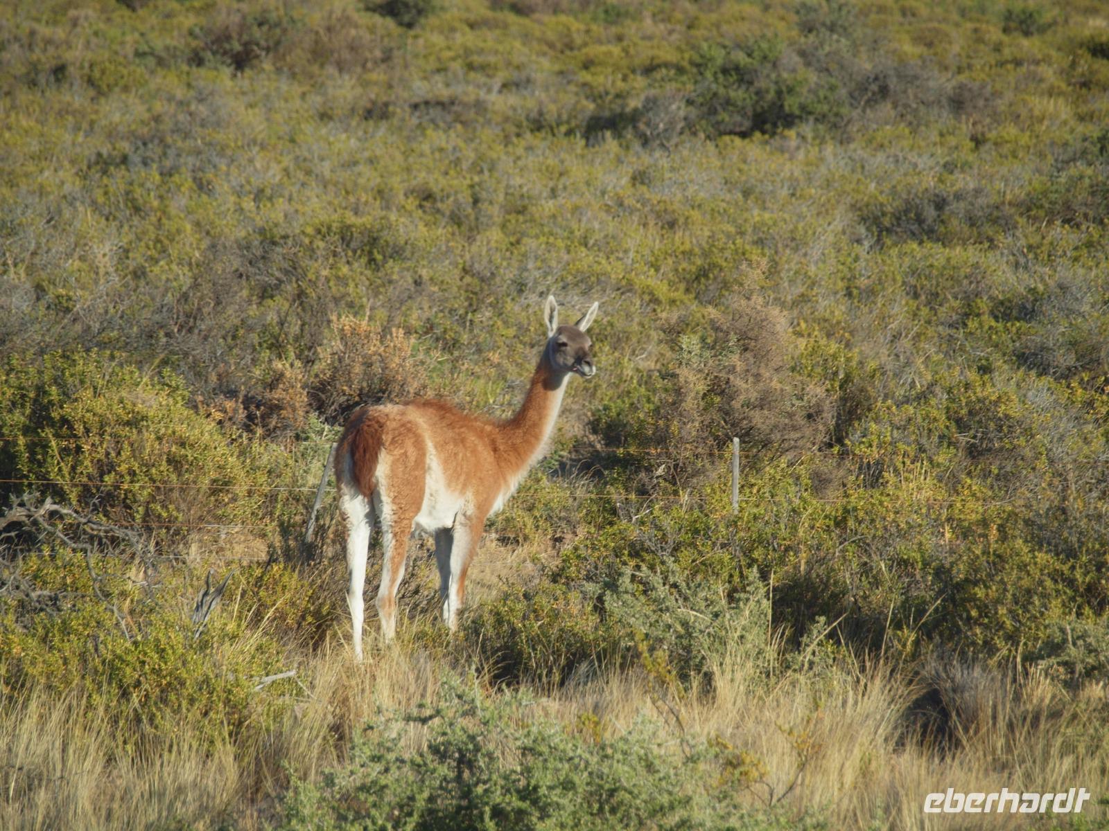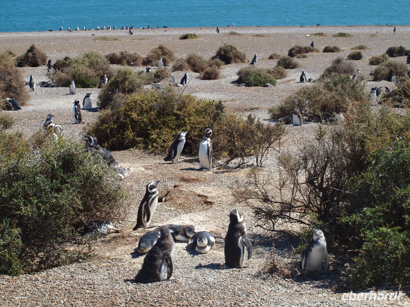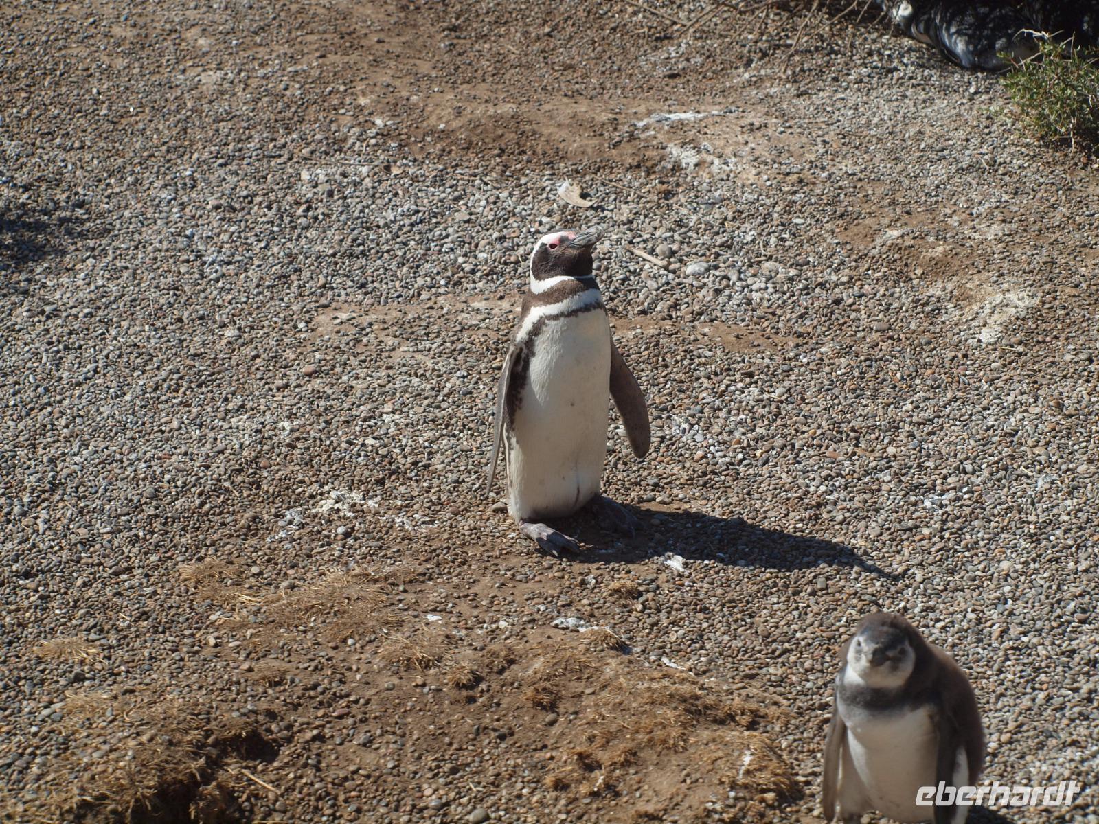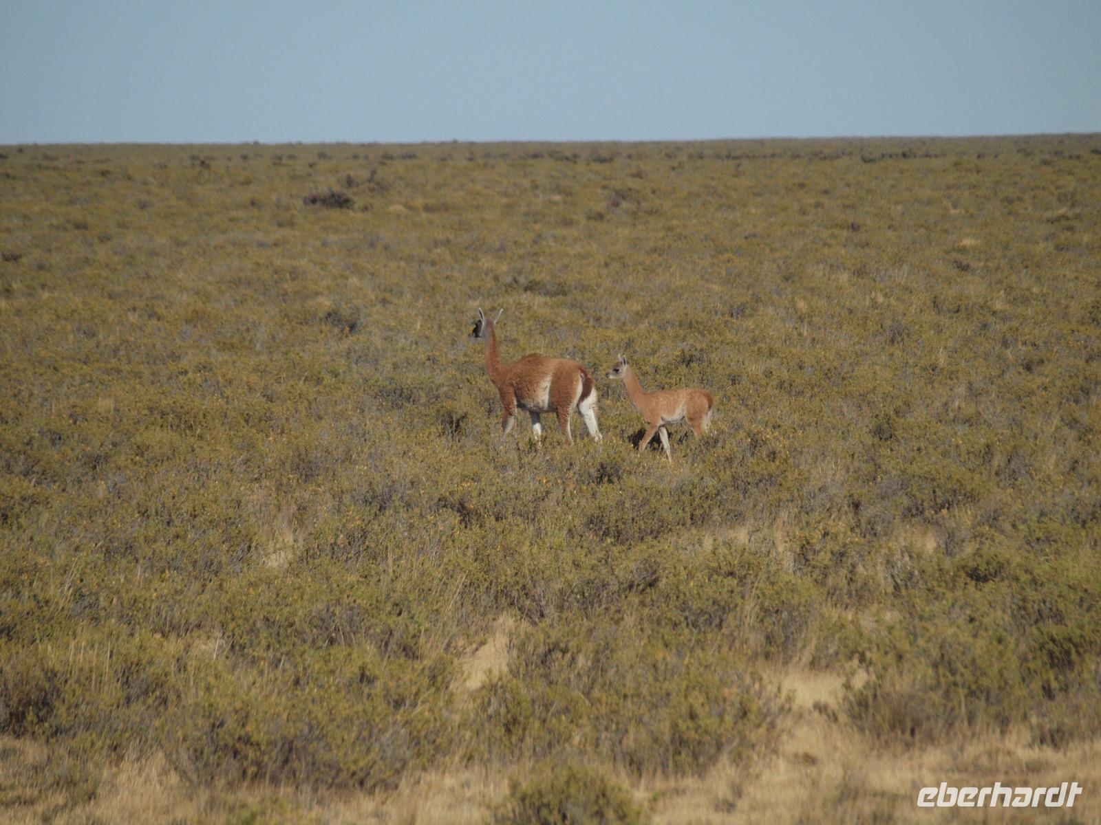Nach einem sehr frühen Frühstück an Bord, stehen wir pünktlich zum Verlassen des Schiffes bereit. An Land wartet bereits unsere Reiseleiterin Vanessa auf uns und wir gehen gemeinsam den Pier entlang, bis zum Bus. Gemeinsam fahren wir hinaus aus der Stadt und auf die Halbinsel Valdes. Bevor wir die feste geteerte Straße verlassen, stoppen wir noch am Besucherzentrum und schlendern durch den kleinen Laden, sowie die kleine Ausstellung über Wale, inklusive Skelett eines Glattwales. Weiter geht es quasi querfeldein, über unbefestigte Straßen immer weiter Richtung Norden nach San Lorenzo. Wir haben heute besonders viel Glück und sehen während der Fahrt schon sehr viele Tiere, nicht zuletzt dank der scharfen Augen unseres Fahrers. Zuerst entdecken wir im Gebüsch die Riesenmeerschweinchen, Nara genannt, etwas später, zwischen den Merinoschafen auch noch Guanacos, aus der Familie der Lamas. Besonders selten sieht man wohl den kleinen grauen Fuchs und die tagaktiven Eulen, die in Erdhöhlen wohnen... Naja, was sollen wir sagen, Glück gehabt? Wenig später erreichen wir dann das Anwesen San Lorenzo, dort steigen wir dann in einen schmaleren Truck und fahren zur Kolonie, schon auf dem Weg dorthin beginnt das Pinguingebiet und dicht neben der Straße sehen wir die kleinen schwarzweißen Frackträger. Wir unternehmen einen ausgiebigen Spaziergang durch die Kolonie. Immer wieder kreuzen sich die Wege und hier gilt besonders eine Regel: Pinguine haben Vorfahrt!