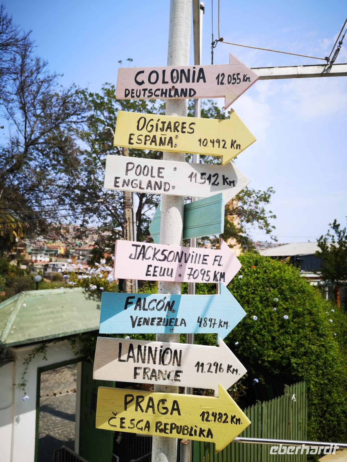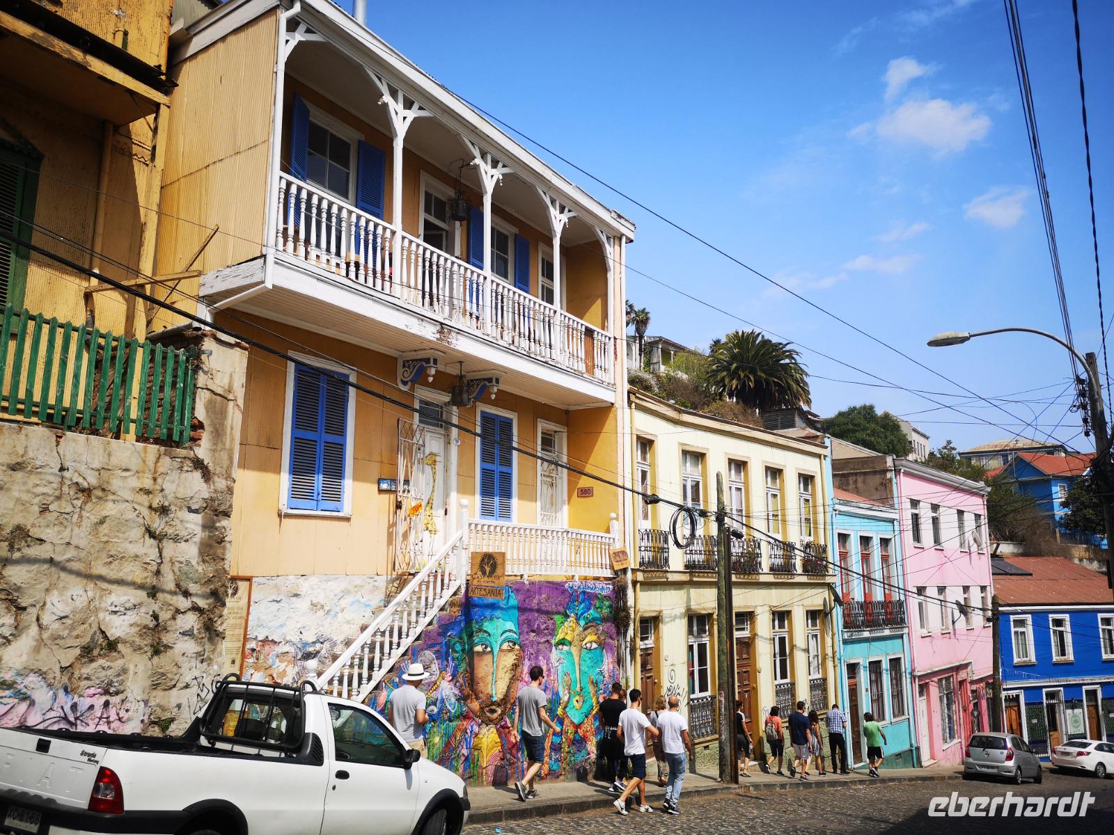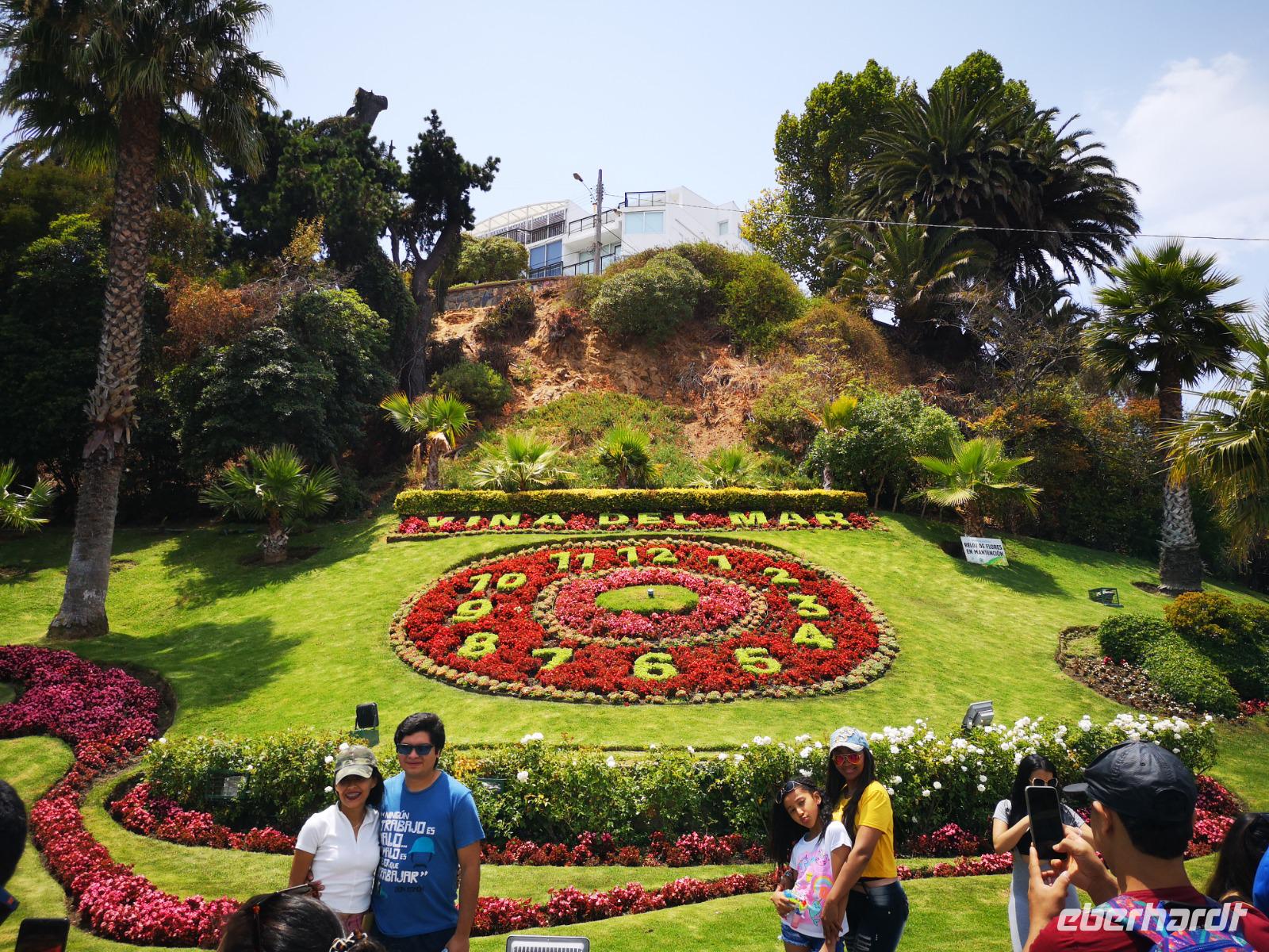 Nach dem Frühstück treffen wir uns mit unseren Koffern für die Abfahrt in der Lobby, schnell noch die letzten Kofferanhänger angetackert und schon fahren wir wieder los. Über die Autobahn, vorbei an einer kleinen Raststätte mit Wildtiergehege und kleinen Kostproben, erreichen wir schließlich die Hafenstadt Valparaiso. Christian bringt uns sicher auf einen der Hügel, die die Stadt umgeben. Der Happy-Hill, einst von den Engländern besiedelt, ist heute ein beliebter Ort für Touristen und bietet uns einen tollen Ausblick über die Hafenstadt. Ein Stück gehen wir zu Fuß durch die bunten Gassen, die Häuserwände sind hübsch bemalt, mit Bildern, Szenen aus dem Alltag und vielem mehr. Zum Schluss fahren wir den Hügel mit einer alten Zahnradbahn wieder hinunter und gelangen zum großen Hauptplatz vor dem Rathaus. Es wird nun Zeit unsere Reise weiter nach San Antonio fortzusetzen. Einen kurzen Stopp noch an der Blumenuhr in Vina del Mar und dann weiter zum Hafen.