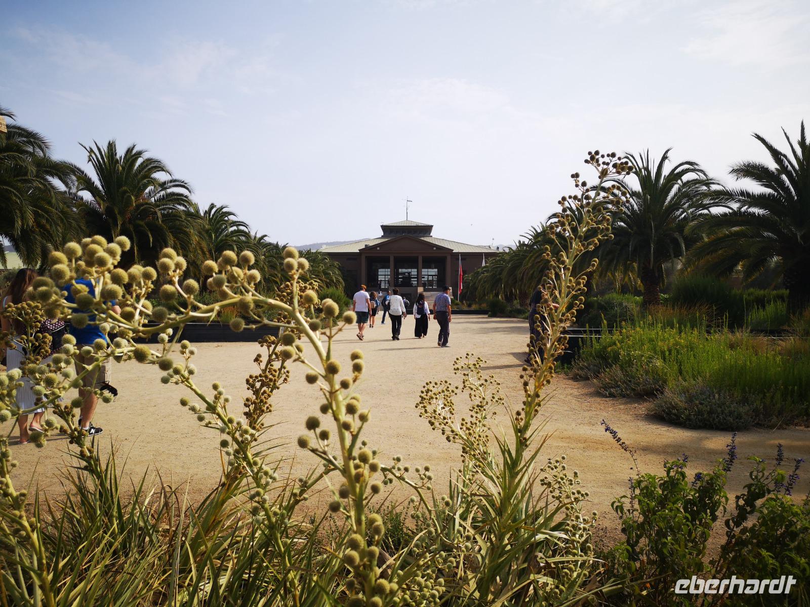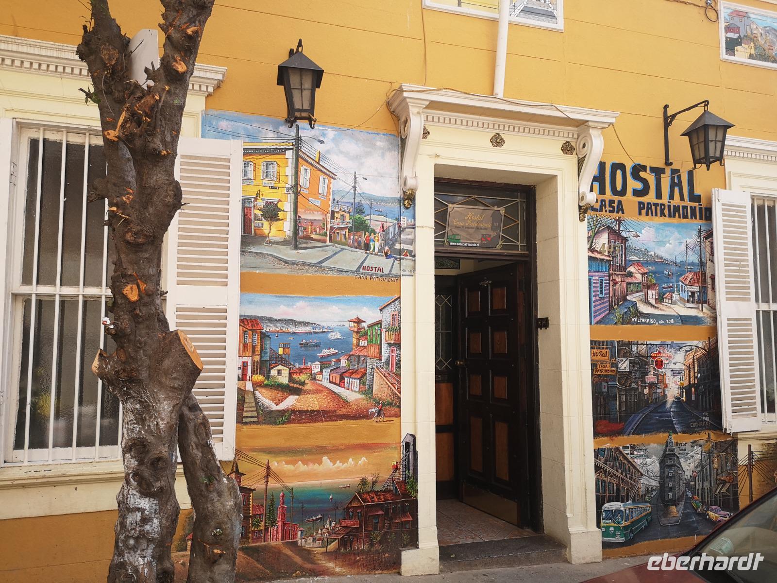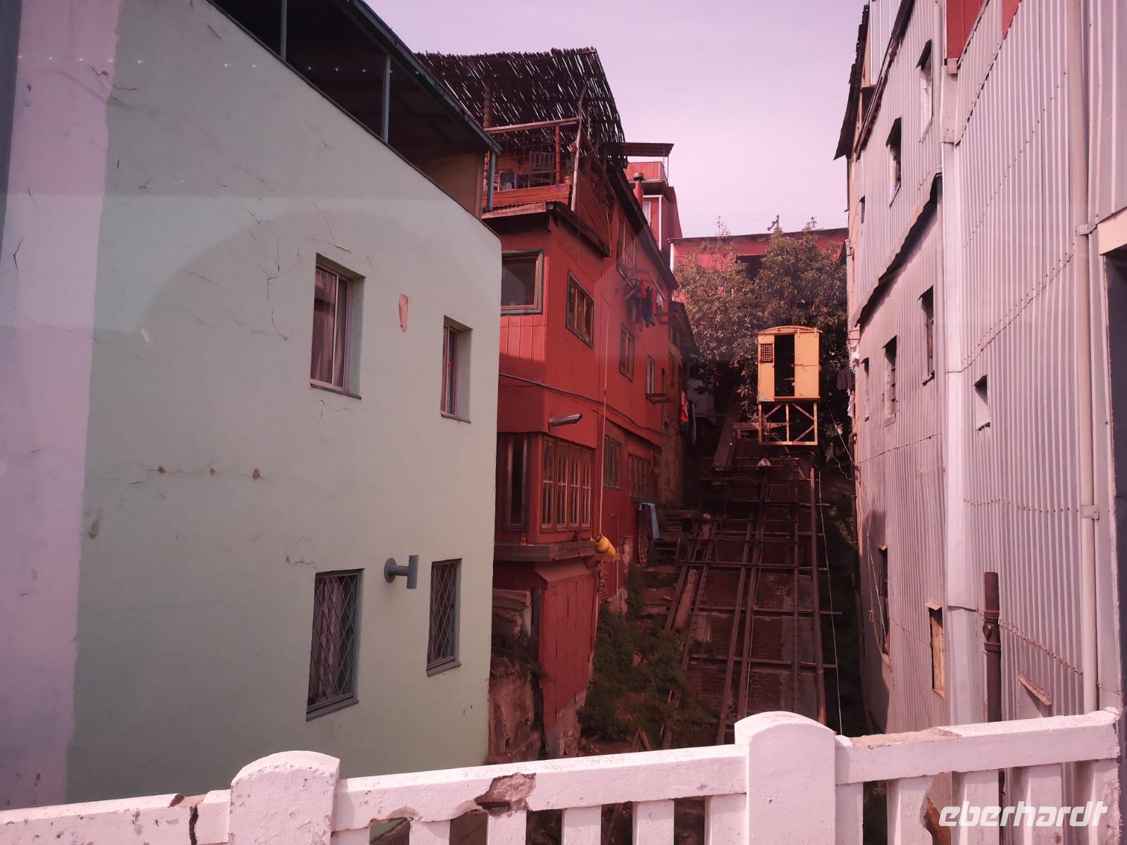 Nach dem Frühstück treffen wir uns mit unseren Koffern für die Abfahrt in der Lobby, schnell noch die letzten Kofferanhänger angetackert und schon fahren wir wieder los. Über die Autobahn, vorbei an einer kleinen Raststätte mit Wildtiergehege und kleinen Kostproben, erreichen wir schließlich die Hafenstadt Valparaiso. Christian bringt uns sicher auf einen der Hügel, die die Stadt umgeben. Der Happy-Hill, einst von den Engländern besiedelt, ist heute ein beliebter Ort für Touristen und bietet uns einen tollen Ausblick über die Hafenstadt. Ein Stück gehen wir zu Fuß durch die bunten Gassen, die Häuserwände sind hübsch bemalt, mit Bildern, Szenen aus dem Alltag und vielem mehr. Zum Schluss fahren wir den Hügel mit einer alten Zahnradbahn wieder hinunter und gelangen zum großen Hauptplatz vor dem Rathaus. Es wird nun Zeit unsere Reise weiter nach San Antonio fortzusetzen. Einen kurzen Stopp noch an der Blumenuhr in Vina del Mar und dann weiter zum Hafen.