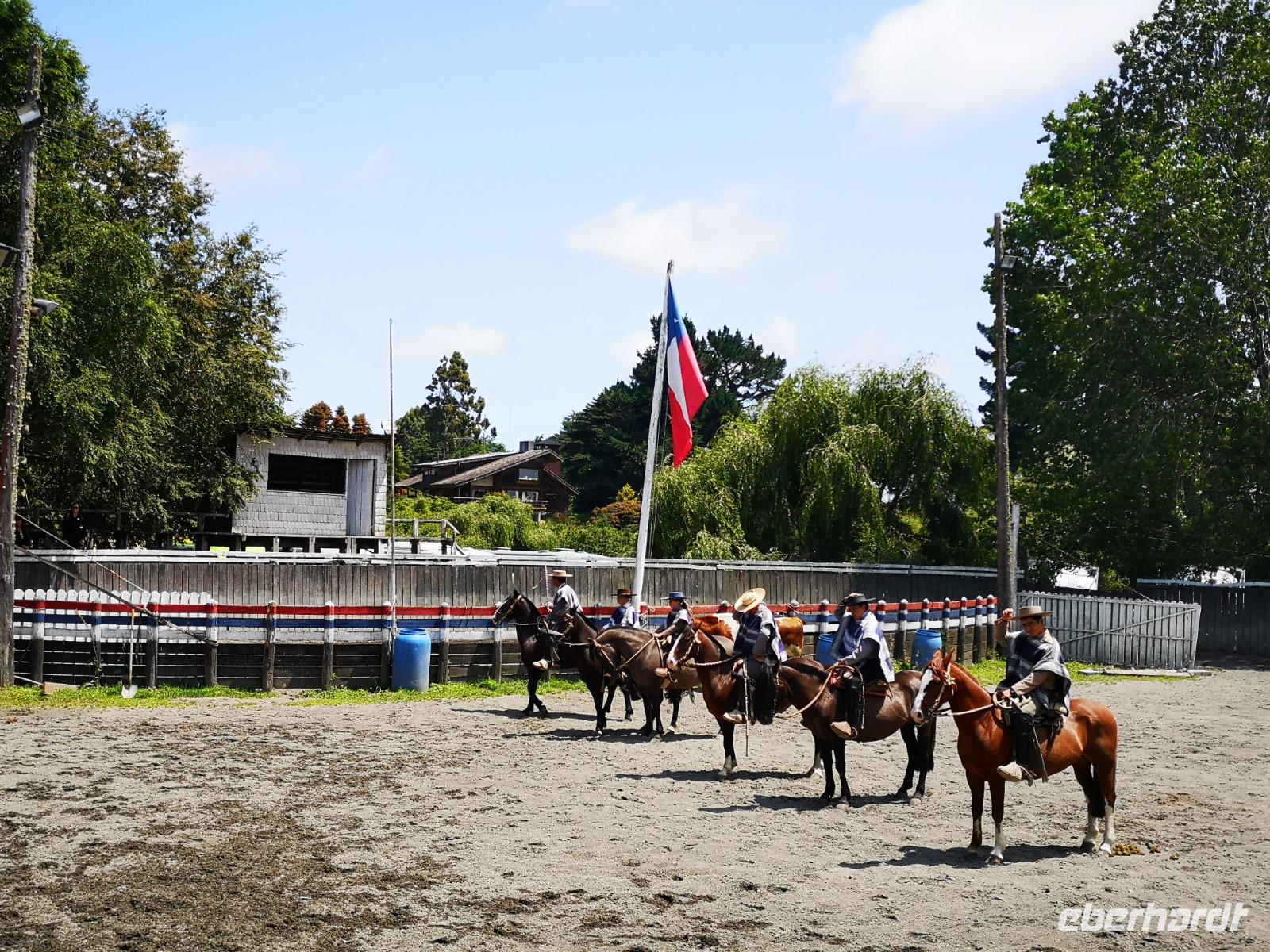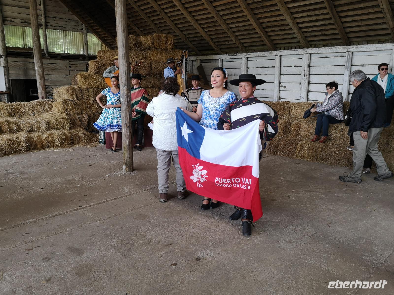 Unser erster Hafen den wir auf unserer Kreuzfahrt anfahren ist Puerto Montt in Chile. Alle von uns haben heute einen Ausflug gebucht, die Meisten sind mit mir unterwegs. Nach dem Frühstück treffen wir uns alle im Stardust Theater und werden dann zu gegebener Zeit aufgerufen um das Schiff über die Tenderboote zu verlassen, auch das ist wieder eine ganz neue Erfahrung für einige. Wir sind schließlich wieder an Land angekommen und werden am Bus von unserer Reiseleiterin Katja empfangen. Sie wird uns heute den Tag lang begleiten und uns mit Informationen über das Leben hier füttern. Wir fahren zuerst nach Puerto Varas, einem Ort etwas nördlich von Puerto Montt, und halten wir für eine Weile. Wir können gemütlich an der Uferpromenade entlang schlendern, einen Blick in Richtung Vulkane am anderen Ende des Sees werfen, welche jetzt noch leider ihren Kopf in den Wolken haben. Schließlich fahren wir weiter zu einer Ranch, hier werden uns während einer Folkloreshow noch einmal der Tango, die Kleidung, sowohl die der Tänzer, als auch die der Huasos und die Besonderheiten der chilenischen Pferde erklärt. Wir werden sogar durch die Farm selbst etwas geführt, einmal quer durch den Pferdestall, mit vielen wunderschönen Tieren, bis zur eigenen Arena. Hier zeigen uns die Huasos bei einigen Geschicklichkeitsübungen nun endlich was sie können. Eine tolle Show! Und bei dieser ganzen Aufregung verziehen sich sogar die letzten Wolken am Himmel und wir haben von der Farm aus einen perfekten Blick auf einen der Vulkane, den Calbuco, einfach fantastisch! Um den Ausflug perfekt noch abzurunden werden wir noch ins Festzelt geladen zu einem kulinarischen und kulturellen Abschluss. Danach müssen wir uns schon wieder auf den Weg zu unserem schwimmenden Hotel machen, dieses wartet ja nur sehr ungern... Just in time, kann man sagen, erreichen wir den Hafen, tendern zurück an Bord und dann legen wir auch schon ab. Eine tolle Sicht auf die beiden Vulkane haben wir auch noch einmal beim Verlassen des Hafens. Am Abend finden wir uns wieder zusammen, essen gemeinsam zu Abend und sehen uns später die Show im Theater wieder an. Ein ereignisvoller Tag geht zu Ende und wir haben viele tolle Erlebnisse als Erinnerung.