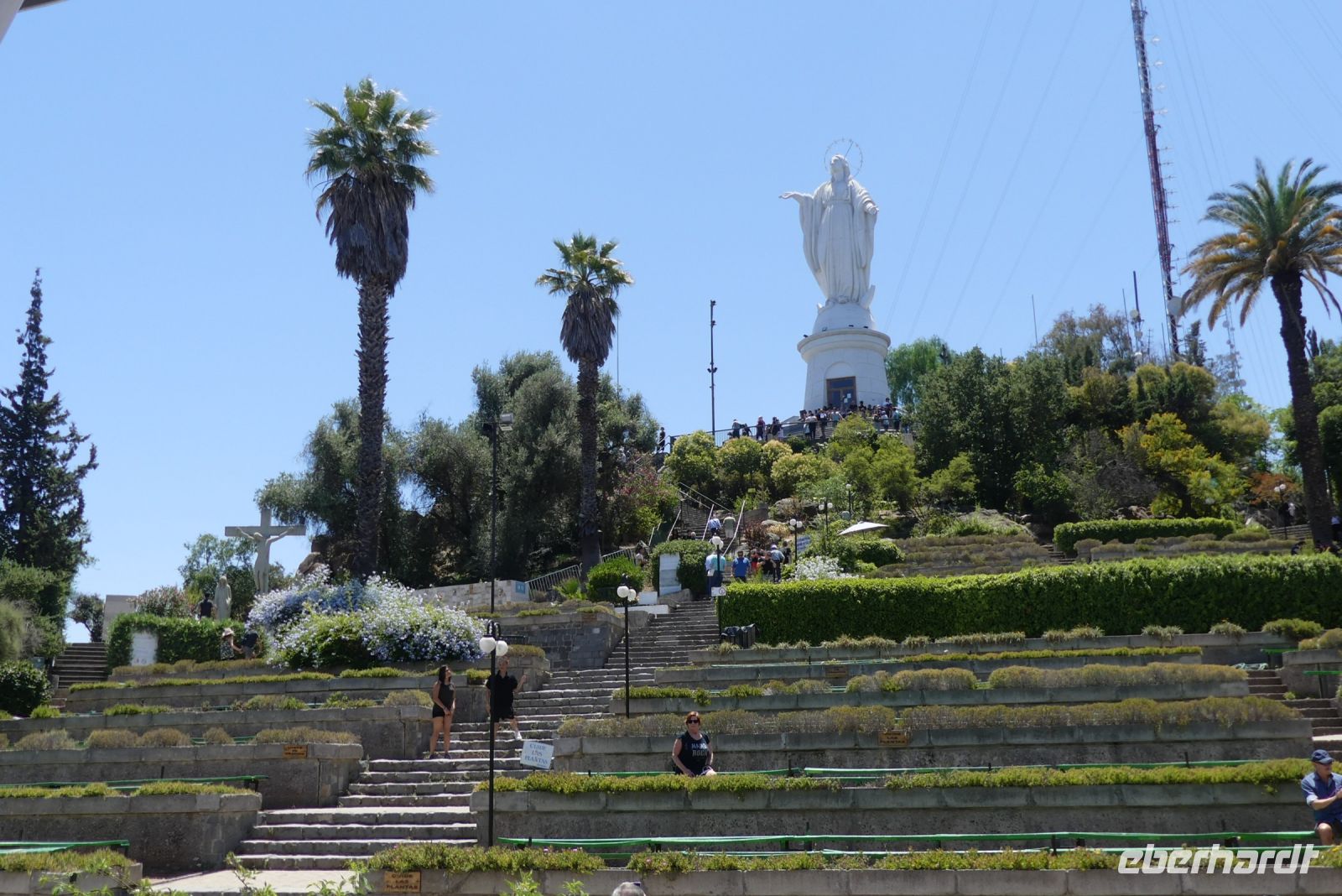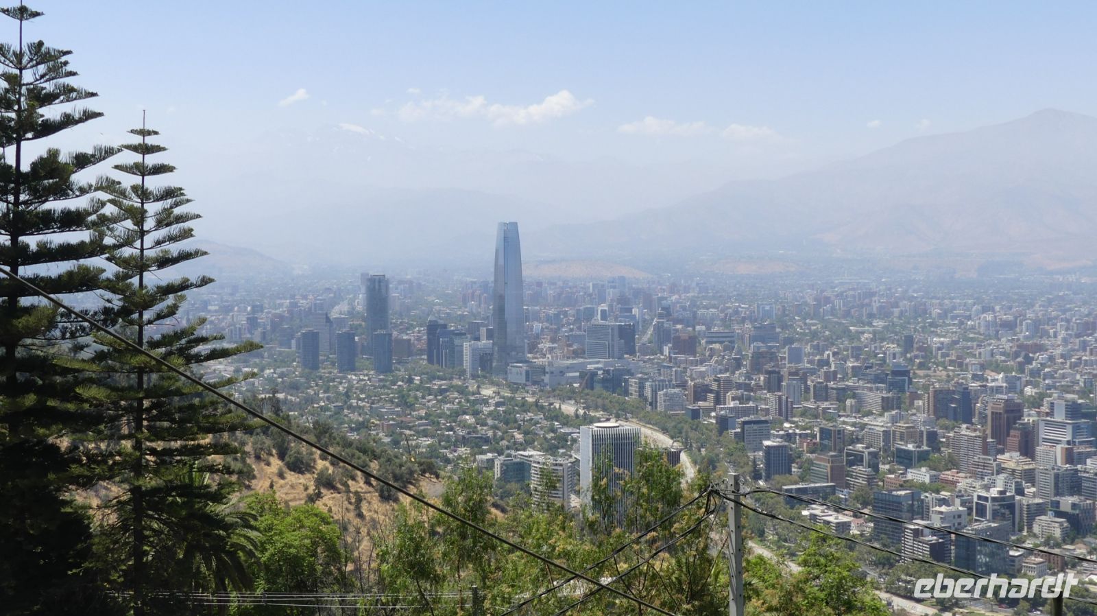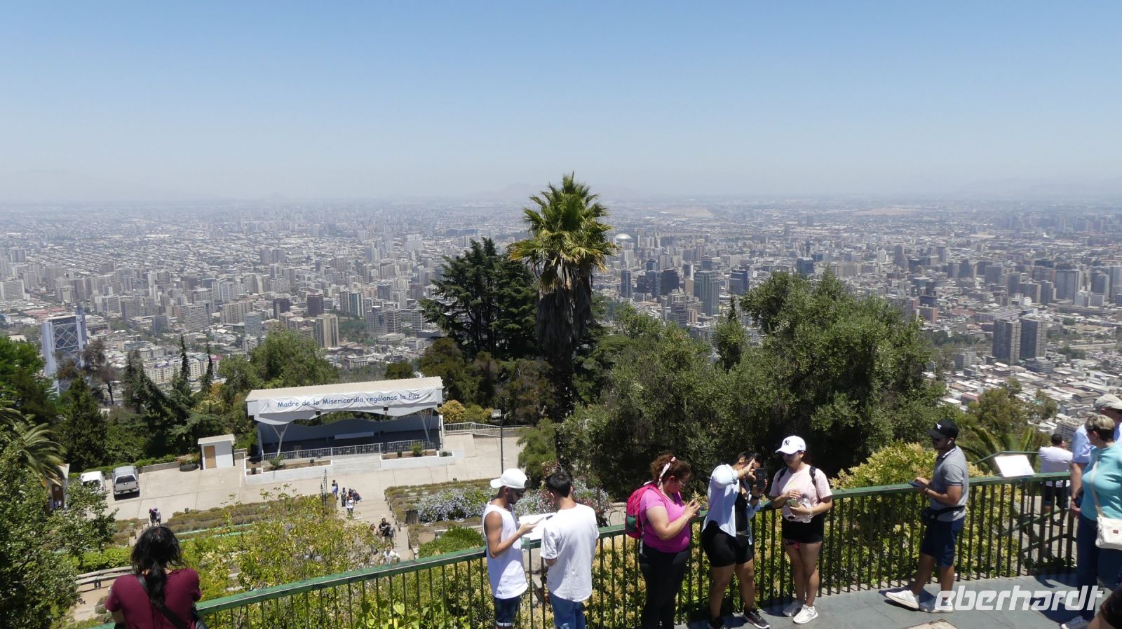 Kurz vor der Landung haben wir einen interessanten Flug über die zum Teil Schnee bedeckten Anden. Nachdem die Einreiseformalitäten erledigt sind, empfängt uns unsere örtliche Reiseleiterin Veronica. Es ist Sommer und wir können unsere warme Kleidung ablegen. Nach einem Zwischenstopp im Hotel fahren wir mit einer Kabinenbahn auf den Berg San Cristobal. Auf seinem Gipfel befindet sich eine Statue der Schutzpatronin Maria. Gleichzeitig bietet der Gipfel eine tolle Aussicht auf die chilenische Hauptstadt. Das vielleicht markanteste Gebäude, welches man von hier sehen kann ist der Sky Costanera Wolkenkratzer (Gran Torre des Santiago), mit 305 Meter das höchste Gebäude in Südamerika. Für den Abstieg von San Cristobal nehmen wir zur Abwechslung die Kabelbahn. Wir kommen in das Szeneviertel Bellavista mit zahlreichen Bars und Restaurants. Im Los Buenos Muchachos Restaurant machen wir eine Mittagspause.
