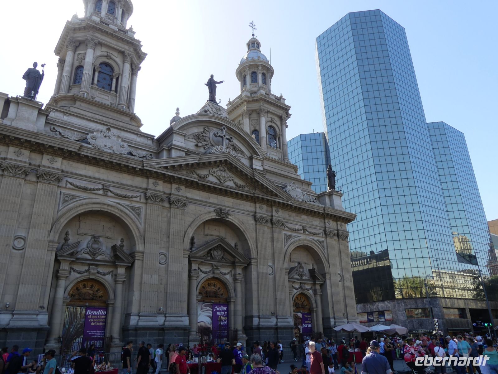 Am Nachmittag halten wir noch am zum zentralen Platz, dem Plaza de Armas. Dieser wird von der mächtigen Kathedrale geprägt. Im Brunnen baden Kinder, schließlich sind es über 30 Grad. Noch ein Blick aus dem Bus auf den chilenischen Regierungssitz „La Moneda“. Früher befand sich in diesem Gebäude die Münzprägestätte, was den Namen des Regierungssitzes erklärt. Nicht weit von hier befindet sich unser Hotel Plaza San Francisco, wo wir uns etwas von der anstrengenden Anreise erholen können. Wer mag, schaut sich noch etwas im Umfeld um, läuft zu La Moneda oder besucht die San Francisco Kirche gleich nebenan, welche die älteste der Stadt ist. So wie wir es im Sommer kennen, geht die Sonne spät unter, bis ca. 21.00 Uhr ist es noch hell.