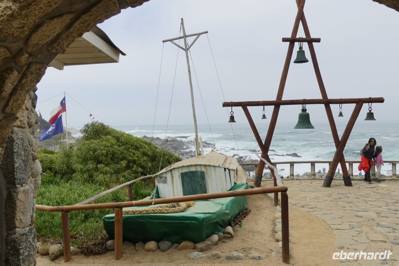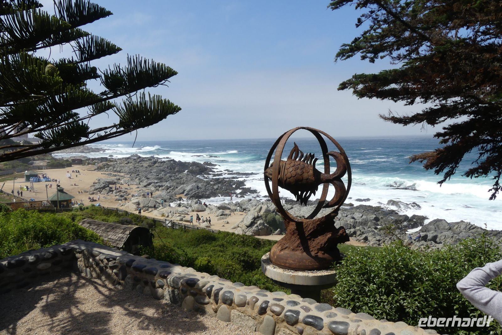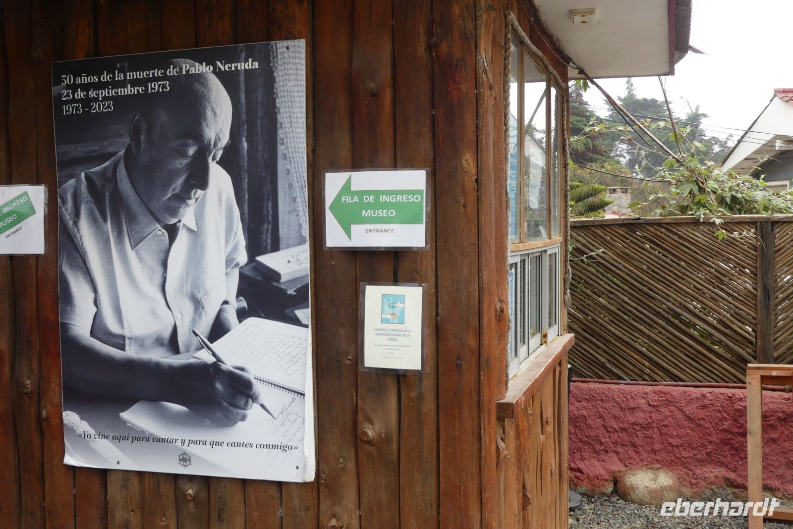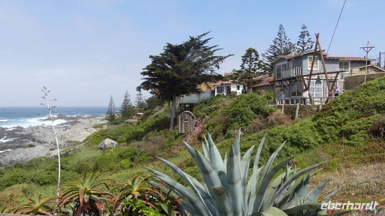 Richtung Pazifik durchfahren wir einen 3 Kilometer langen Tunnel durch das Küstengebirge, welche uns ins Curacavi-Tal führt. Hier ist die Landschaft auf einen Schlag viel grüner. Es wird viel Obst und Gemüse angebaut, von Erdbeeren, Kirschen, Avocados, Zitrusfrüchten, Mandeln bis Mais und Oliven. Auch im anschließenden Tal, dem Casablanca Tal, überwiegt das Grün, hier werden vor allem Weißweine kultiviert. Wir nähern uns dem Pazifik und die Sonne wird nach und nach vom typischen Küstennebel verdeckt. Unser erstes Ziel ist der Ferienort Isla Negra, wo wir das frühere Haus von Pablo Neruda besichtigen wollen. Wir haben dieses Museum als Überraschung zusätzlich ins Programm genommen. „Museum“ klingt langweilig, das ist es in diesem Fall aber ganz und gar nicht. Denn die Kombination aus der einer idyllischen Lage des Hauses am Meer, interessanten Ausstattungsdetails und kurzweiligen Informationen per Audioguide zum Leben des machen diesen Besuch zu einem tollen Erlebnis.