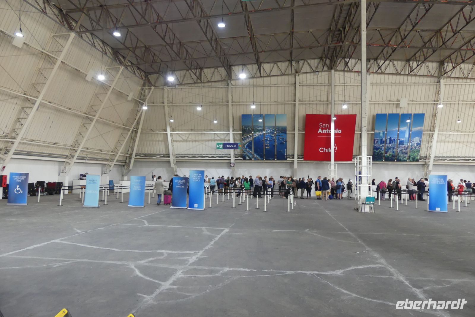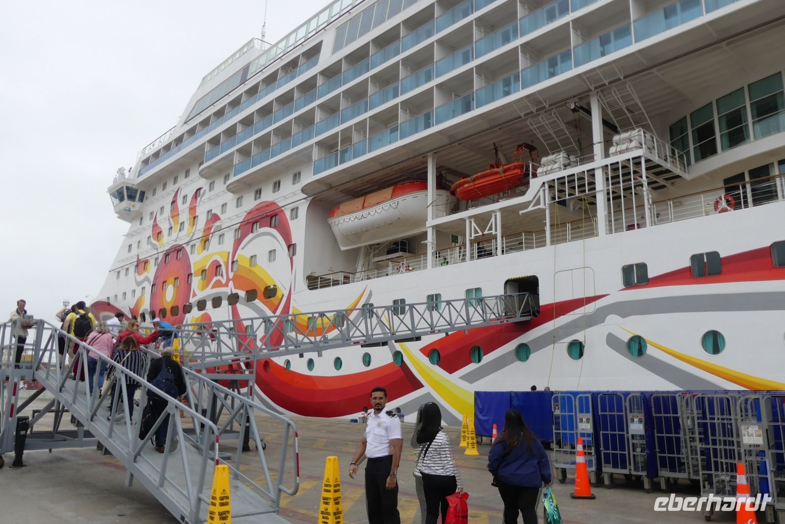 Am Nachmittag erreichen wir schließlich den Hafen von San Antonio. Wir verabschieden uns von der lieben Veronica und Busfahrer Fernando. Das Einchecken bei NCL dauert etwas, weil das Schiff am Vormittag später als geplant angekommen ist. Unseren Reisepass tauschen wir gegen die Bordkarte ein, mit der wir nun an Bord gehen können. Nun muss man sich erst einmal orientieren, den Sammelpunkt für den Notfall aufsuchen und die Kabine finden.