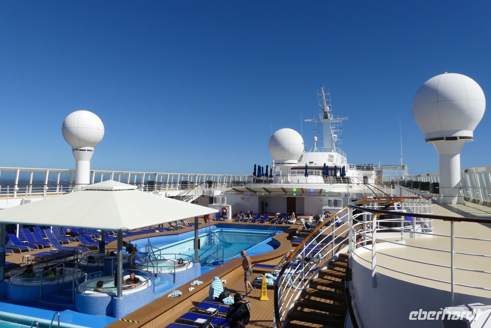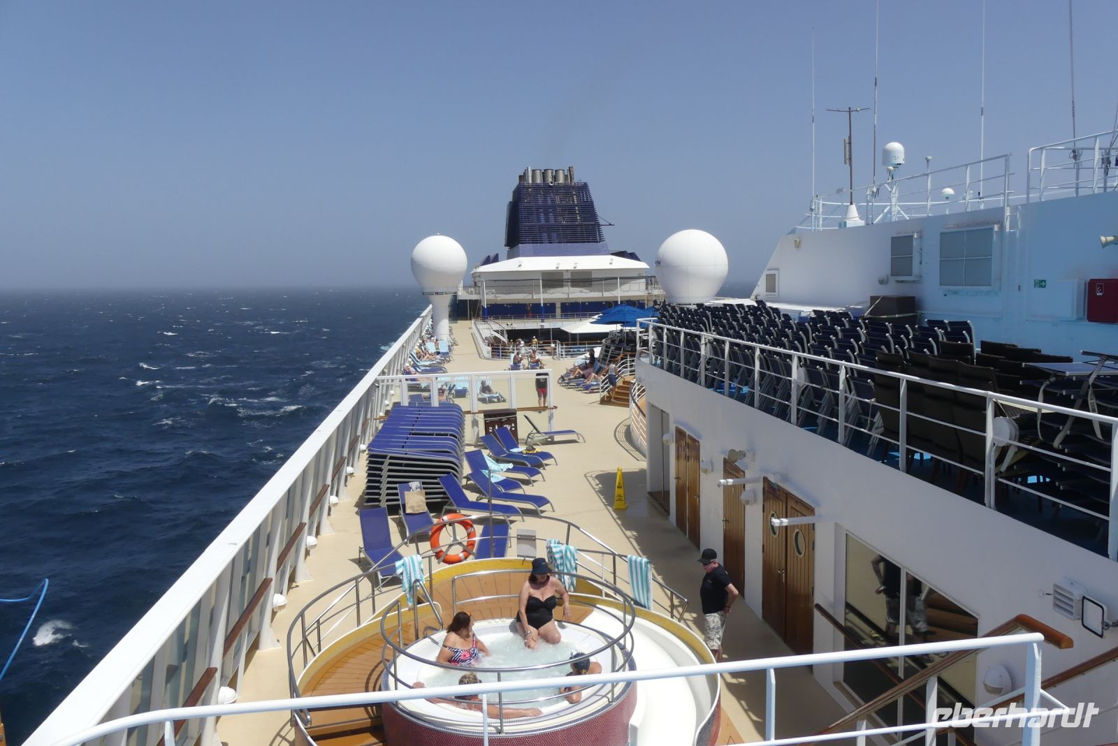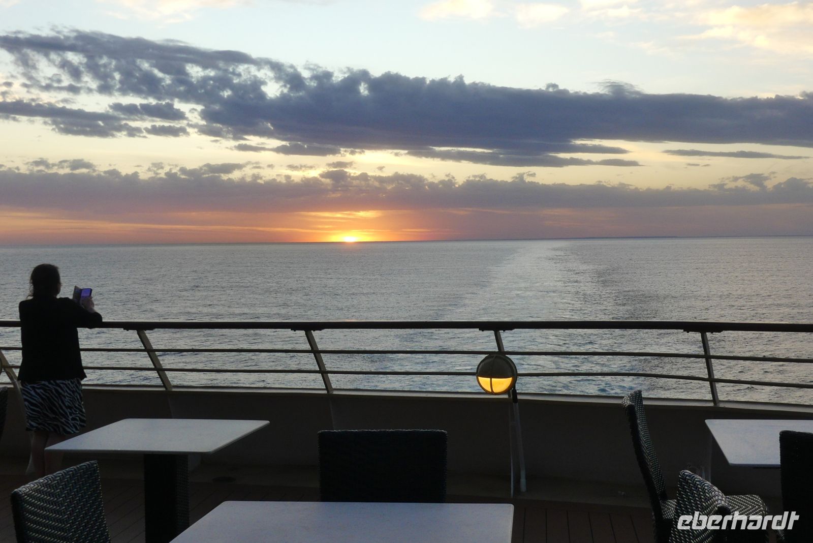 Es ist, wenn alles planmäßig verläuft, der letzte Seetag unserer Kreuzfahrt. Bei einem kurzen Treffen am Vormittag besprechen wir das Ausschiffungsprozedere. Das Wetter heute ist angenehm – es scheint die Sonne und es ist warm. So werden jetzt auch gern die Außenbereiche des Schiffes genutzt. Da kann man die Urlaubsbräune auffrischen, ein Buch lesen oder den Pool nutzen. Das Außendeck rund um den Pool ist natürlich gut besucht. Nur für Ruhesuchende ist die ziemlich laute Unterhaltung nichts. Da kann sich jeder glücklich schätzen, der eine Balkonkabine hat.