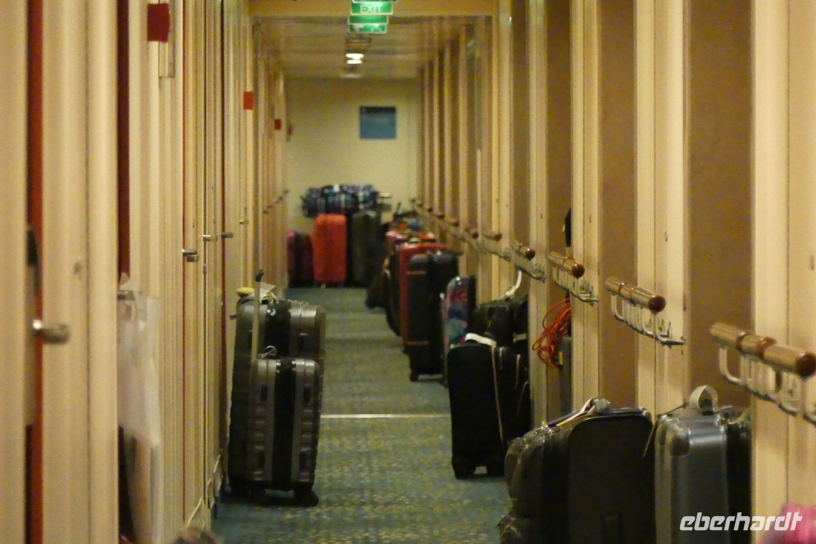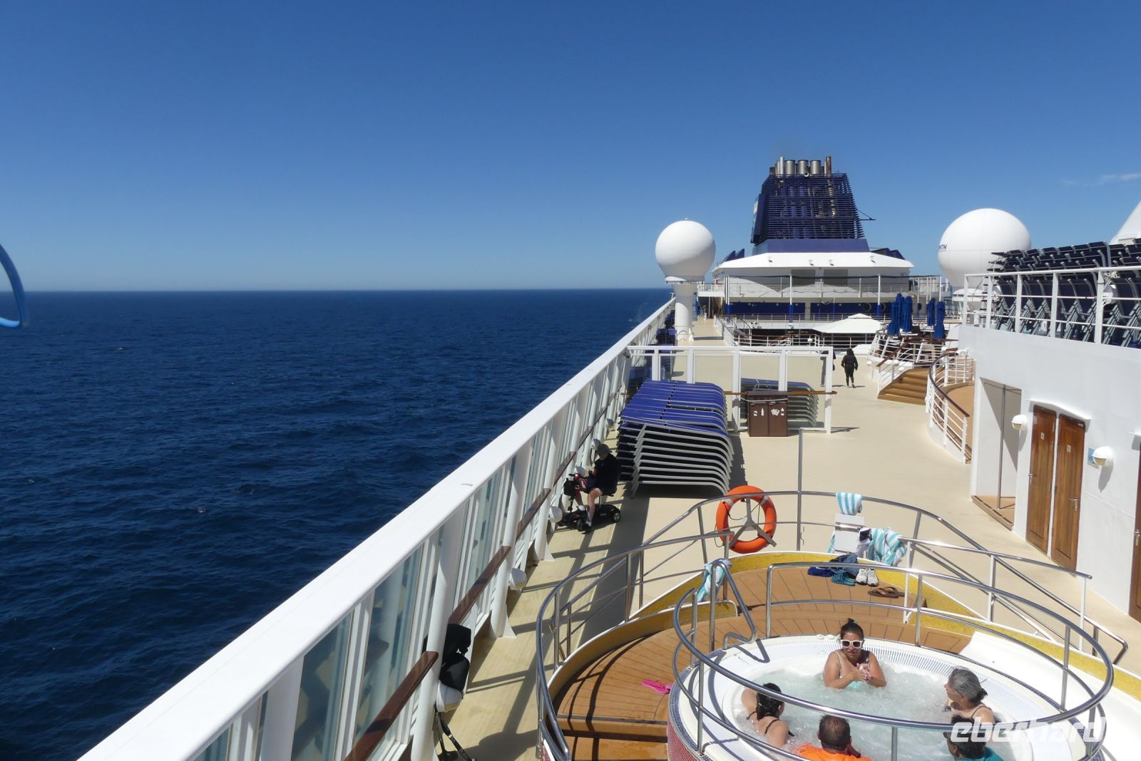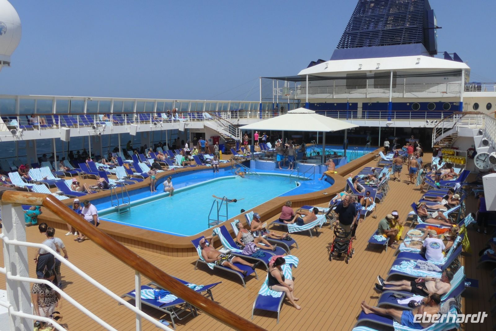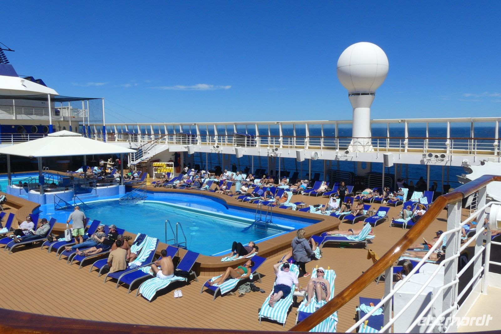 Es ist, wenn alles planmäßig verläuft, der letzte Seetag unserer Kreuzfahrt. Bei einem kurzen Treffen am Vormittag besprechen wir das Ausschiffungsprozedere. Das Wetter heute ist angenehm – es scheint die Sonne und es ist warm. So werden jetzt auch gern die Außenbereiche des Schiffes genutzt. Da kann man die Urlaubsbräune auffrischen, ein Buch lesen oder den Pool nutzen. Das Außendeck rund um den Pool ist natürlich gut besucht. Nur für Ruhesuchende ist die ziemlich laute Unterhaltung nichts. Da kann sich jeder glücklich schätzen, der eine Balkonkabine hat.