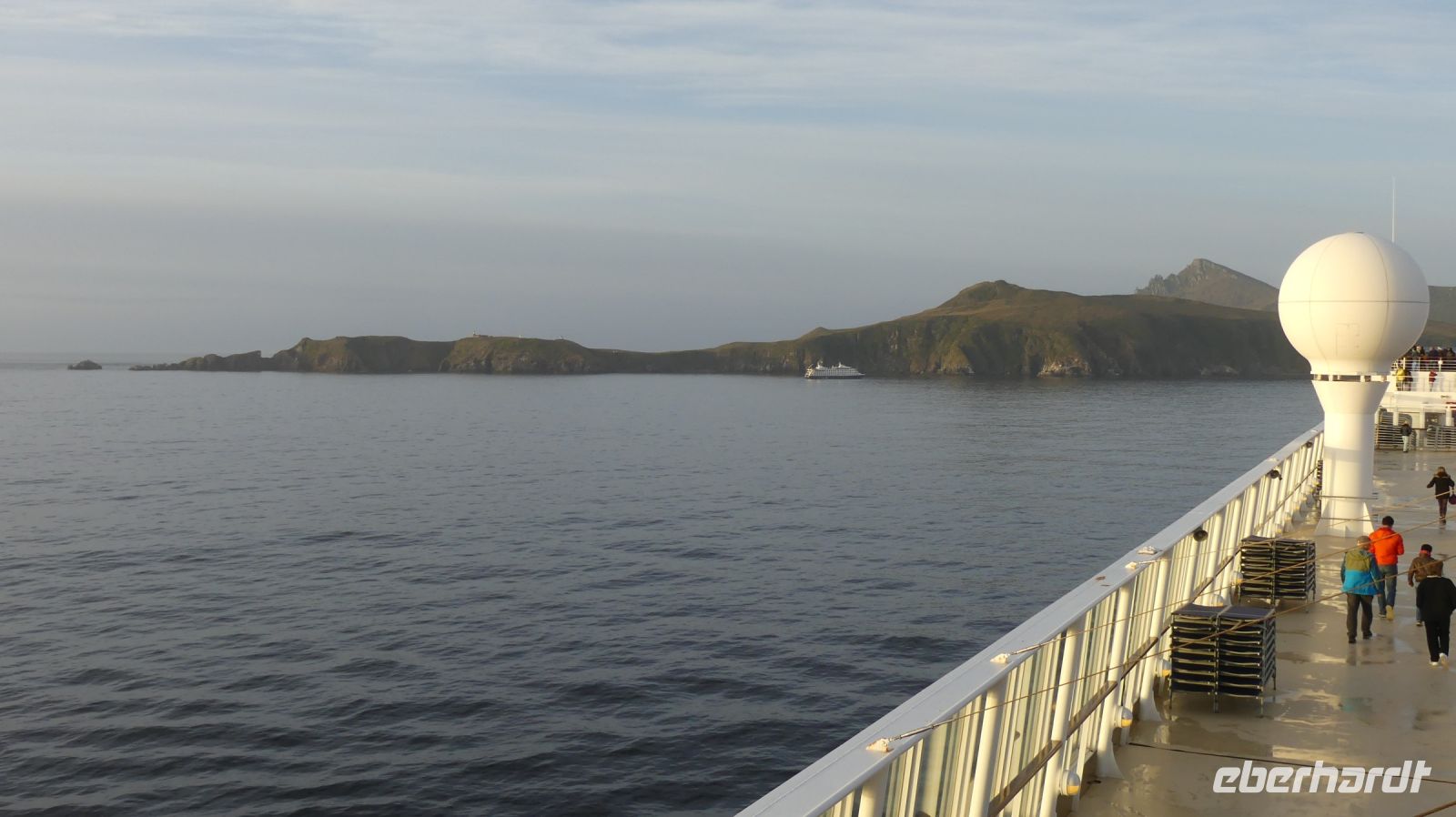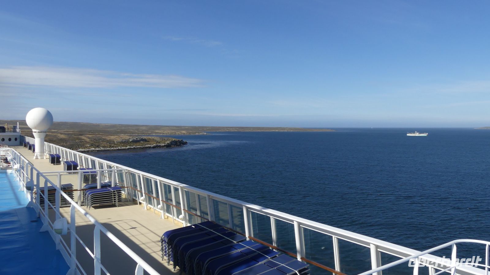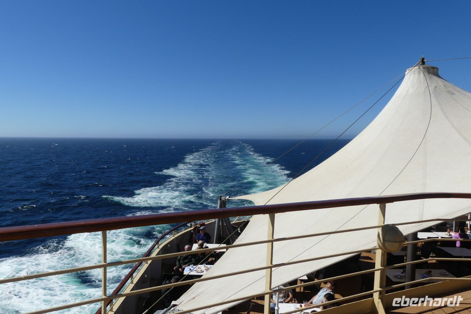 Der heutige Tag auf See ist sonnig und der Atlantik ist relativ ruhig. Die Temperaturen sind angenehm und die Sonnenliegen auf dem Pooldeck sind begehrt. Wer auf die Weiten des Atlantik schaut, wird die uns ständig begleitenden Albatrosse und manchmal auch Delphine und Wale sehen.