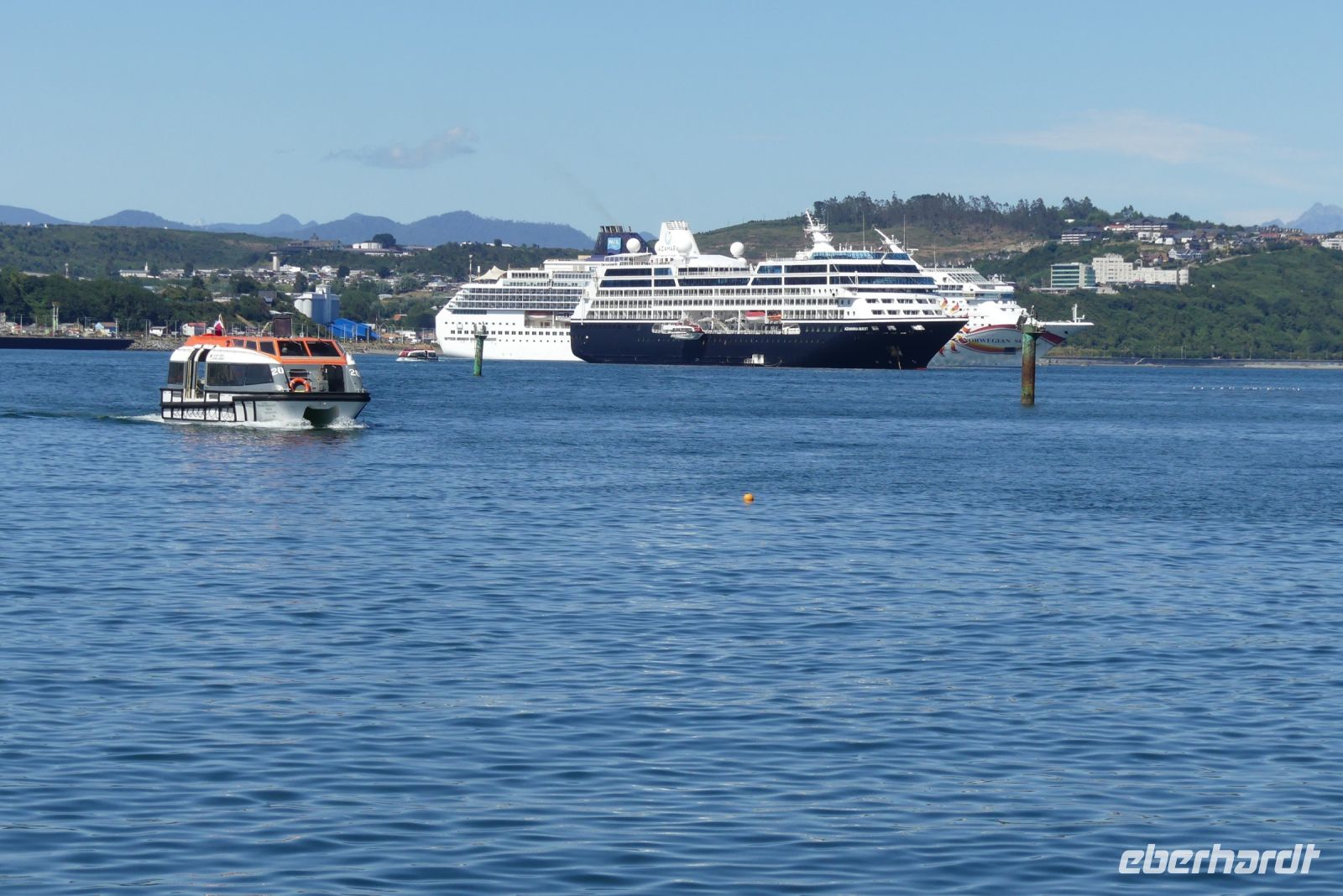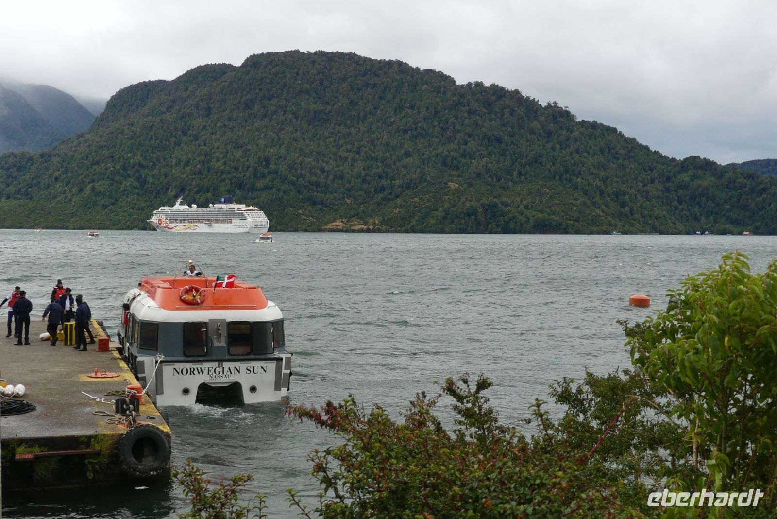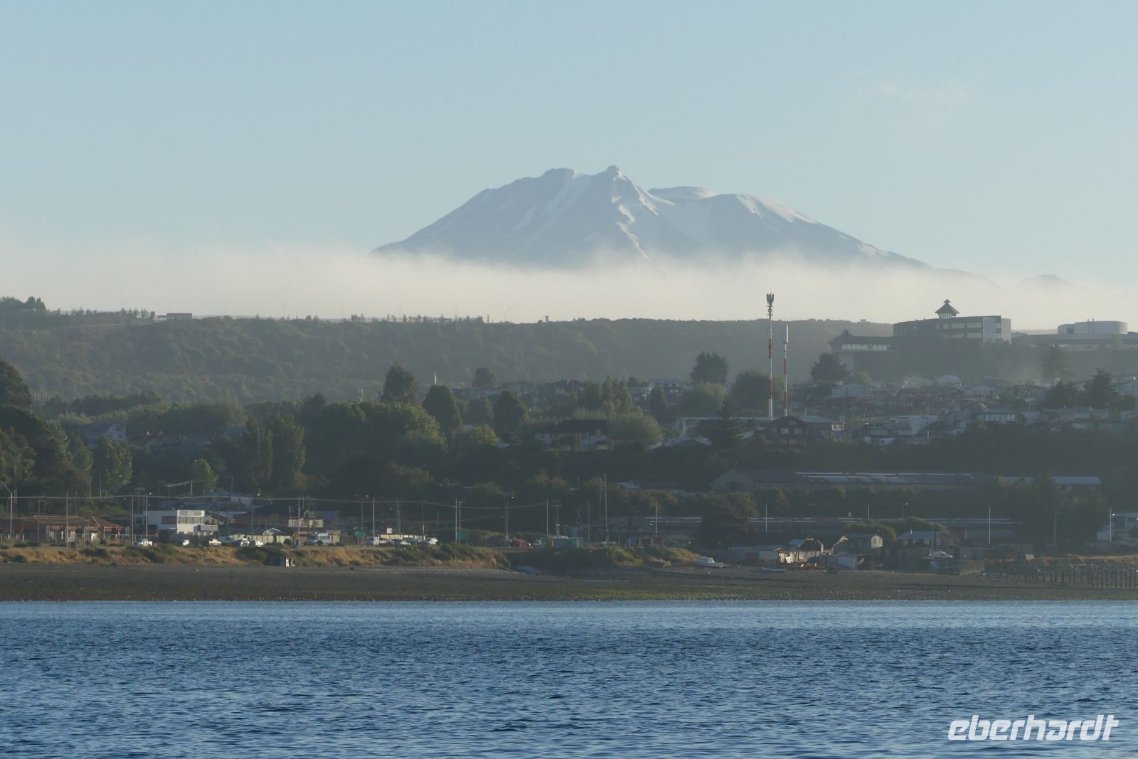 Am Morgen erreichen wir den Naturhafen von Puerto Montt. Die Norwegian Sun liegt auf Reede im geschützten Golf von Ancud. Damit ist das Tendern mit den Rettungsbooten bei ruhiger See kein Problem. Noch hängt der Hochnebel über der Region, aber die Wettervorhersagen für heute prognostizieren einen sonnigen Sommertag.