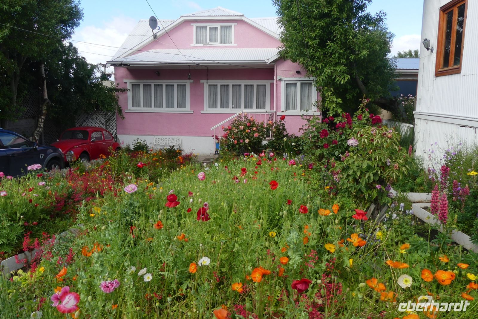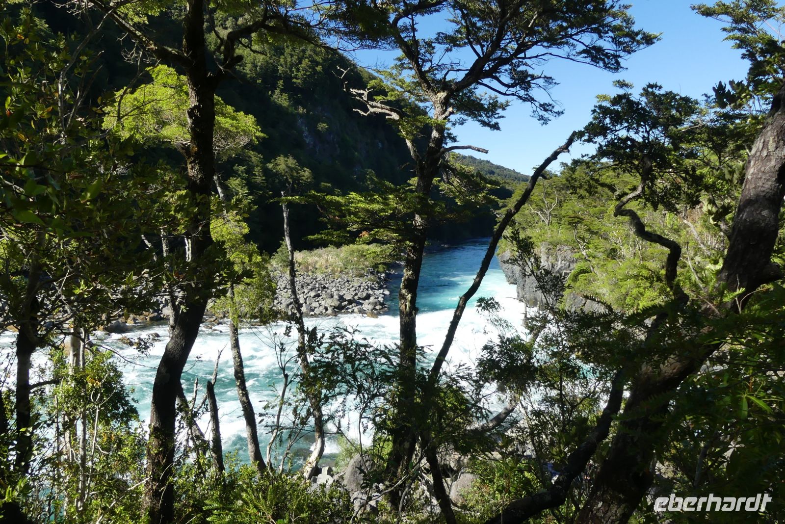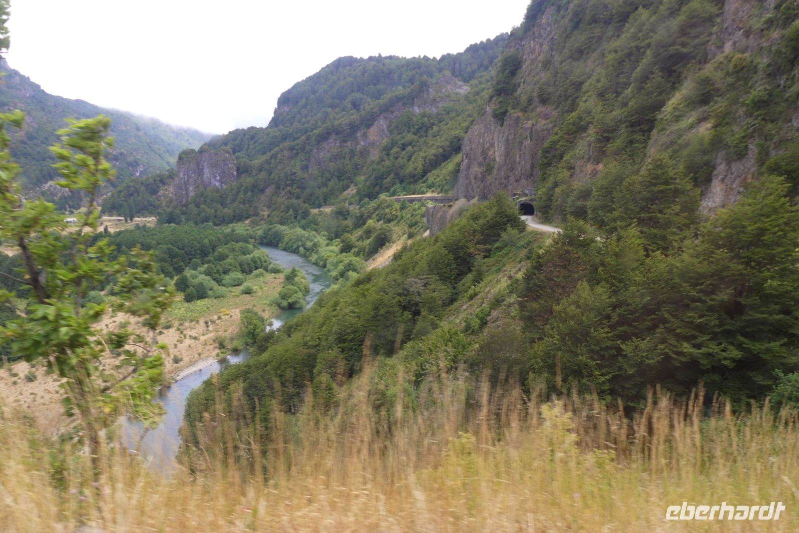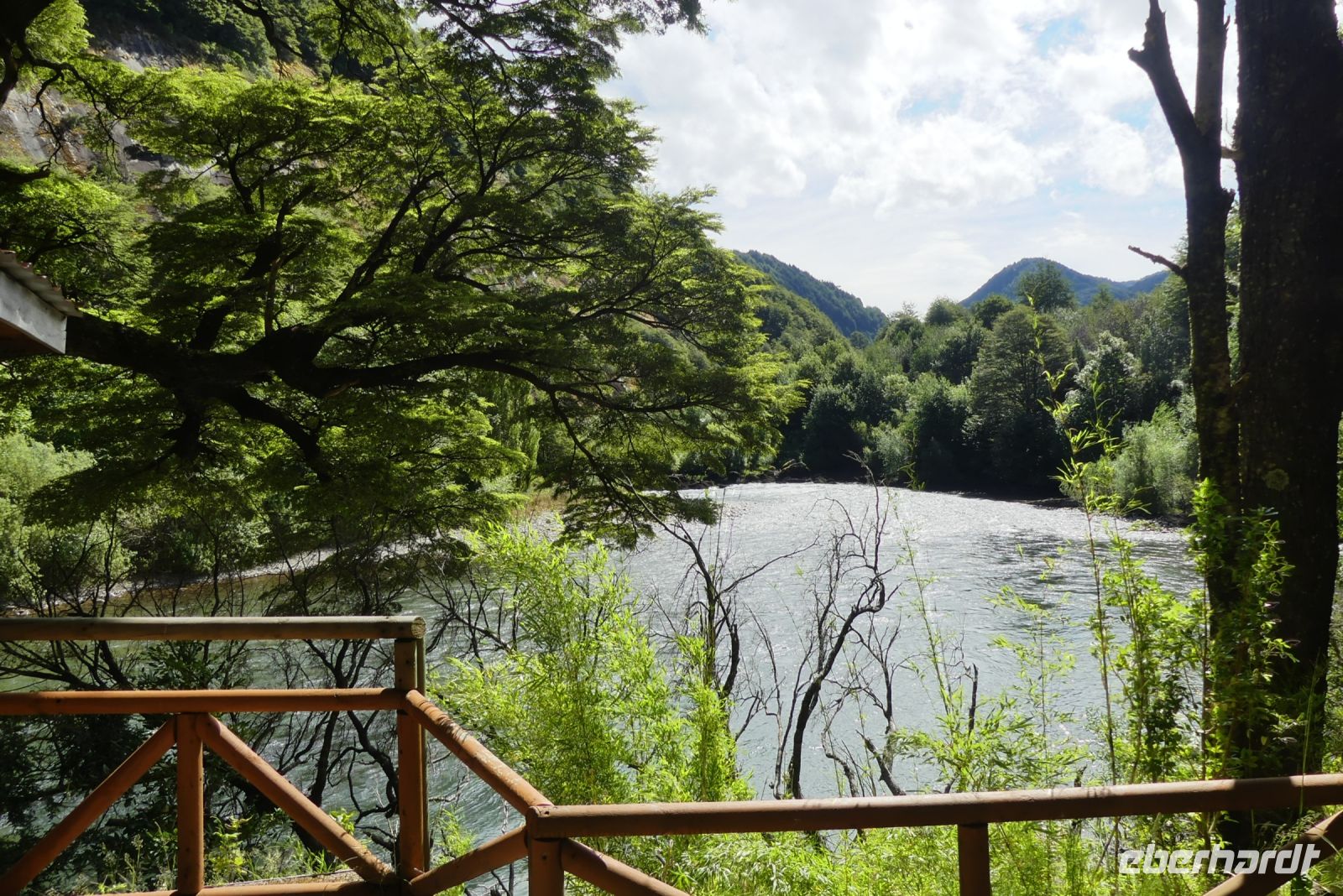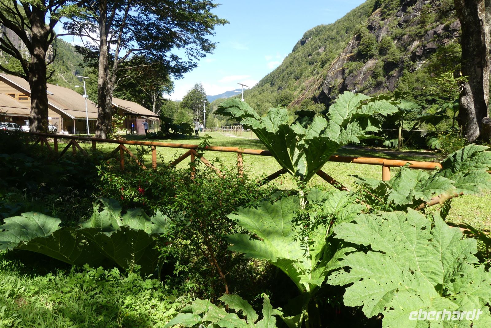 Nach einem Fotostopp oberhalb von Coyhaique verbringen wir etwas Zeit in der Hauptstadt der Region Aysen. Wir befinden uns hier ca. 1.650 Kilometer südlich von Santiago de Chile an der Carratera Austral. Auf dem zentralen Markt mit einem ungewöhnlichem fünfeckigen Grundriss bieten Straßenhändler Erzeugnisse der Region an, wie zum Beispiel Kunsthandwerk aus Holz oder Mineralien sowie Honig, Marmeladen und Produkte aus der Calafate Beere, eine Art Blaubeere, die in Patagonien weit verbreitet ist. In Coyhaique haben wir auch einen Mittagsimbiss inklusive Wein und Pisco Sour. Inzwischen ist das Wetter freundlicher geworden und die Sonne zeigt sich immer öfters. Das passt gut für unseren letzten Halt am Besucherzentrum des Nationalparks Rio Simpson. Im Museum kann man sich über die Flora und Fauna der Region informieren oder am Simpson Fluss einen Spaziergang durch den Kaltregenwald unternehmen. Hier wachsen Bambus, Südbuchen (Scheinbuche), Farne, „Riesenrhabarber“, es blühen Flaschenblumen, Fuchsien, Fingerhut u. a. m. Leider erlauben uns die Zeitvorgaben der Reederei nur eine halbe Stunde Aufenthalt. Gern wären wir in dieser schönen Natur länger geblieben.