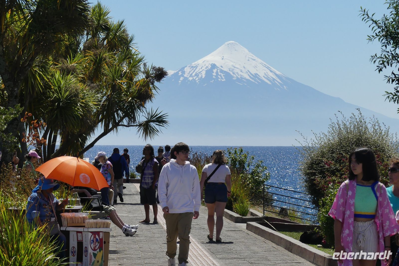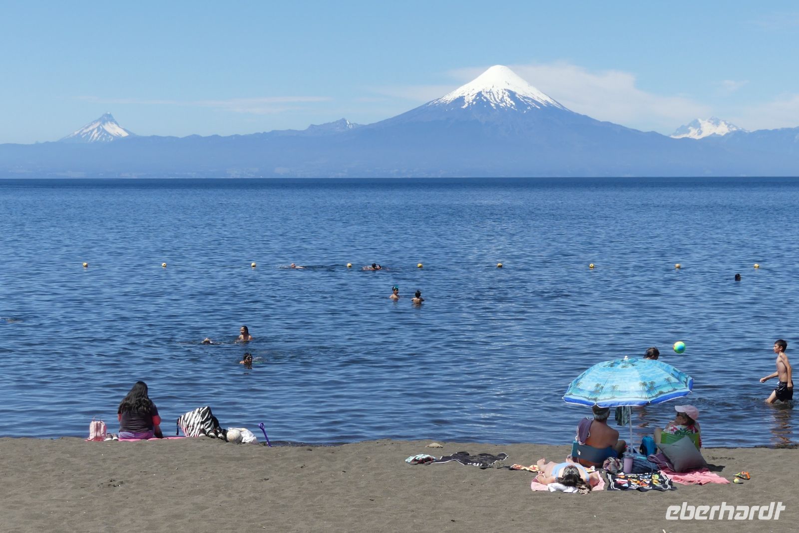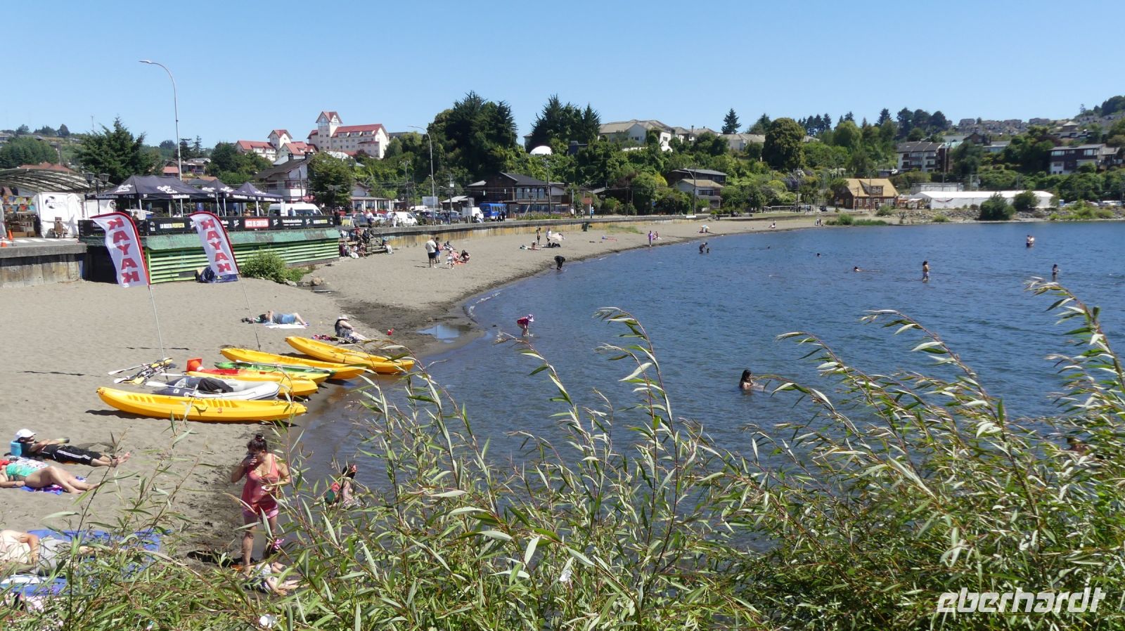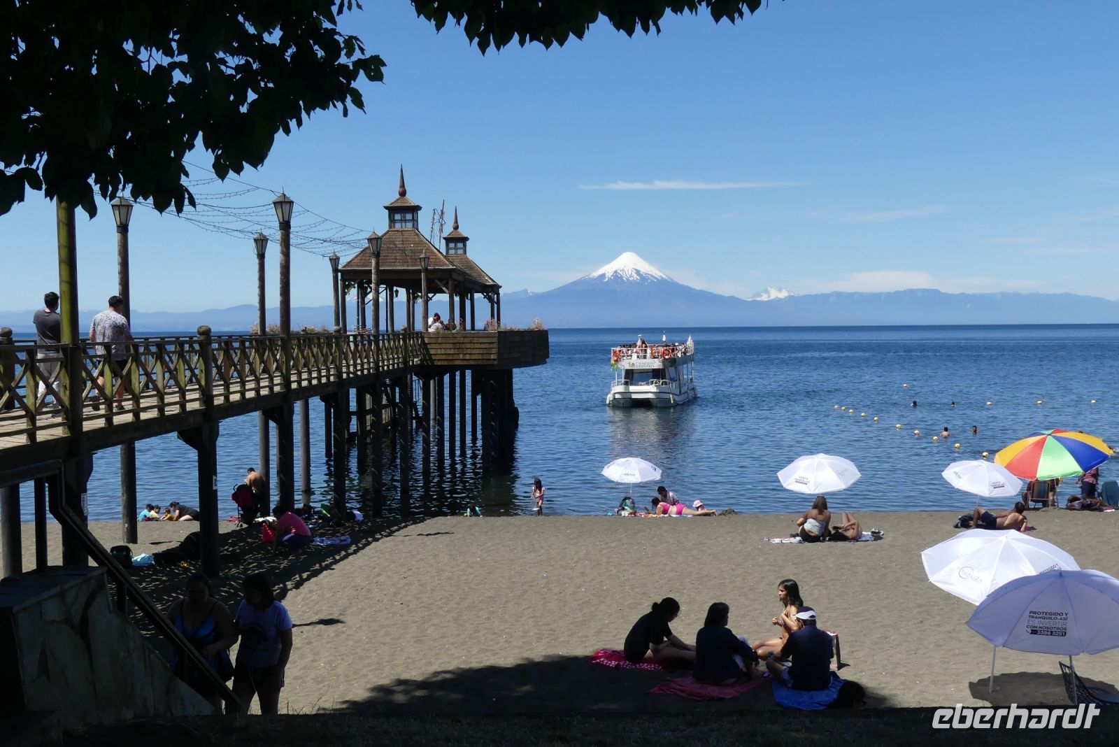 Nach dem Mittagessen (Pisco Sour, Lachs, Kuchen) fahren wir weiter ans Westufer nach Frutillar. Frutillar ist durch die deutschen Siedler des 19. Jahrhunderts und ihre Nachfahren geprägt. Wir besuchen das Freilichtmuseum Museo Colonial Aleman. Hier bekommt man einen Einblick in die Geschichte der deutschen Siedler. Tolle Perspektiven hat man bei einem Spaziergang entlang der Uferstraße. Bei etwa 25 Grad und strahlendem Sonnenschein nutzen die Chilenen vor der Kulisse der Anden und des Schnee bedeckten Osorno das Wetter für ein Bad im See oder ein Sonnenbad am Strand.