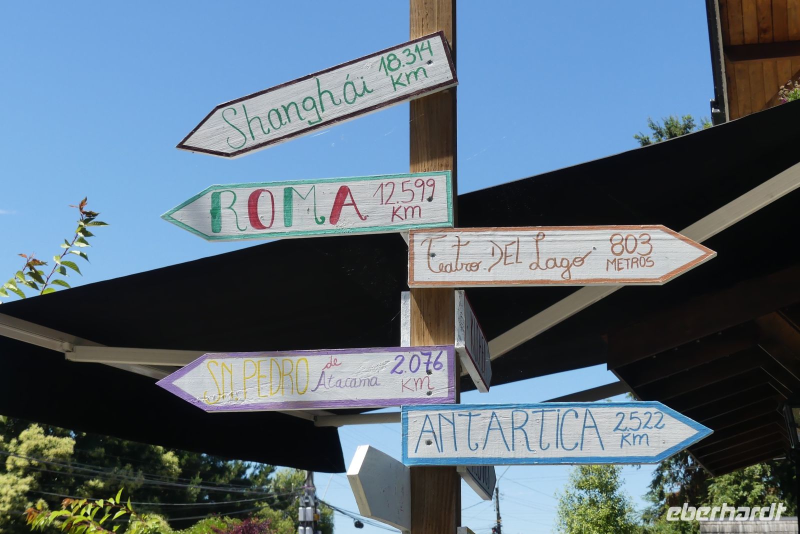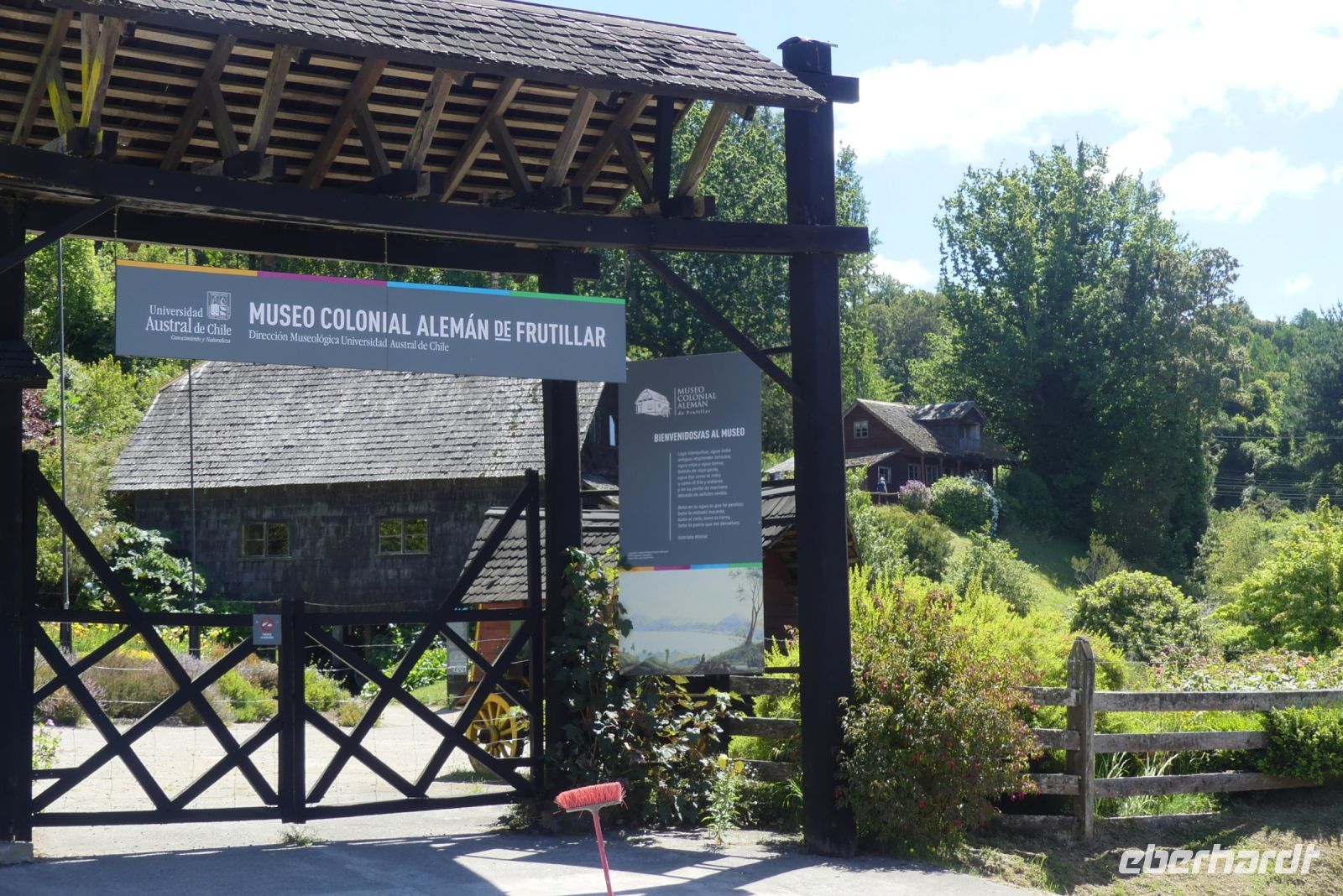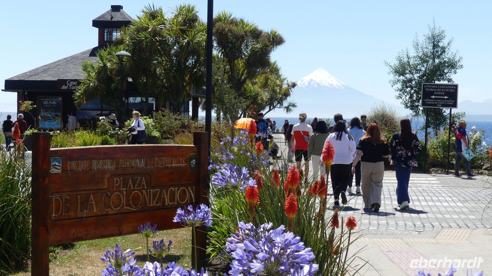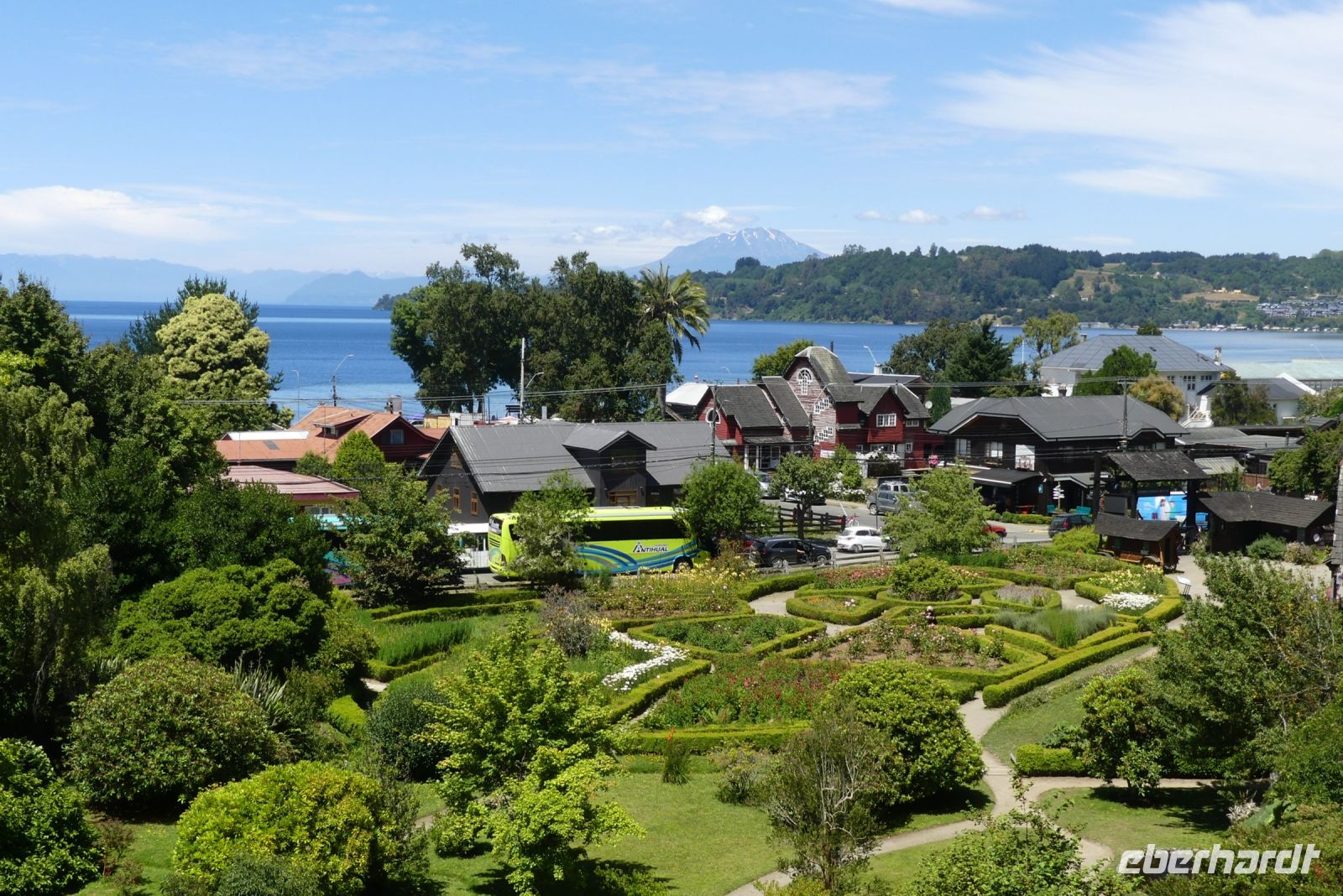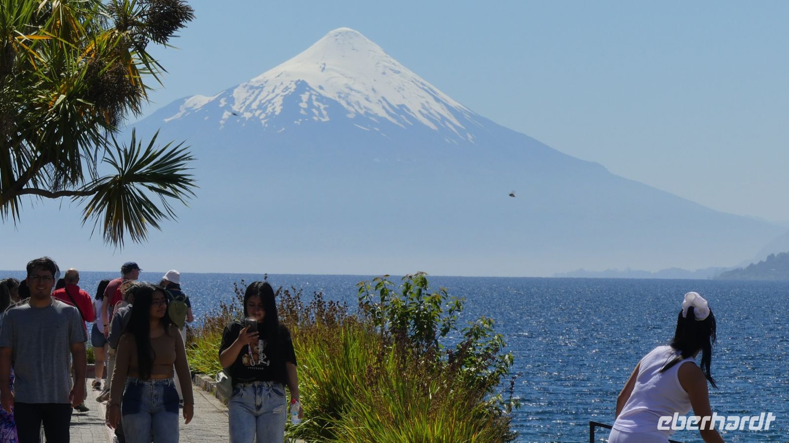 Nach dem Mittagessen (Pisco Sour, Lachs, Kuchen) fahren wir weiter ans Westufer nach Frutillar. Frutillar ist durch die deutschen Siedler des 19. Jahrhunderts und ihre Nachfahren geprägt. Wir besuchen das Freilichtmuseum Museo Colonial Aleman. Hier bekommt man einen Einblick in die Geschichte der deutschen Siedler. Tolle Perspektiven hat man bei einem Spaziergang entlang der Uferstraße. Bei etwa 25 Grad und strahlendem Sonnenschein nutzen die Chilenen vor der Kulisse der Anden und des Schnee bedeckten Osorno das Wetter für ein Bad im See oder ein Sonnenbad am Strand.