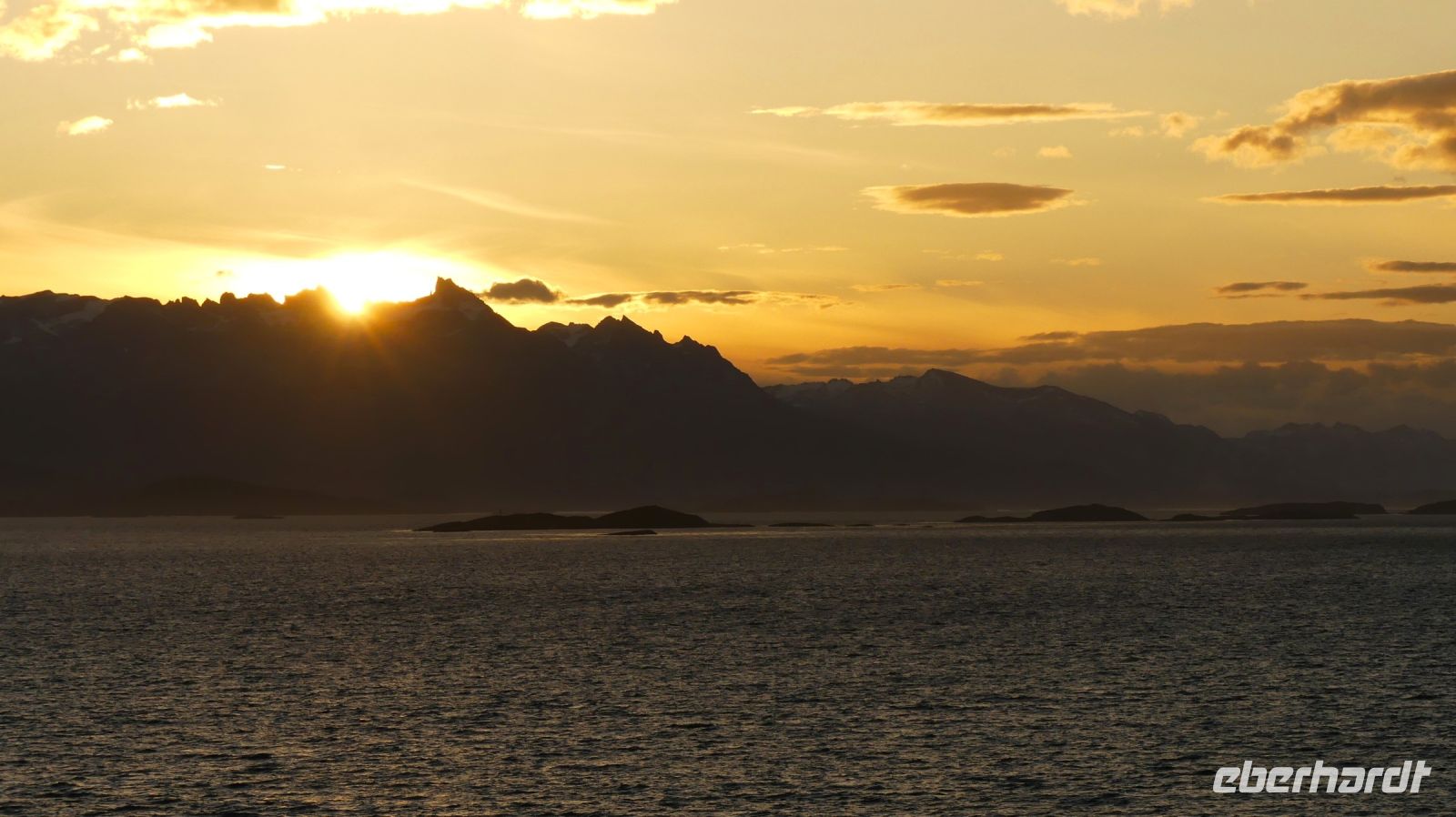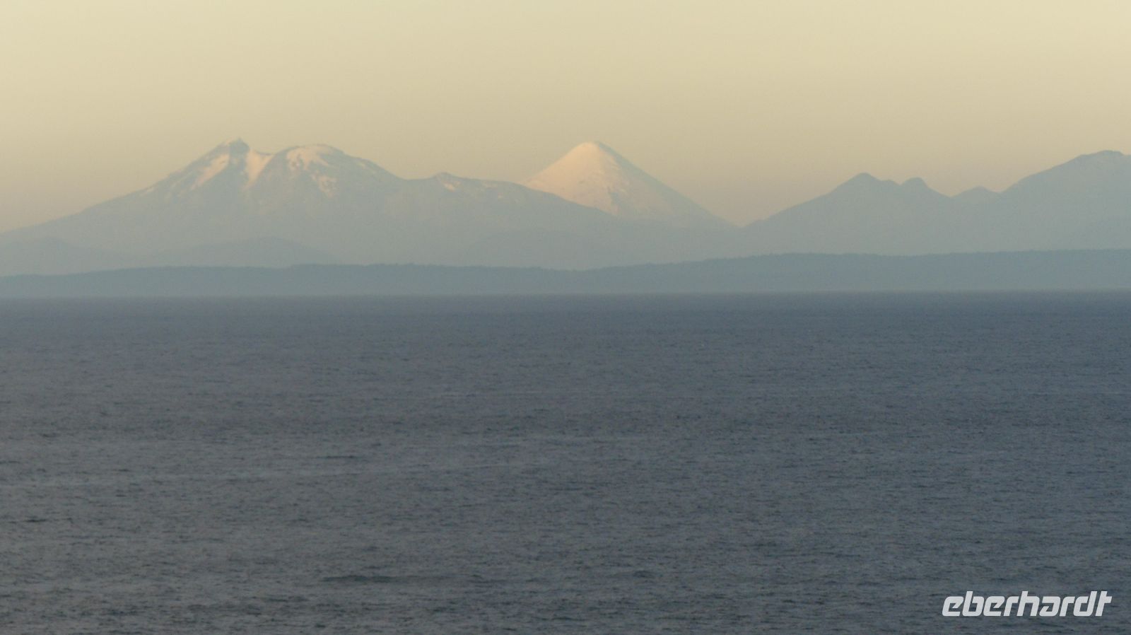 Nach dem Abendessen bin ich noch mal auf dem Oberdeck. Es ist so 21.00 Uhr, die Sonne steht tief und leuchtet die Gipfel der Anden an. Vor ca. zwei Stunden haben wir Puerto Montt verlassen, aber noch immer sind in der Ferne der Osorno und Calbuco deutlich zu erkennen. Ich bin sehr froh, dass wir an einem der so seltenen sonnigen Tage hier sein konnten.