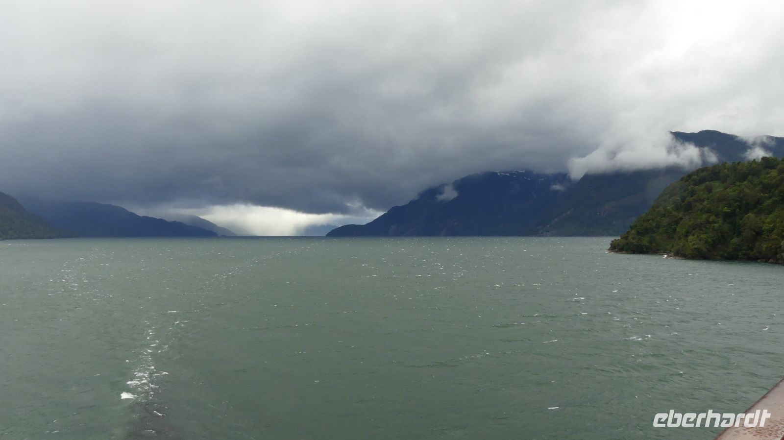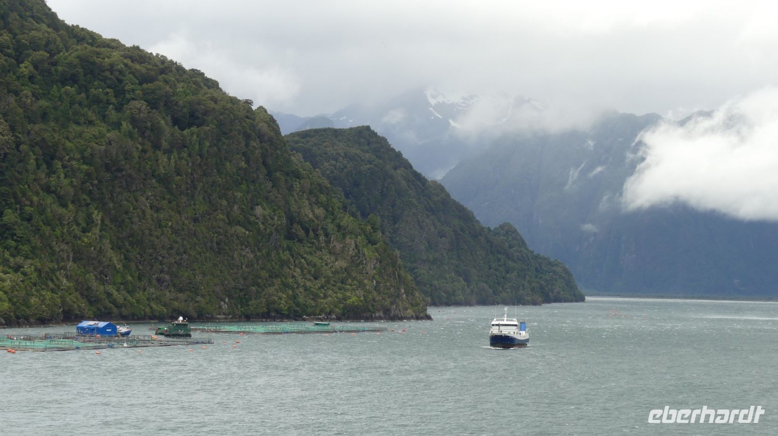 Nachdem schönen Wetter gestern, beginnt der Tag mit bedecktem Himmel und von Zeit zu Zeit leichtem Regen. Bei fast 3.000 mm Niederschlag im Jahr haben wir also ganz typisches Wetter. Dennoch können wir bei der Einfahrt in den Aysen Fjord die großartige Landschaft wahrnehmen. Der Fjord ragt tief in das Landesinnere bis zu den Ausläufern der Anden hinein. Die Landschaft erinnert mich mit den steil abfallenden Bergen, Wasserfällen und Schnee bedeckten Bergspitzen an Norwegen. Auch in Chacabuco liegen wir auf Rede und Tendern. Fast unsere gesamte Gruppe nimmt an dem deutschsprachigen Ausflug ins Simpson Tal und nach Coyhaique teil. Die Schweizerin Mia Schäfer ist unsere örtliche Reiseleiterin. Ich glaube sie ist gerade mit der Schule fertig. Sie ist hier auf der Farm ihrer Eltern aufgewachsen und kennt sich damit in der Region sehr gut aus. So erhalten wir viele interessante Informationen über Land und Leute.
