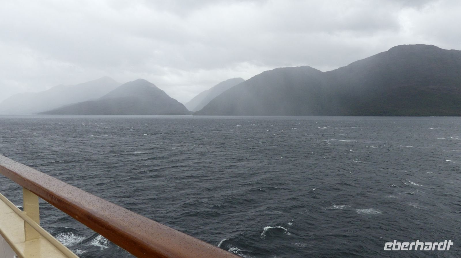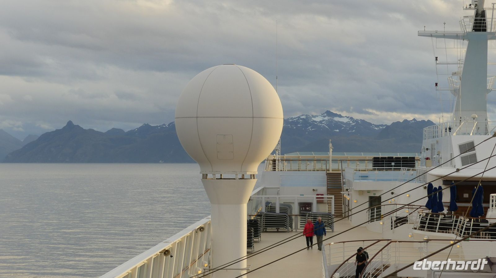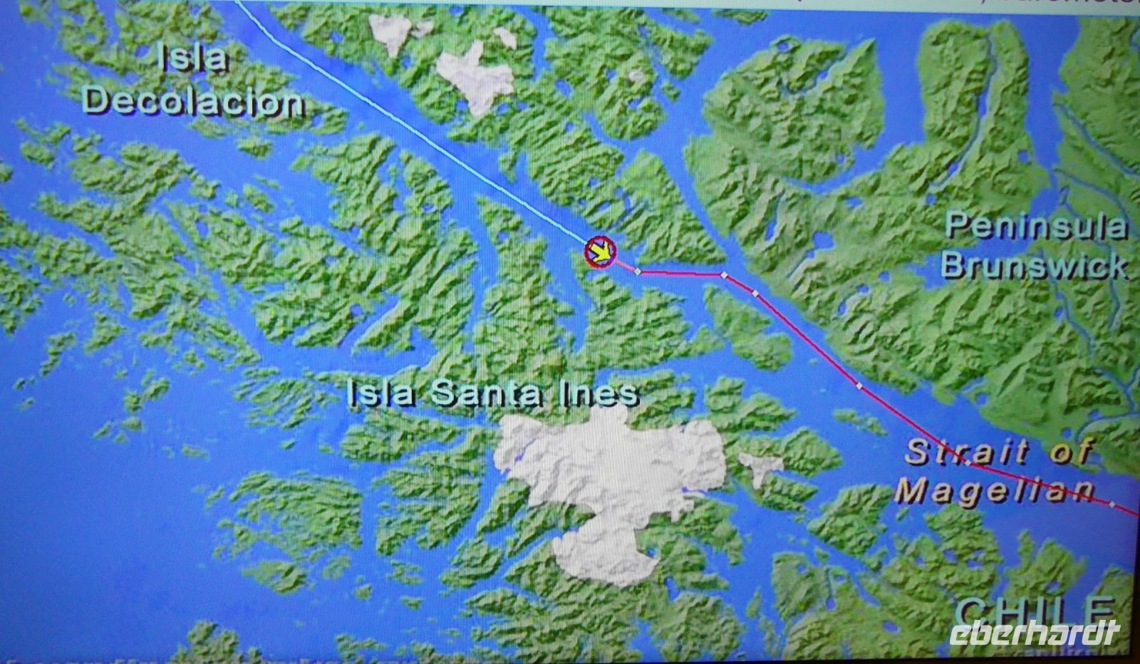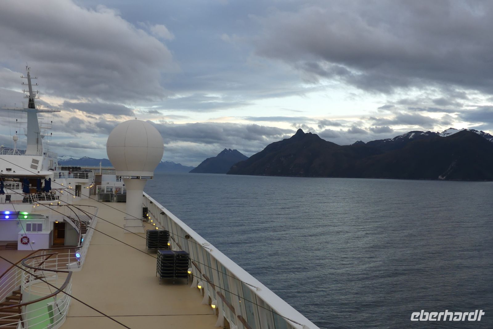 Gerade sitze ich im Spinnacker auf Deck 12 am Fenster. Jetzt für den frühen Nachmittag ist die Einfahrt in die Magellanstraße angekündigt. Noch braucht es aber Geduld, denn die tief hängenden Wolken beeinträchtigen die Sicht. Erst nach und nach wird die Passage schmaler und die Sicht bis zum Abend besser.