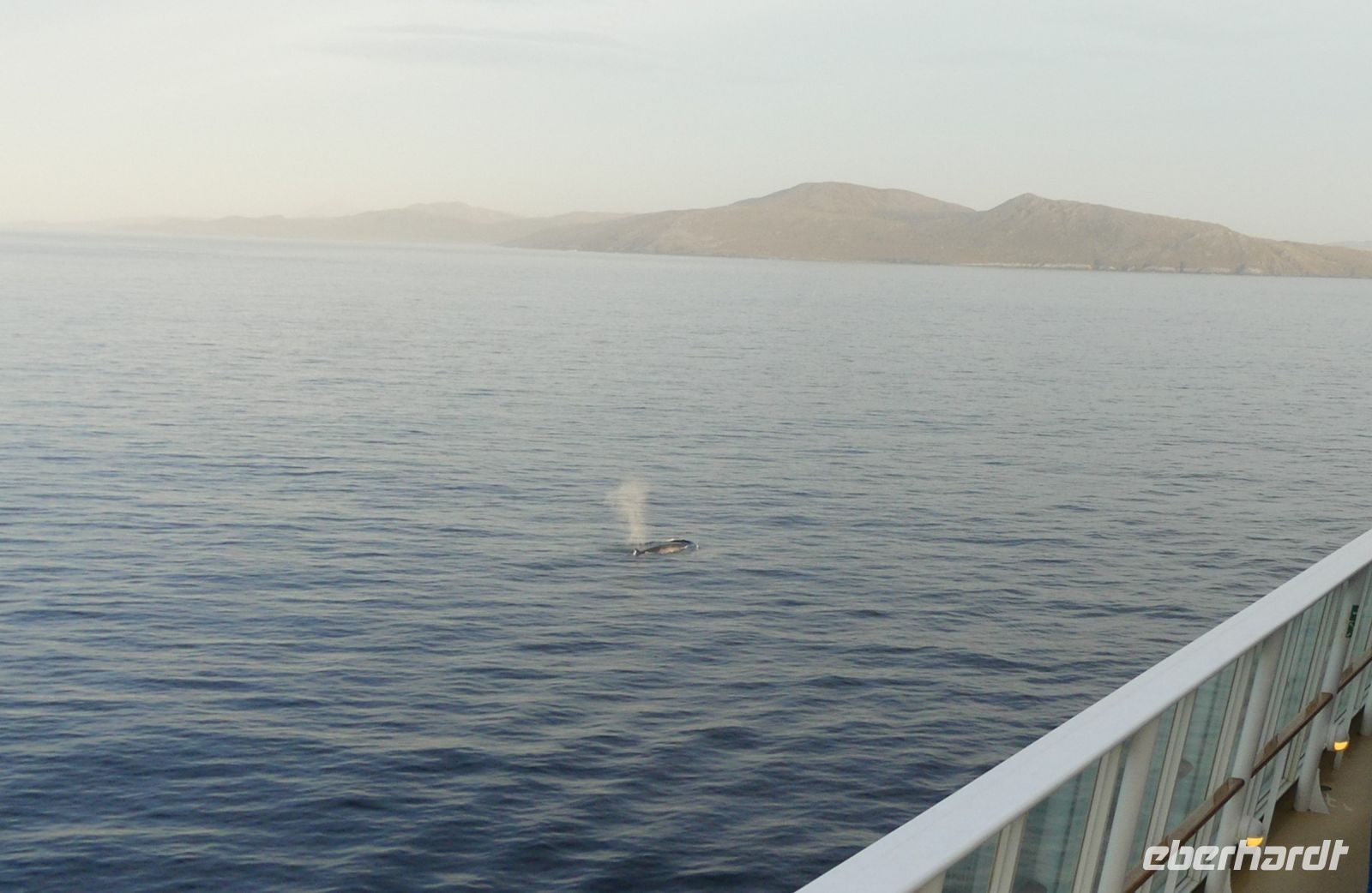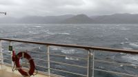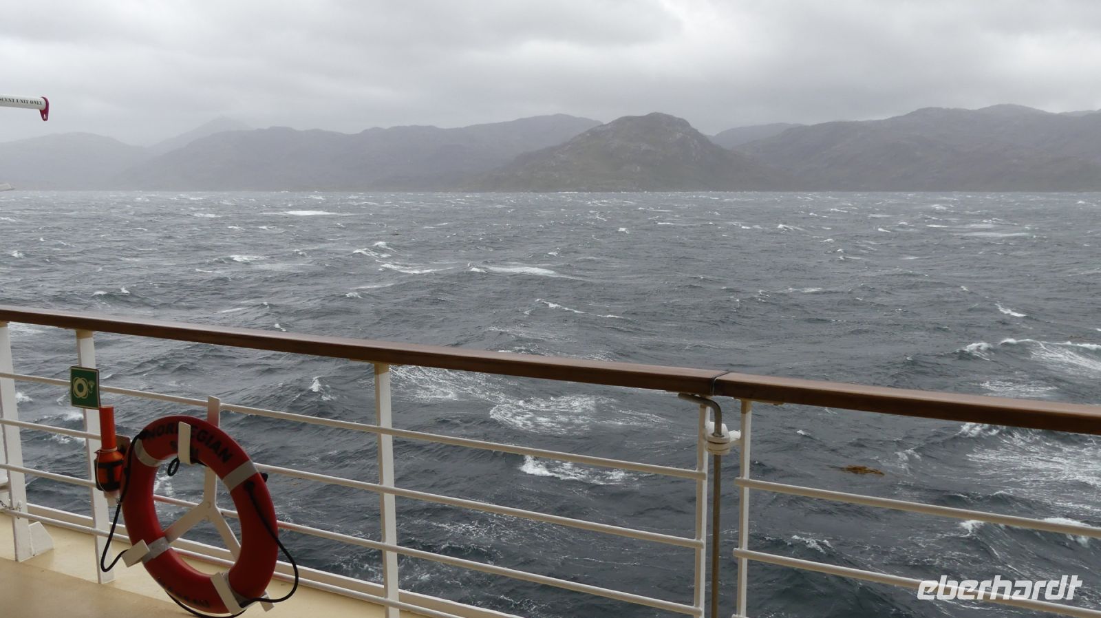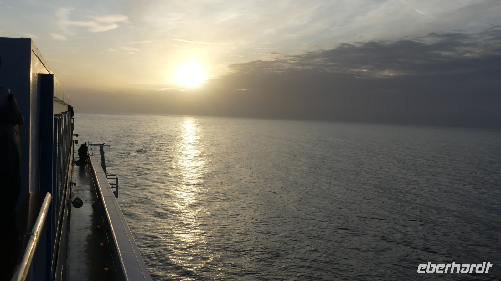 An unserem ersten Seetag geht ein starker Wind, zeitweise wird sogar der Zugang zum Außendeck 6 gesperrt und es schaukelt auch etwas. Mittags hat sich dann auch die Sonne gegen den Hochnebel durchgesetzt.