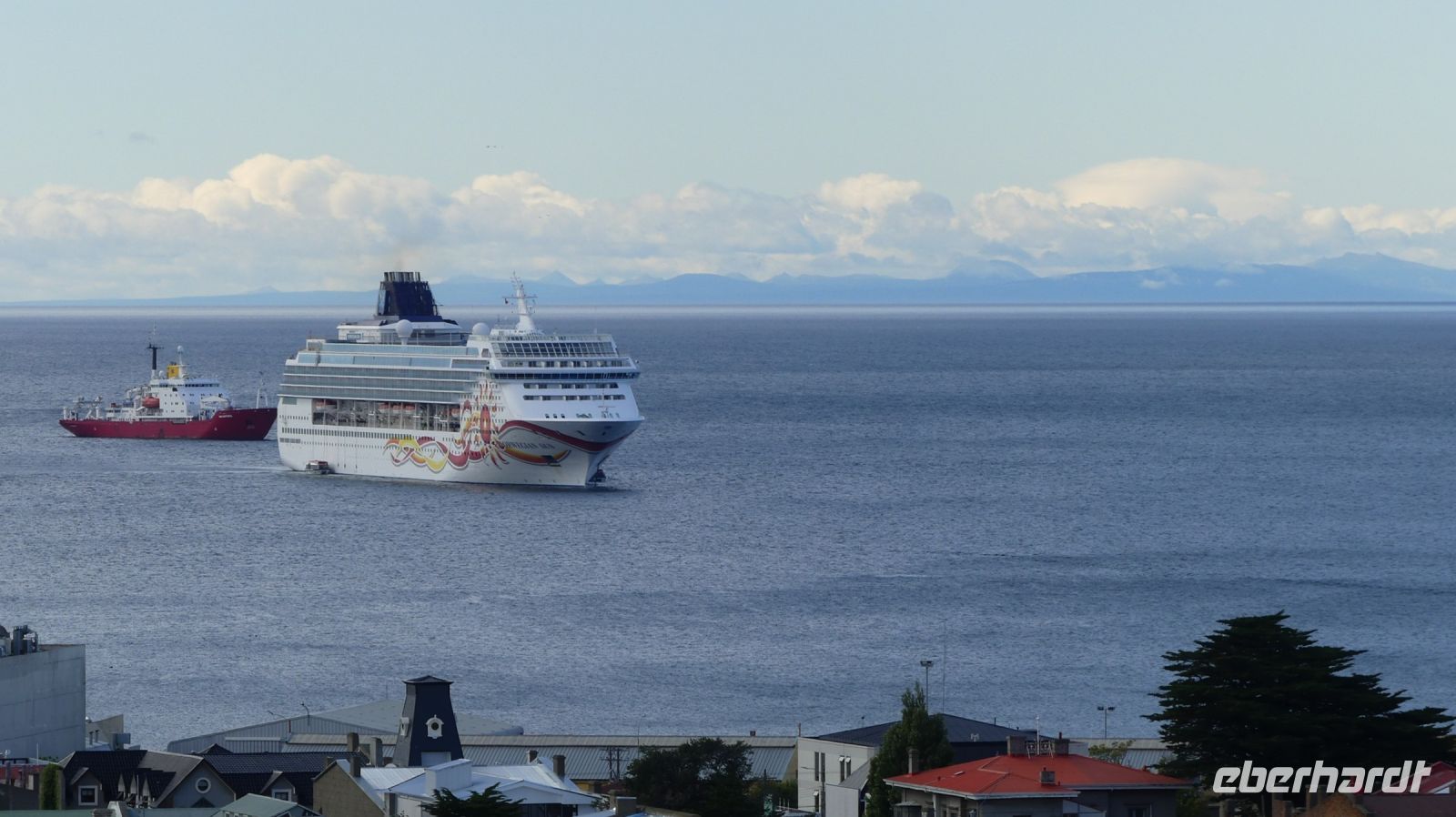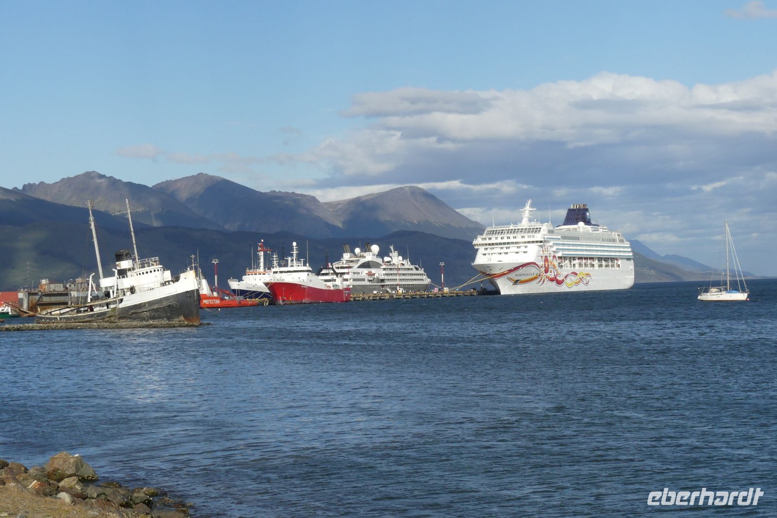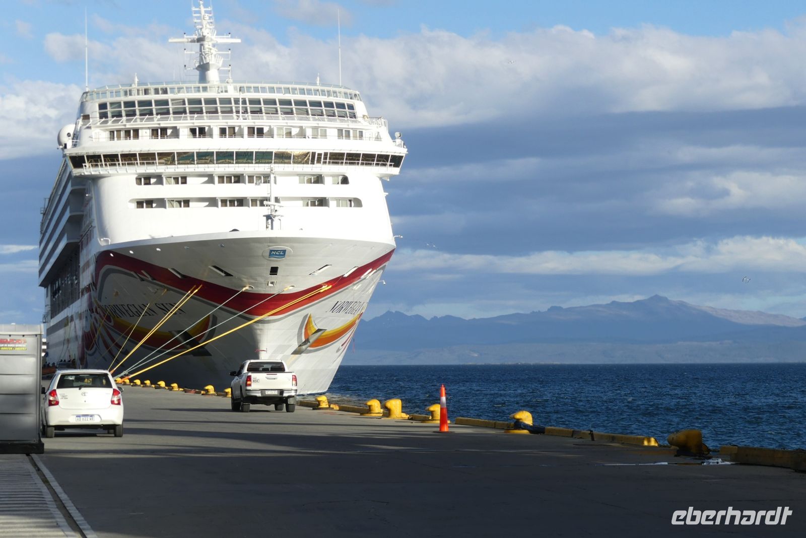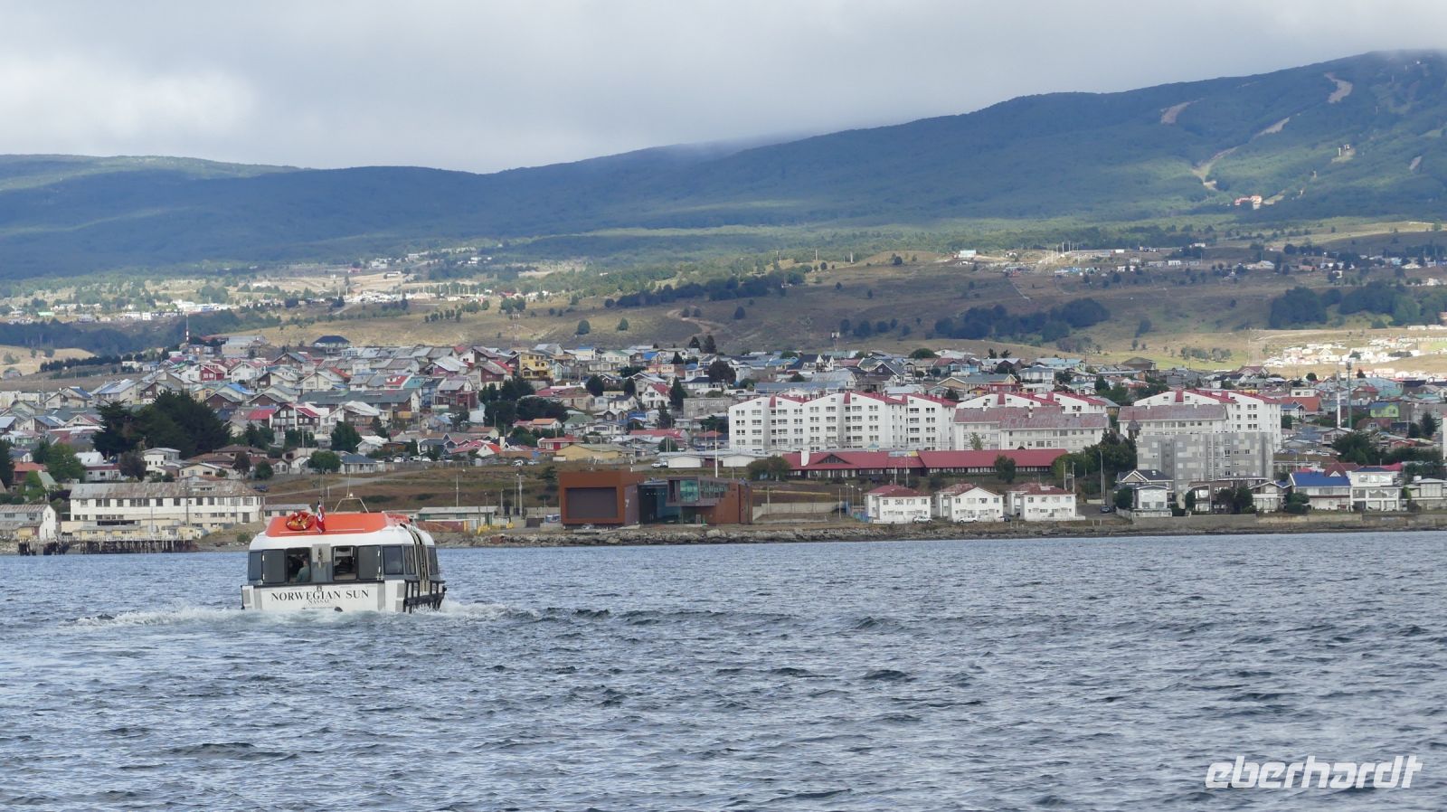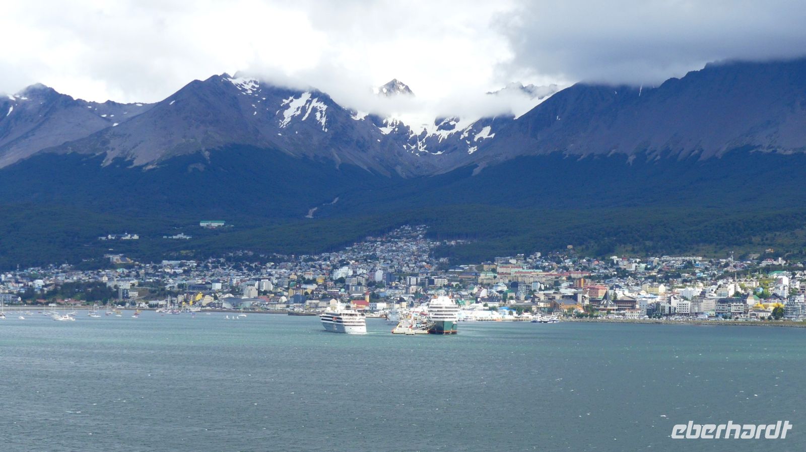 Während der Fahrt haben wir auch die Seegrenze von Chile nach Argentinien passiert. Inzwischen ist das Wetter freundlicher geworden und die Sonne zeigt sich immer häufiger. Mittags erreichen wir Ushuaia am Fuße der Anden. Die 82.000 Einwohner zählende Stadt ist die südlichsten Stadt der Welt. Für uns ist es der erste Hafen dieser Kreuzfahrt ohne Tendern.