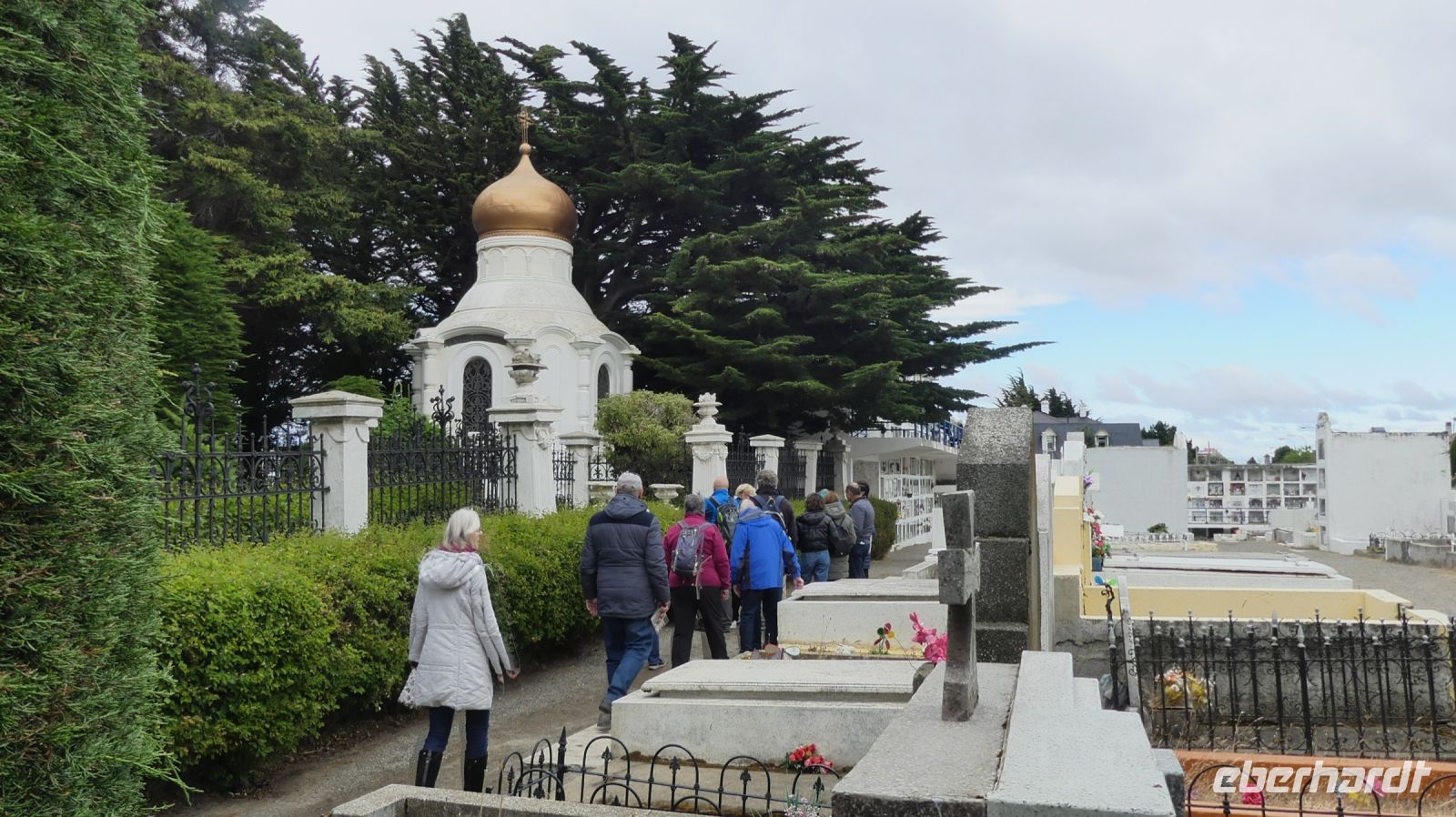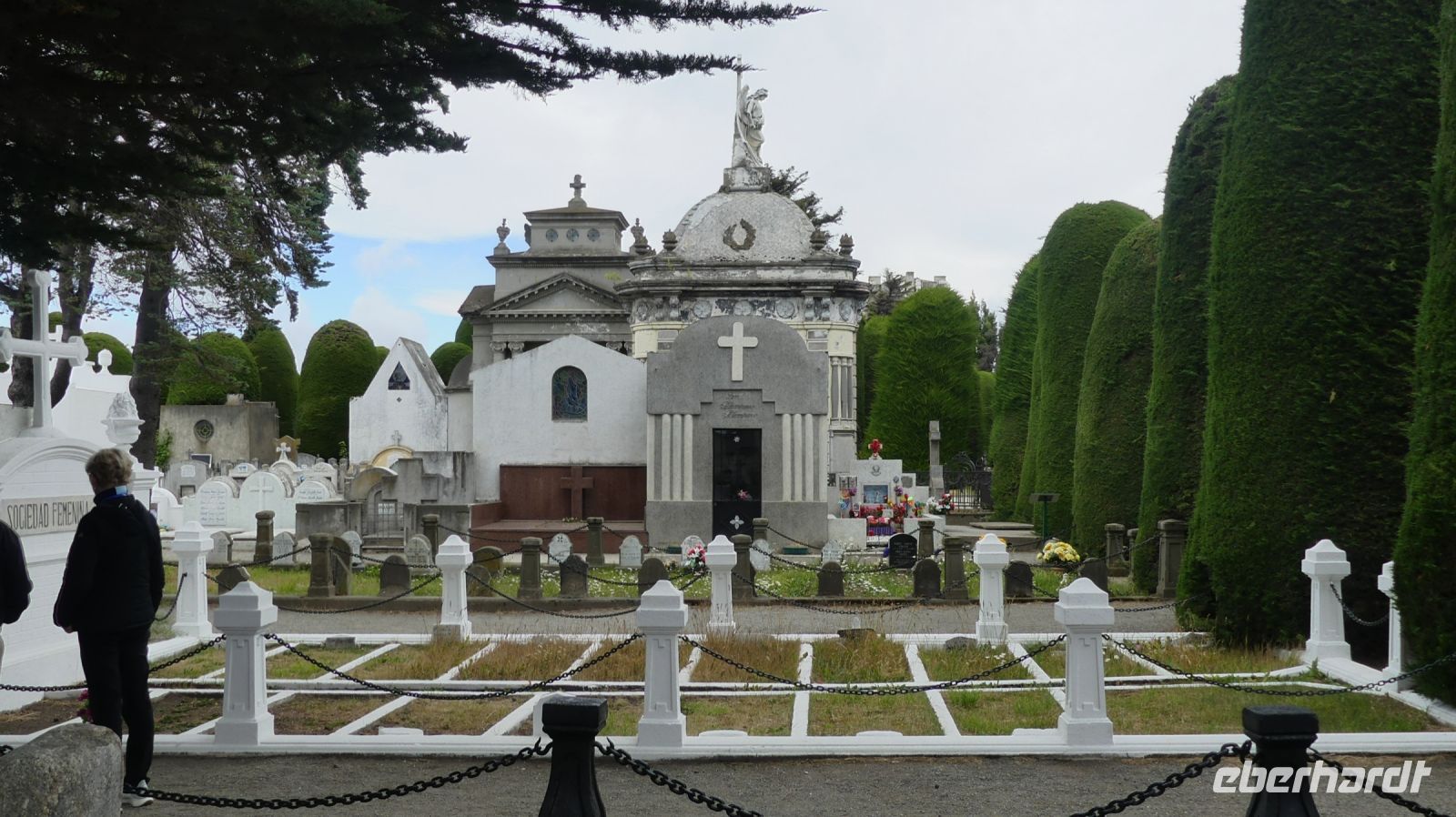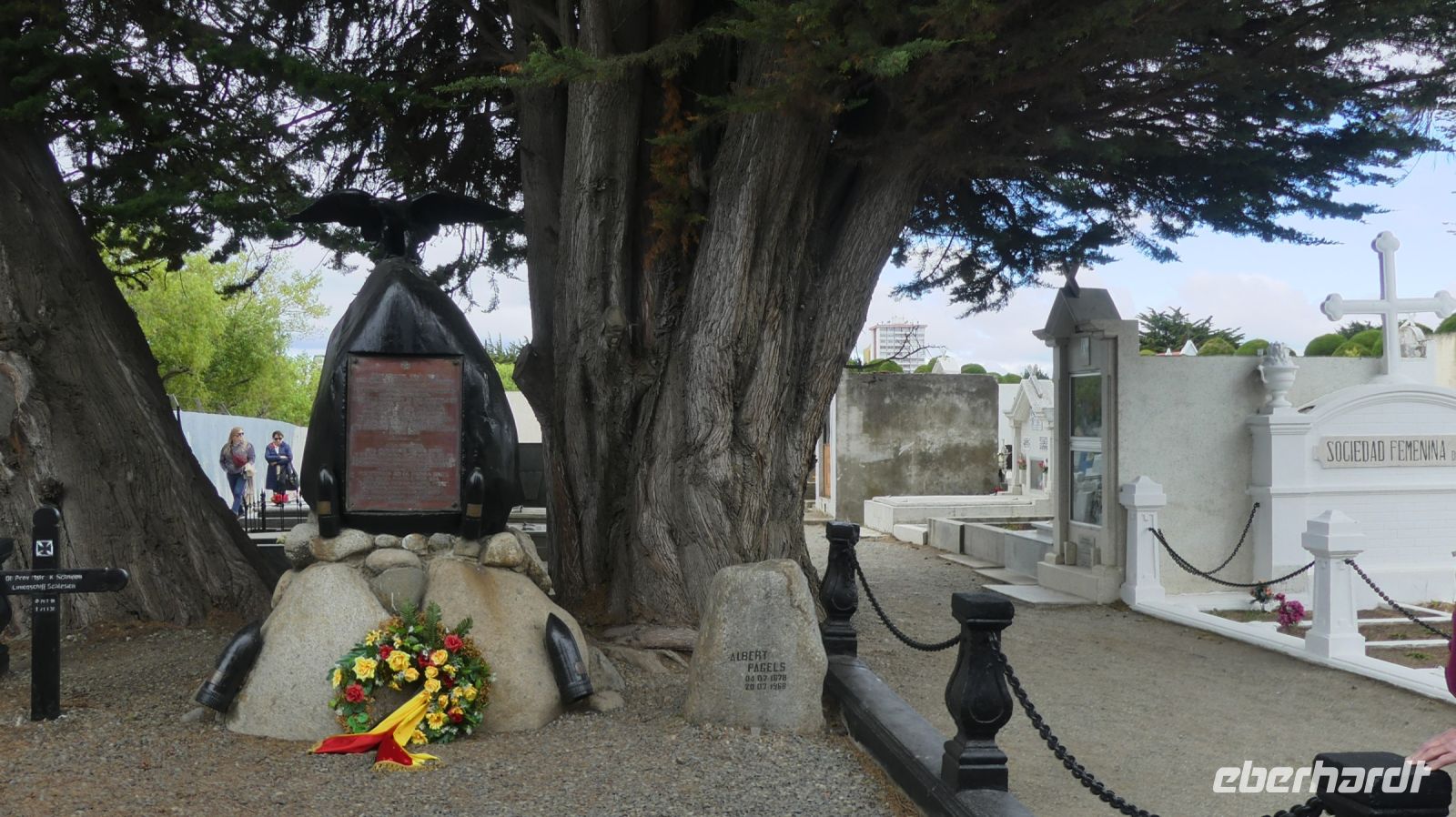 Unser nächstes Ziel ist der berühmte Friedhof der Stadt. Er gehört zum chilenischen Nationalerbe und wird gern mit dem Friedhof in Buenos Aires verglichen. Allerdings muss man hier 5.000 Peso Eintritt bezahlen. Auf dem Friedhof sehen wir monumentale Familienmausoleen von Schafbaronen und anderen Einwandererfamilien, die in den goldenen Zeiten zu Reichtum gekommen sind. Für andere wurden Sammelgräber angelegt, darunter das der Deutschen Krankenkasse. Daneben befindet sich der Gedenkstein für Graf Spee und die deutschen Matrosen, welche im ersten Weltkrieg gefallen sind. Letztendlich kommen wir zur Uferpromenade, wo sich das Denkmal für den Schoner Ancud sowie der Schriftzug von Punta Arenas befinden.