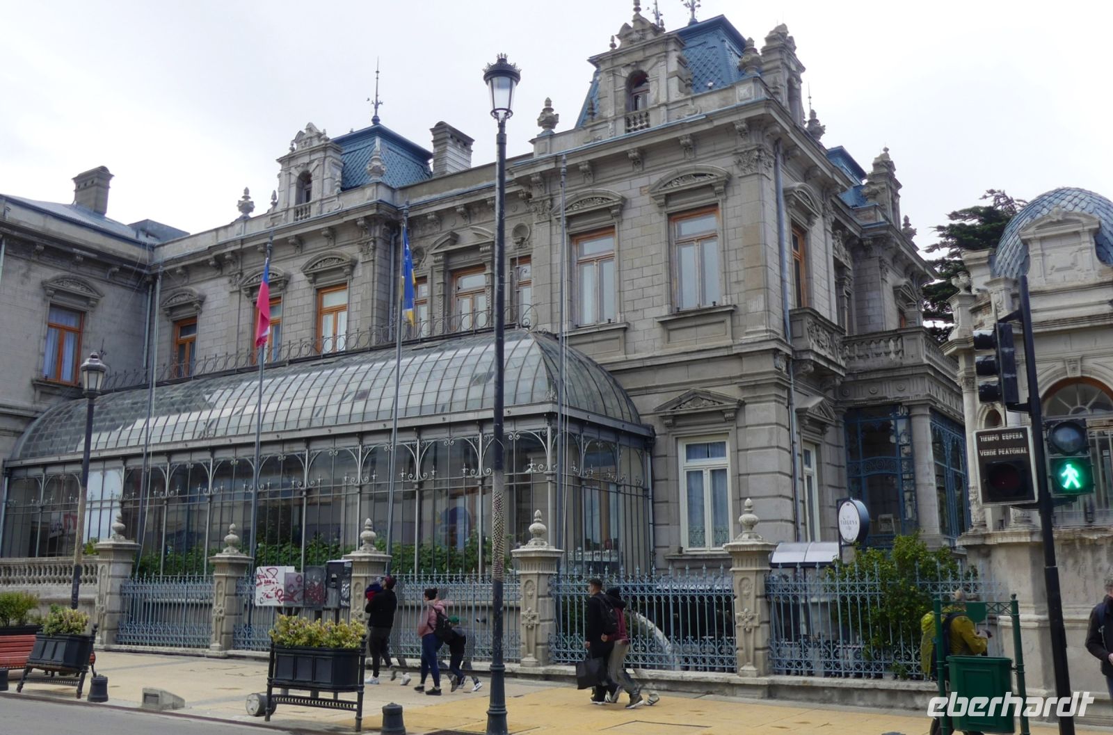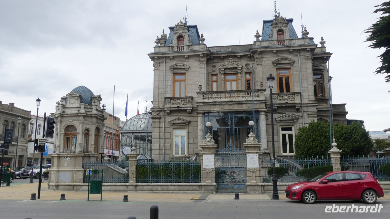 Ich treffe mich mit dem größten Teil der Gruppe nach dem Frühstück für unseren 8 Kilometer langen Stadtrundgang. Anfangs beim Tendern beobachten wir einige Delphine. Unsere erste Station ist der zentrale Platz Plaza de Armas mit dem Magellandenkmal und neoklassischer Bauten aus der Zeit um 1900. Reiche Schafsbarone hatten sich in Punta Arenas einen repräsentativen Sitz gebaut. Das bekannteste Gebäude darunter ist das Stadtpalais Jose´ Nogueira und Sara Braun. Vorbei an der Kathedrale erreichen wir über die Stufen die Anhöhe Cierra de la Cruz mit herrlichem Blick auf die Stadt, die Norwegian Sun sowie auf die Magellanstraße bis nach Feuerland.