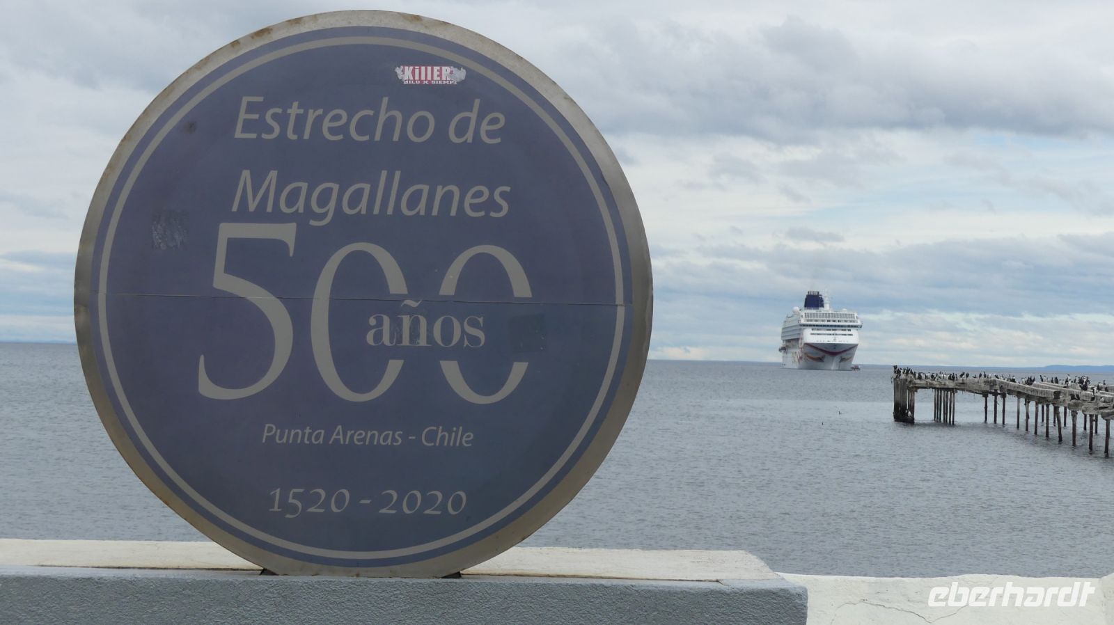 Das Wetter heute ähnelt dem gestrigen, es ist bewölkt und es gibt Schauer. Bevor wir die Magellanstraße erreichen, sind wir noch einige Stunden auf dem offenem Pazifik unterwegs. Bei der 12.00 Uhr-Durchsage des Kapitäns werden 4 Meter hohe Wellen angesagt, was nichts Ungewöhnliches ist. Ungewöhnlich ist, dass Magellan eine so ruhigen Ozean vorfand, dass er ihn „stillen Ozean“ (still, ruhig = pacifico) nannte. Das ist jetzt 504 Jahre her, dass Magellan als erster Europäer durch diese Wasserstraße fuhr. Irrtümlich wird Magellan in der Geschichtsschreibung als Weltumsegler bezeichnet. Tatsächlich ist er bei dieser Reise auf den Philippinen ums Leben gekommen. Von 242 Besatzungsmitgliedern, verteilt auf fünf Schiffe, überlebten nur 90 Männer. Darunter waren nur 18 Seeleute, die tatsächlich die Erde erstmals umrundeten17 weitere Männer kamen in portugiesische Gefangenschaft und 55 Seeleute kehrten bereits von Südamerika in ihre spanische Heimat zurück. . Nur eines der fünf Schiffe, die Victoria, hatte die Weltumsegelung geschafft. Mit der Entdeckung der Magellanstraße als die nördlichste Passage wurde dieser Seeweg bis zur Eröffnung des Panamakanals 1914 die wichtigste Route zwischen dem Atlantischem und dem Pazifischen Ozean.