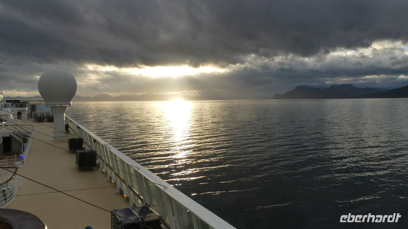 Abends wieder an Bord treffen sich die meisten wieder im Four Seasons. Zwei Gäste berichten uns uns von ihrem Kayak Ausflug. In der Nacht verlassen wir für einige Stunde die geschützte Inselwelt, so dass es etwas schaukelt. Wer seine Schranktüren auf der Kabine nicht geschlossen hat, muss das jetzt nachholen.