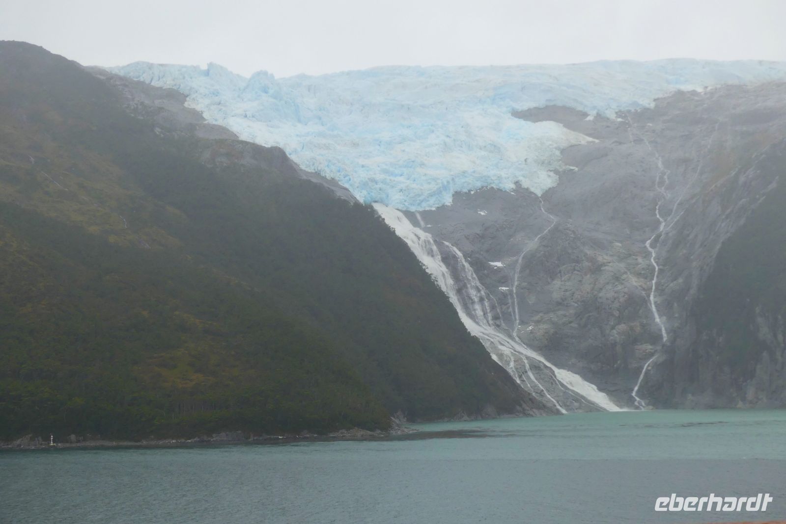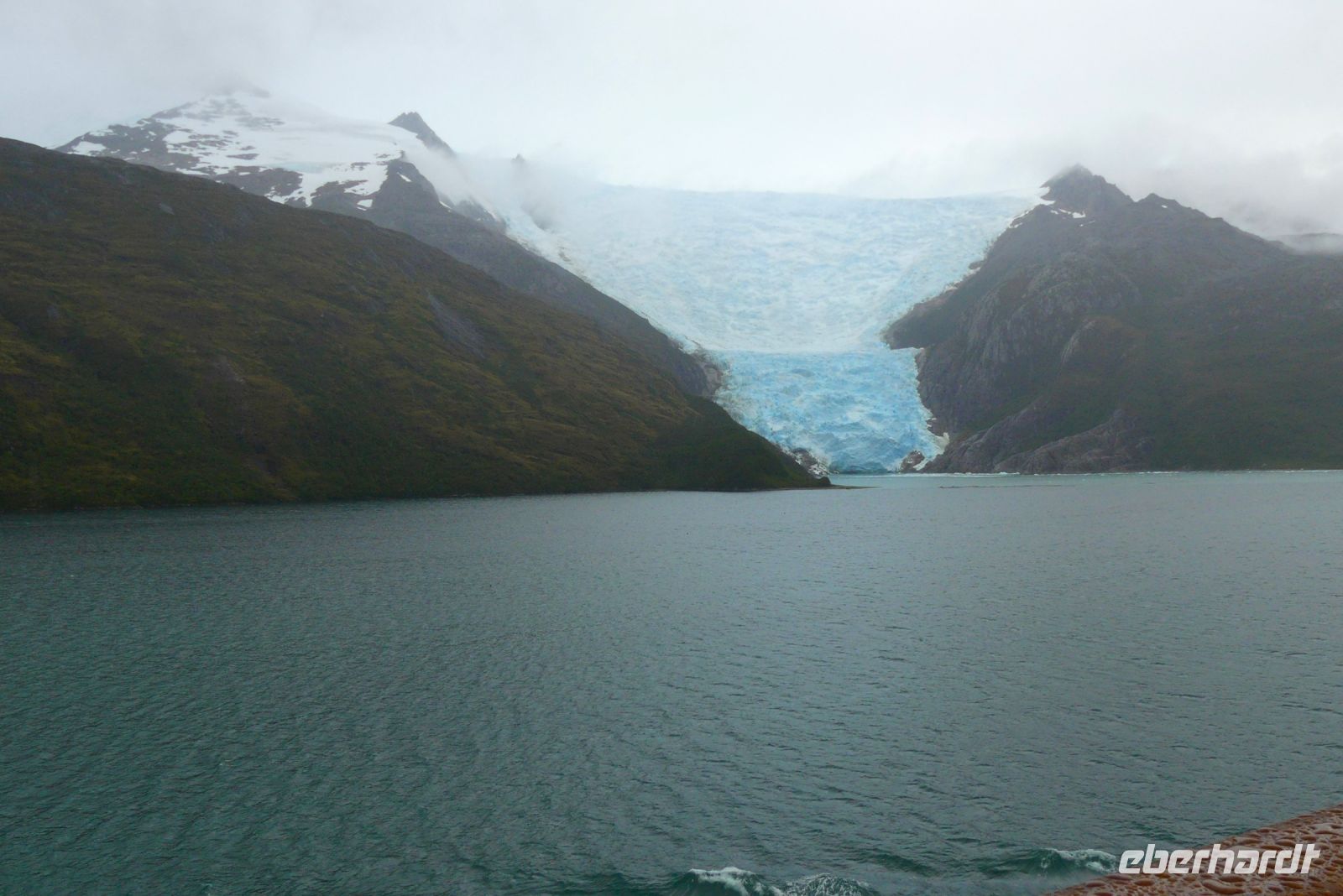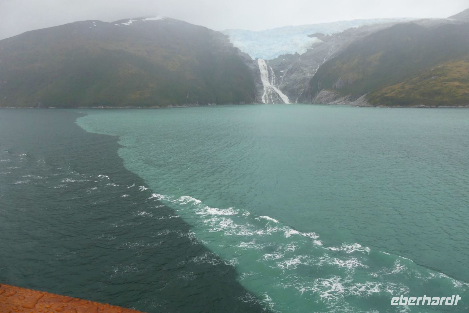 In der Bordzeitung gibt es keine Information, wann wir den Beagle Kanal erreichen. Laut Offizier Andreas wird das gegen 6.00 Uhr am Morgen sein. Etwa zweieinhalb Stunden lang passieren wir eine ganze Reihe von Gletschern. Nach und nach wird auch das Wetter besser und der leichte Regen hört auf. Die markantesten Gletscher tragen europäische Namen wie España, Romantie, Alemania, Francia, Italia und Holanda. Das Gletschereis leuchtet in weißen und blauen Farbtönen. Besonders am Alemania Gletscher stürzen große Mengen Schmelzwasser in den Beagle Kanal. Das Süßwasser der Gletscher und das Salzwasser sind im Beagle Kanal an ihren verschiedenen Farben gut zu unterscheiden. Der wohl imposanteste Gletscher ist der Italia, weil dieser bis an die Meeresoberfläche reicht, was weltweit inzwischen eine seltene Erscheinung ist.