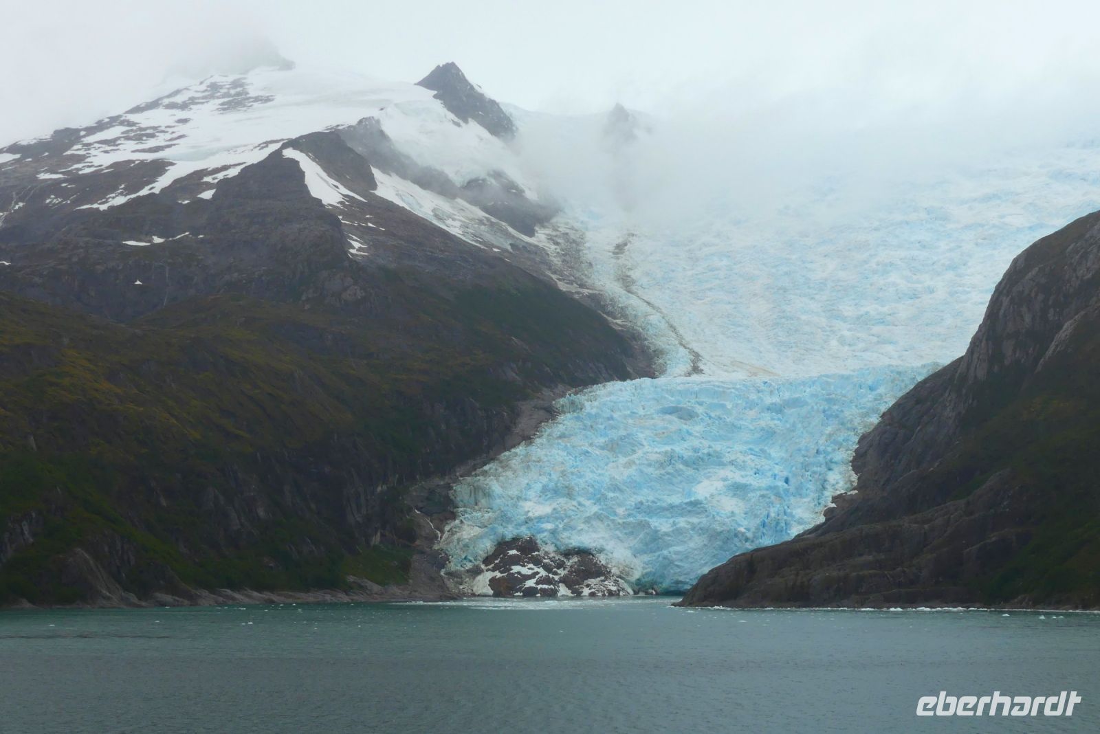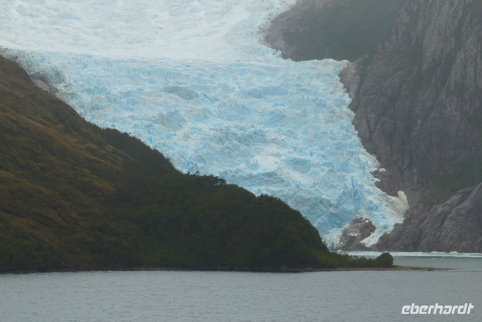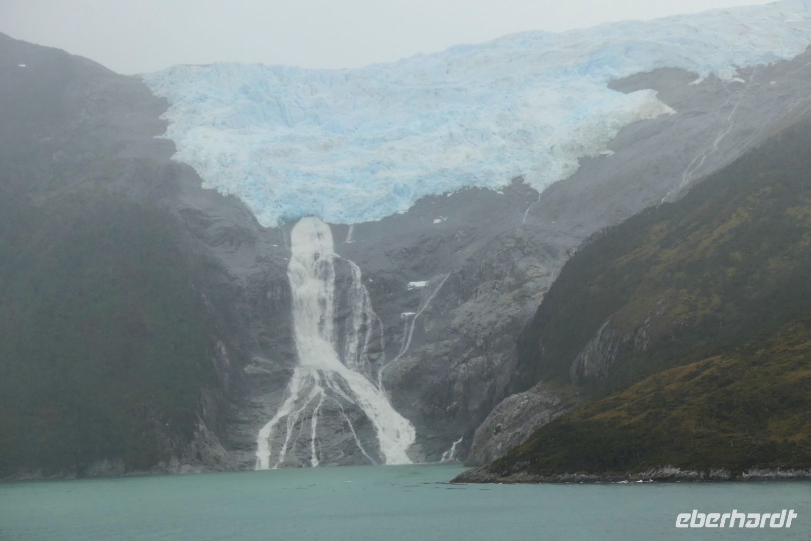 In der Bordzeitung gibt es keine Information, wann wir den Beagle Kanal erreichen. Laut Offizier Andreas wird das gegen 6.00 Uhr am Morgen sein. Etwa zweieinhalb Stunden lang passieren wir eine ganze Reihe von Gletschern. Nach und nach wird auch das Wetter besser und der leichte Regen hört auf. Die markantesten Gletscher tragen europäische Namen wie España, Romantie, Alemania, Francia, Italia und Holanda. Das Gletschereis leuchtet in weißen und blauen Farbtönen. Besonders am Alemania Gletscher stürzen große Mengen Schmelzwasser in den Beagle Kanal. Das Süßwasser der Gletscher und das Salzwasser sind im Beagle Kanal an ihren verschiedenen Farben gut zu unterscheiden. Der wohl imposanteste Gletscher ist der Italia, weil dieser bis an die Meeresoberfläche reicht, was weltweit inzwischen eine seltene Erscheinung ist.