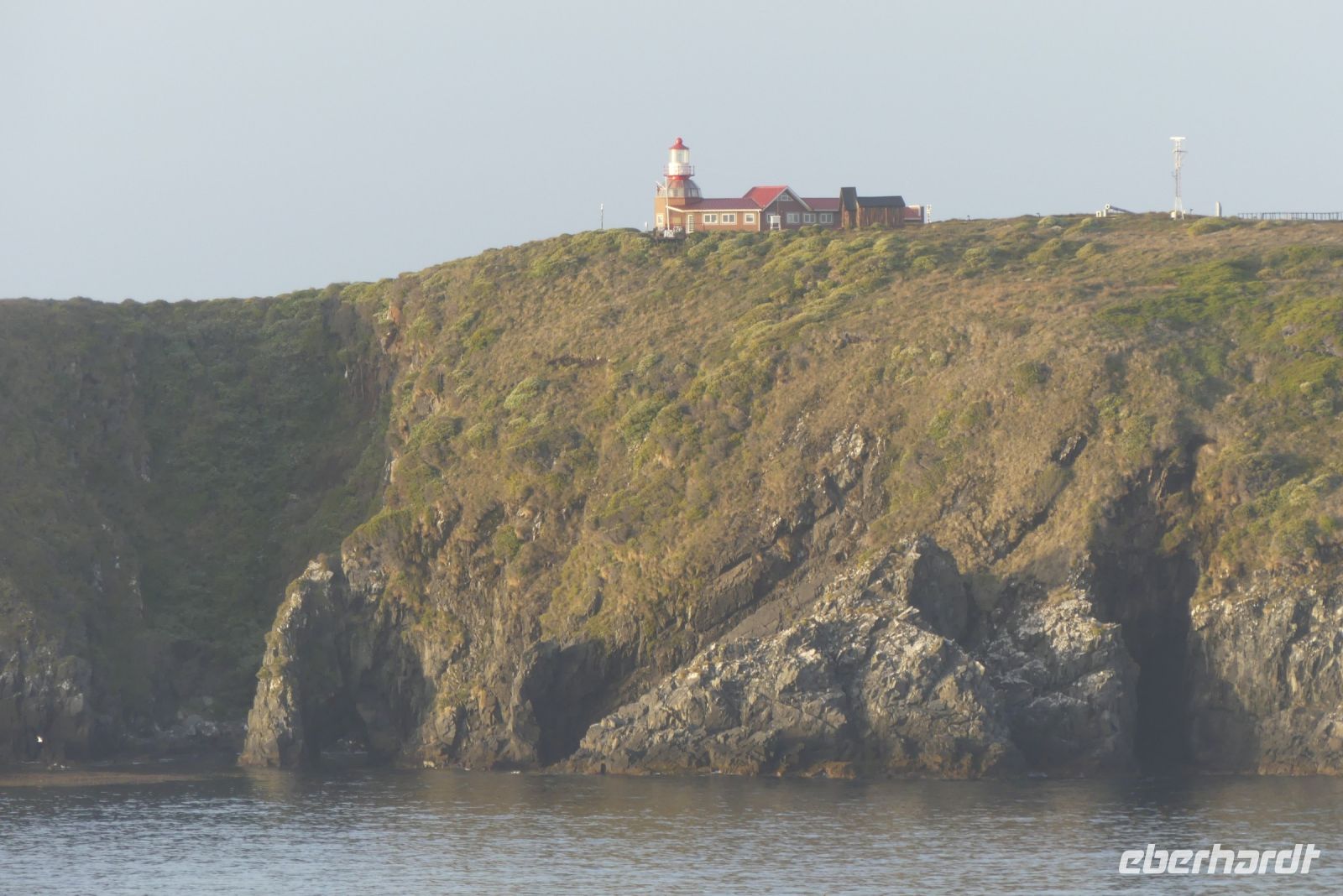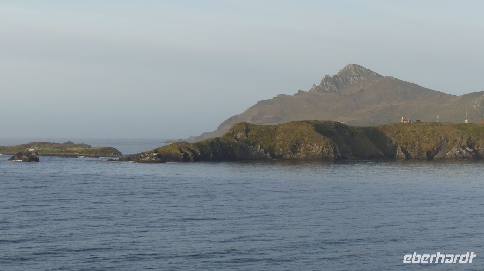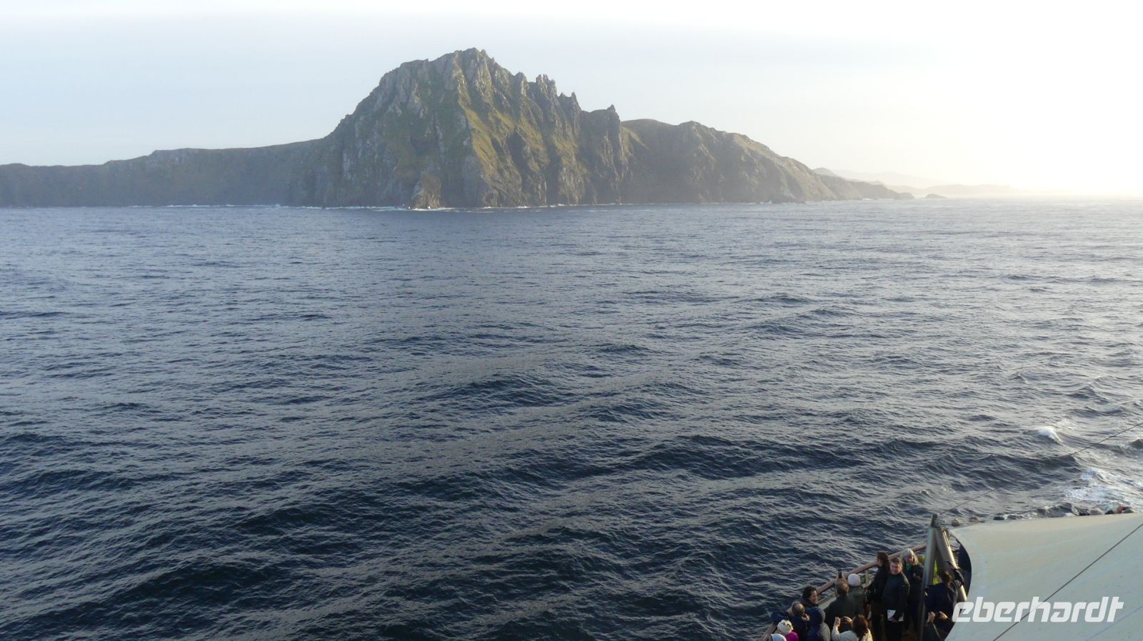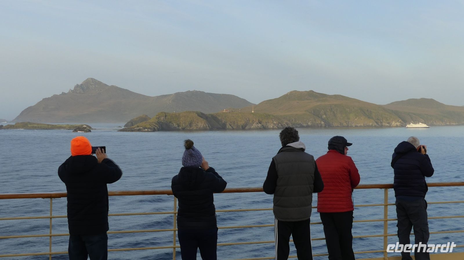 Kap Hoorn, sturmumwobenes Kap, gefürchtete Schiffspassage, raues Klima, aufgewühlte See…das sind Beschreibungen von Kap Hoorn, welche heute mal nicht zutreffen. Wir haben die Sonne von Ushuaia mitgenommen und den Wind dort gelassen. Kurz nach Sonnenaufgang meldet sich um 5.50 Uhr der Bordfunk und kündigt an, dass wir den südlichsten Punkt Amerikas erreichen. Etwa eine Stunde hält sich die Norwegian Sun vor der Isla Hornos („Insel Horn“) auf. Mit dem Wetter haben wir richtig Glück. Die See ist sehr ruhig, nur ein leichter Wind streift uns und die Sonne scheint. Wenn jetzt noch ein Wal auftauchen würde…ja auch ein Wal zeigt sich ??. Wir haben wirklich ausgesprochenes Glück, Kap Hoorn so erleben zu können. Wir befinden uns jetzt am südlichsten Punkt unserer Reise, in der Drakestraße wo sich Südpolarmeer, Pazifischer und Atlantische Ozean vereinen. Heute wäre sogar die gefürchtete Passage der Drakestraße bis zu den nördlichsten Ausläufern der Antarktis eine ruhige Angelegenheit. Damit wir auch wirklich den südlichsten Punkt Amerikas erreichen, fahren wir vom Bereich des Leuchtturms noch zur südlichsten Inselspitze, ein mächtiger, fast senkrecht abfallender Berg. Die Stelle wird als Ende der Welt bezeichnet. Wir sind jetzt über 14.000 Kilometer von der Heimat entfernt. Bis zu den nördlichsten Ausläufern der Antarktis sind es noch ca. 650 Kilometer.