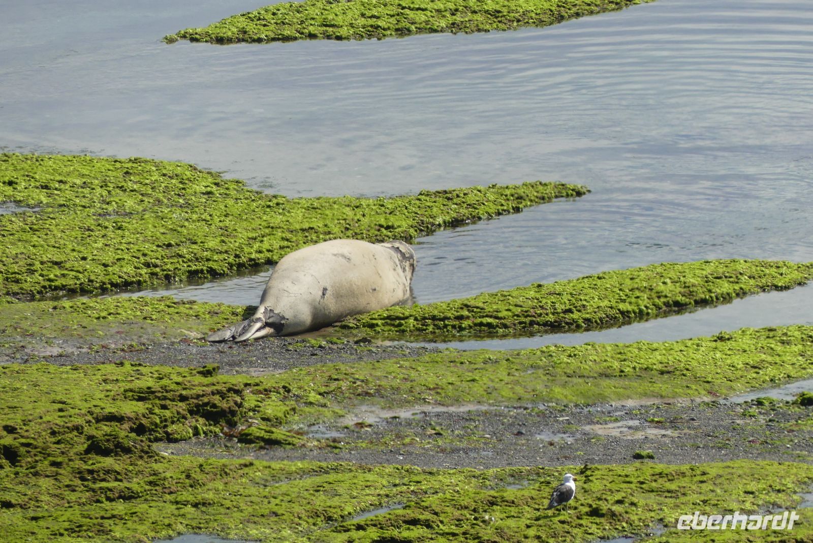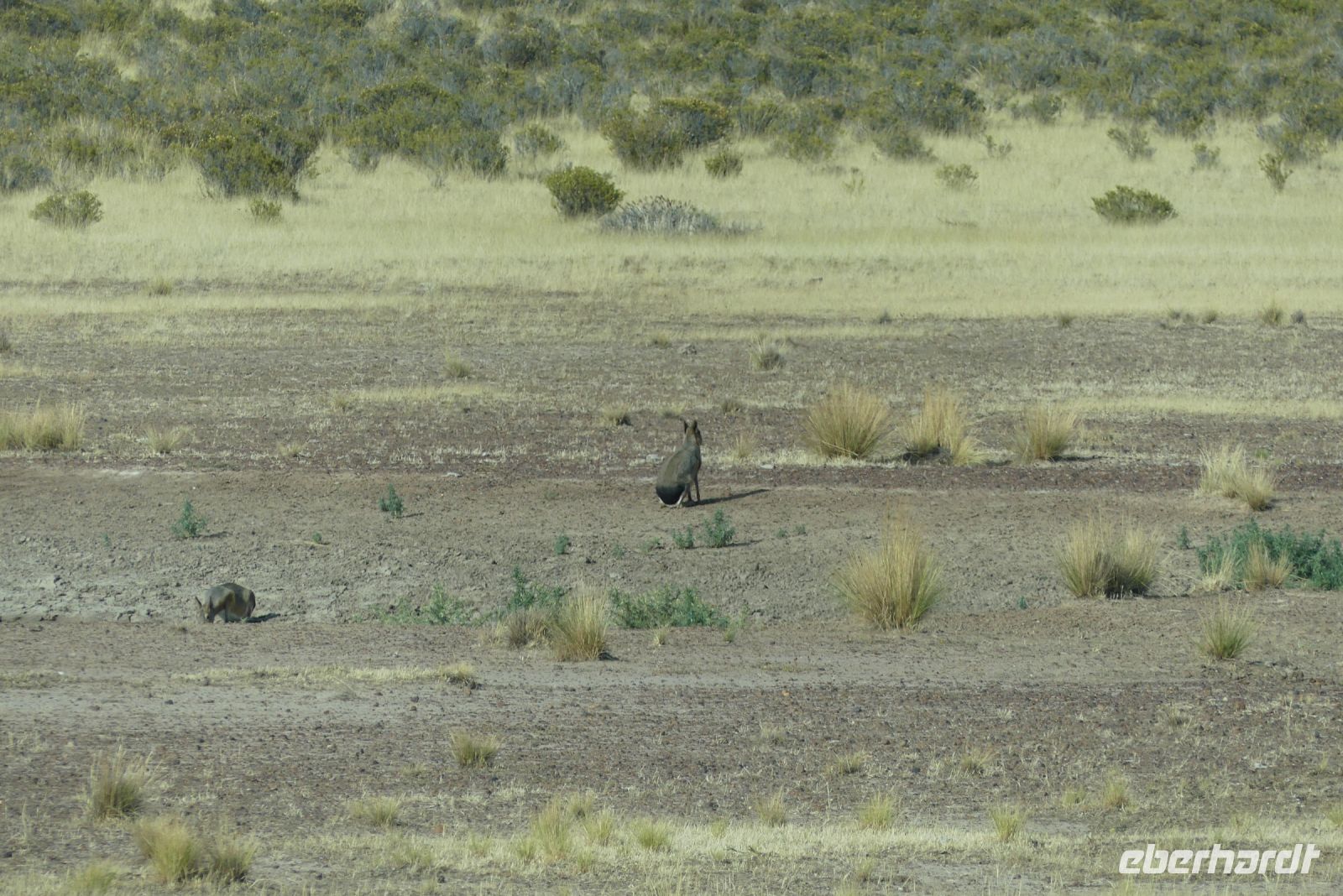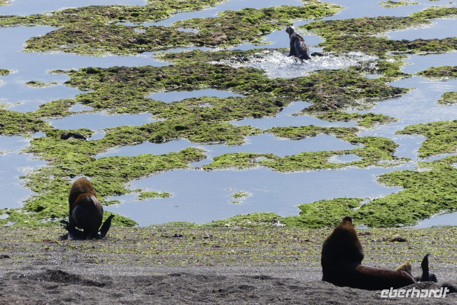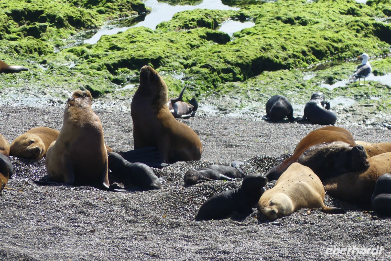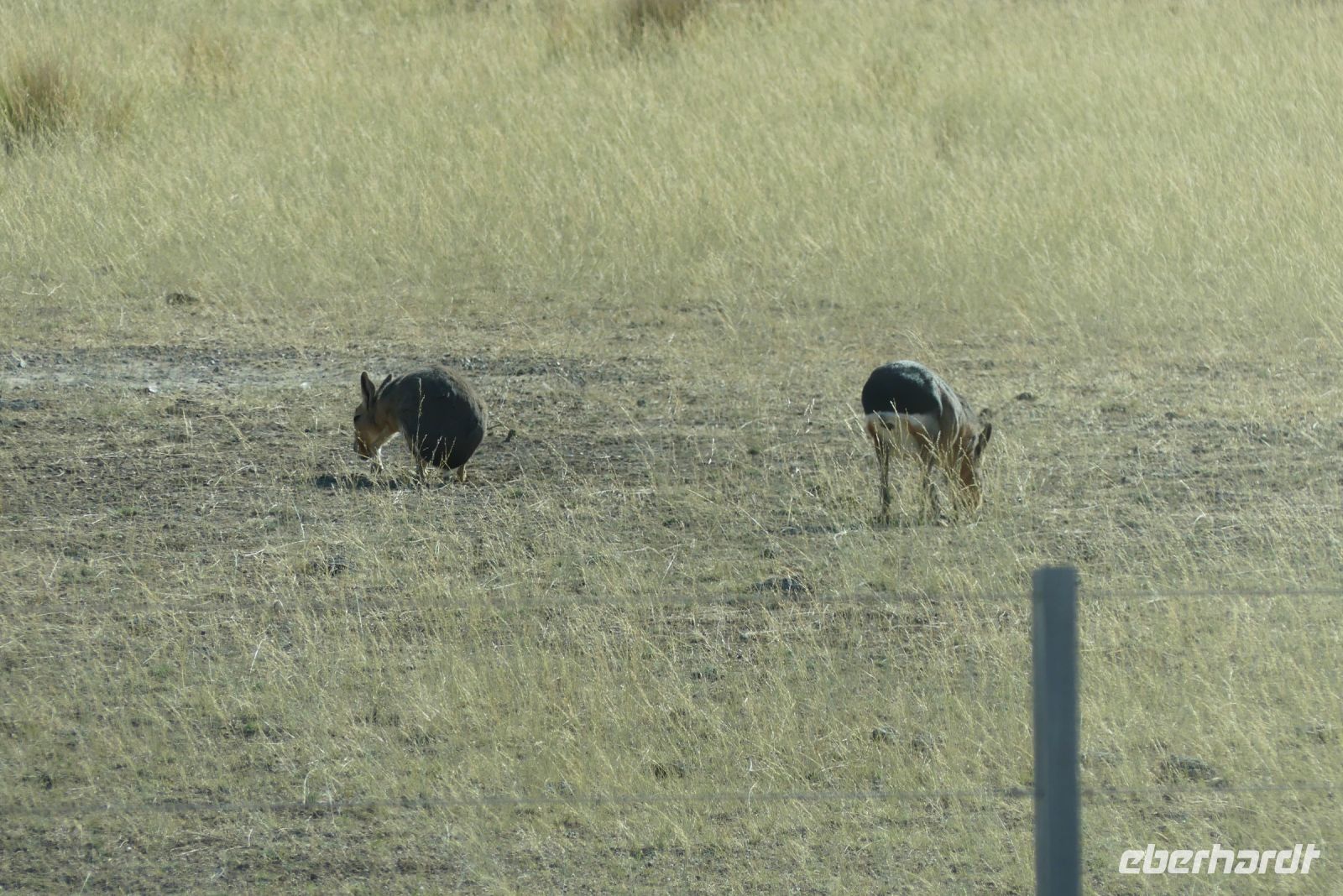 Zuerst halten wir am Informationszentrum an der Zufahrt zur Halbinsel. Blickfang hier ist ein großes Walskelet. Auch auf das traurige Kapitel, dass früher von Menschen mehr als 260.000 Seelöwen getötet wurden, um ihr Fell und Fett zu vermarkten, wird hier eingegangen. Heute stehen die Seelöwen unter Schutz. Am nördlichsten Punkt der Halbinsel = Punta Norte sehen wir dann auch eine große Kolonie von Seelöwen am Strand. Auch einige Seeelefanten sind zu sehen. Die Fahrt zu Punta Norte selbst war wie eine kleine Safari – häufig waren Guanakos sowie Maras und Nandus zu sehen.