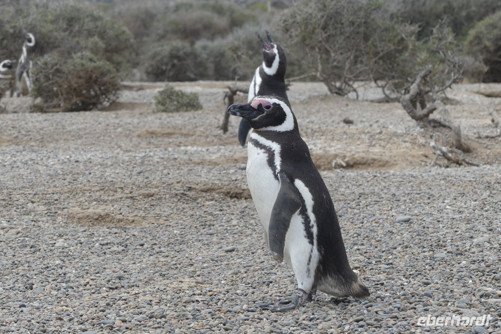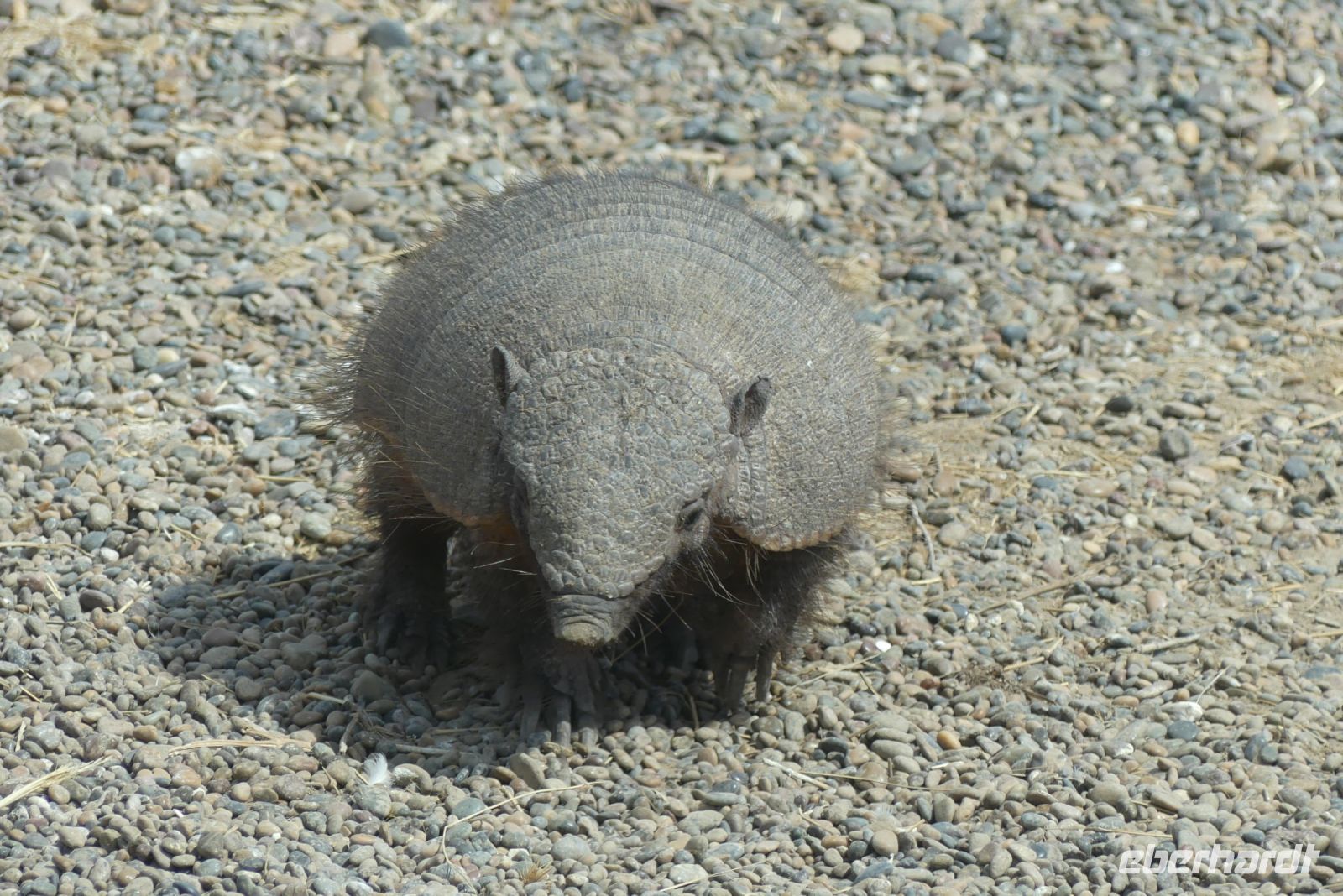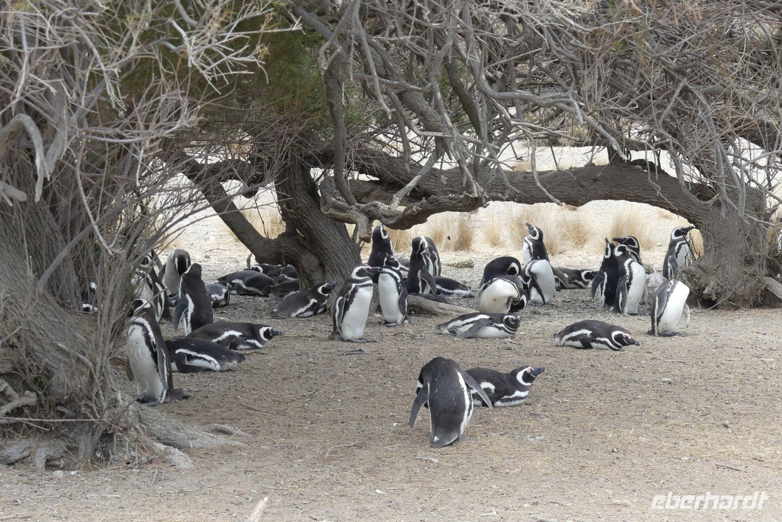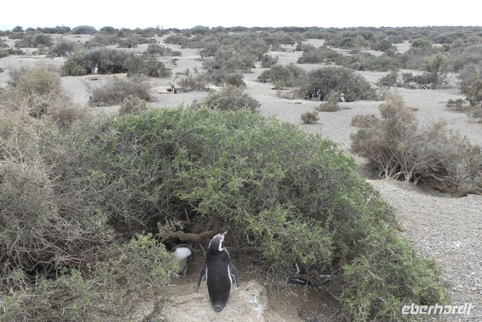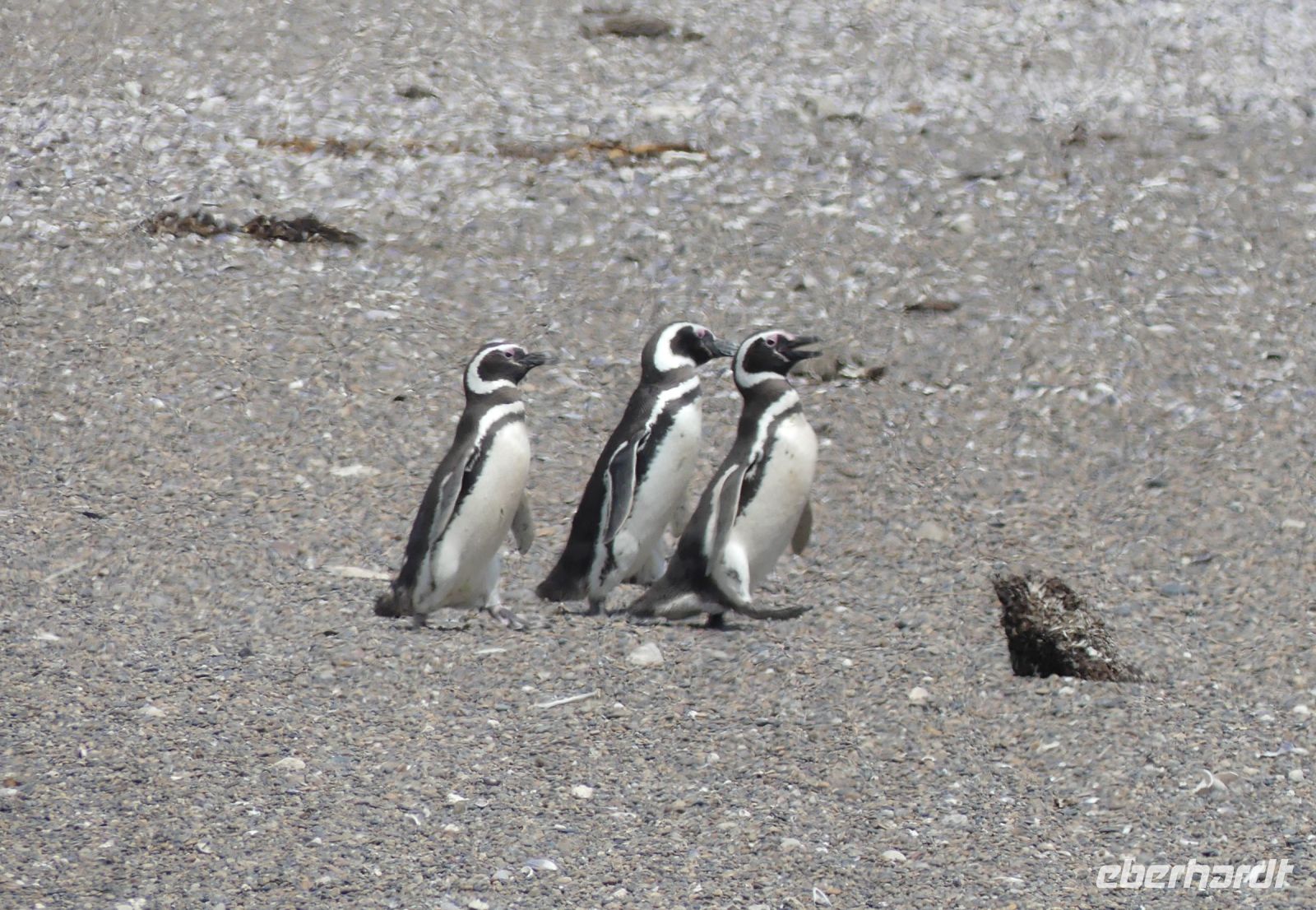 Höhepunkt unseres Ausfluges ist der Besuch der weltgrößten kontinentalen Magellanpinguinkolonie. Am Nordufer in der Nähe der Estancia San Lorenzo sollen sich jedes Jahr ca. 400.000 Brutpaare entlang des 7-8 Kilometer langen Strandes einfinden. Zuerst kommen im August/September die Männchen an Land. Man hat herausgefunden, dass sie das alte Nest vom Vorjahr aufsuchen. Wenn die Jungen aufgezogen werden, werden die Eltern täglich 70 bis 100 Kilometer im Wasser zurücklegen, um die Hauptnahrung Anchovis heranzuschaffen. Bei unserer Zufahrt zur Pinguinkolonie können wir ein Gürteltier beobachten. In der Kolonie selbst laufen wir auf einem markiertem Pfad ganz dicht an den Pinguinen und ihren Nestern entlang. Rancher passen auf, dass ein paar Regeln eingehalten werden wie zum Beispiel „Vorfahrt“ für Pinguine wenn sie den Pfad queren oder zum Strand laufen wollen. Keiner von uns hätte gedacht, dass wir so nah an die Magellanpinguine heran können. Es ist ein tolles Erlebnis. Und wir müssen auch kein schlechtes Gewissen haben, dass unser Besuch schaden könnte – ganz im Gegenteil: unsere Anwesenheit schreckt natürliche Feinde der Pinguine wie Möwen, Füchse etc. ab und trägt zu einer höheren Überlebensquote bei.