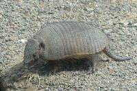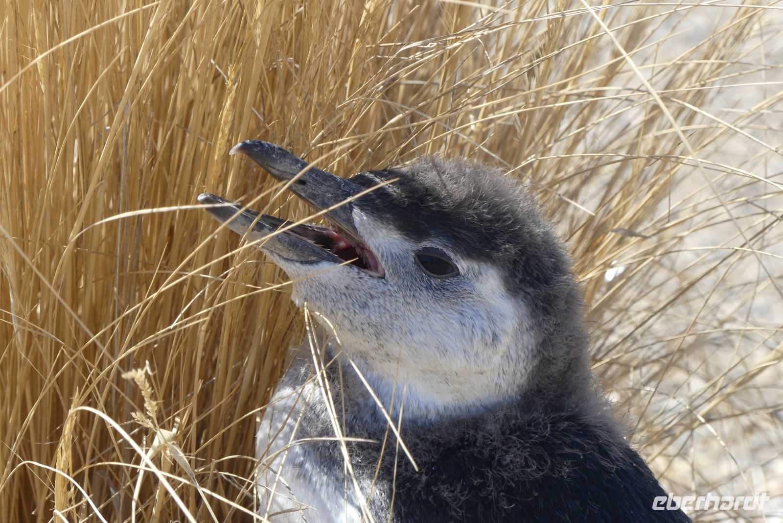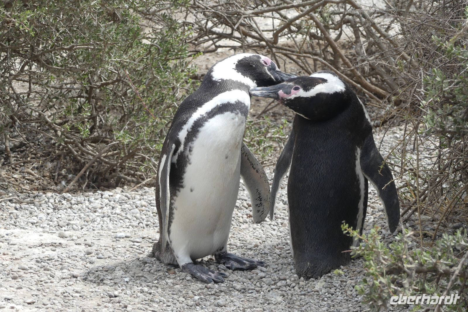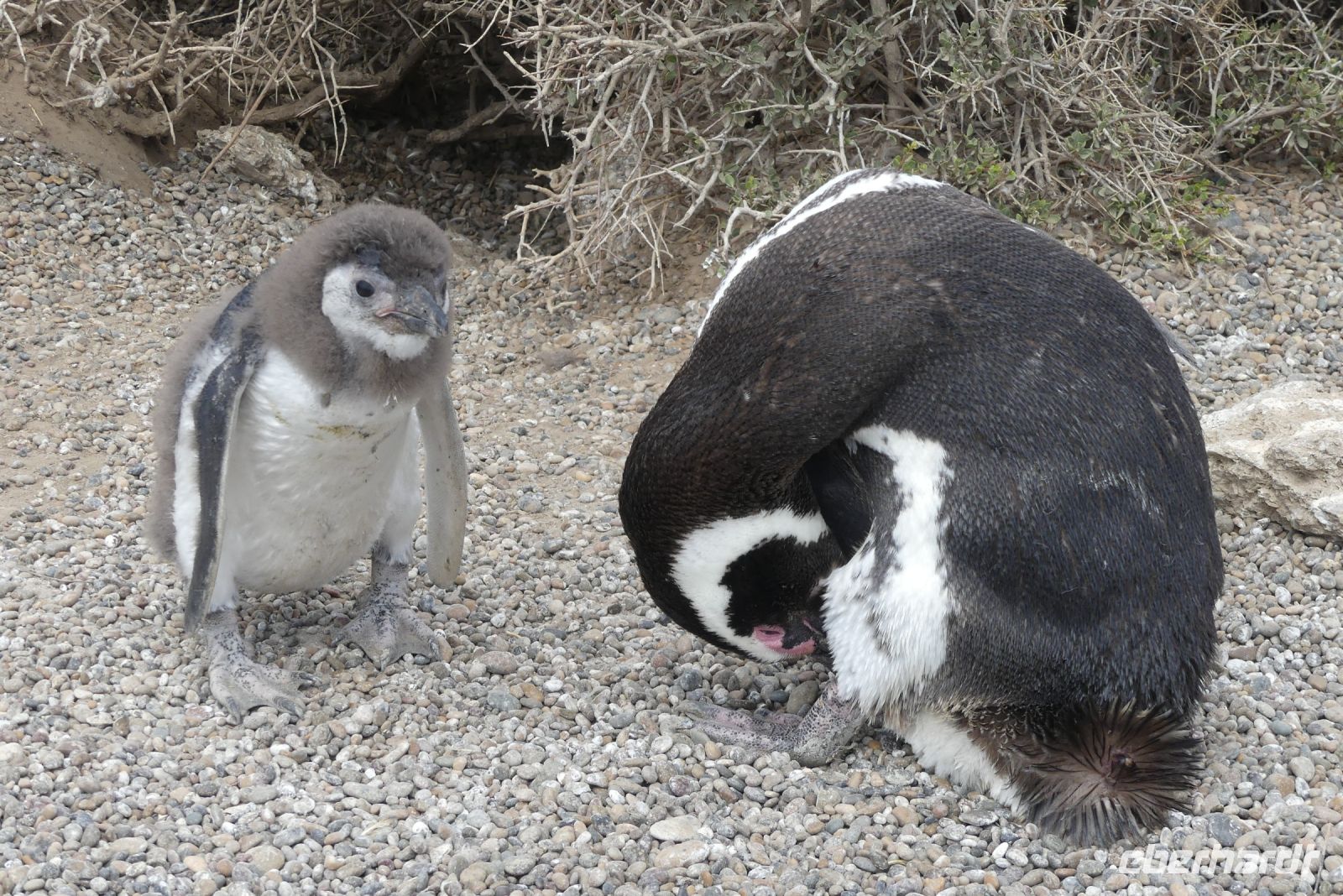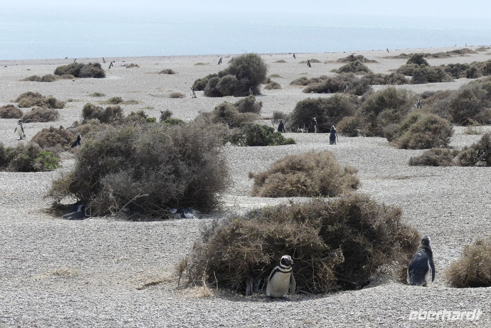 Höhepunkt unseres Ausfluges ist der Besuch der weltgrößten kontinentalen Magellanpinguinkolonie. Am Nordufer in der Nähe der Estancia San Lorenzo sollen sich jedes Jahr ca. 400.000 Brutpaare entlang des 7-8 Kilometer langen Strandes einfinden. Zuerst kommen im August/September die Männchen an Land. Man hat herausgefunden, dass sie das alte Nest vom Vorjahr aufsuchen. Wenn die Jungen aufgezogen werden, werden die Eltern täglich 70 bis 100 Kilometer im Wasser zurücklegen, um die Hauptnahrung Anchovis heranzuschaffen. Bei unserer Zufahrt zur Pinguinkolonie können wir ein Gürteltier beobachten. In der Kolonie selbst laufen wir auf einem markiertem Pfad ganz dicht an den Pinguinen und ihren Nestern entlang. Rancher passen auf, dass ein paar Regeln eingehalten werden wie zum Beispiel „Vorfahrt“ für Pinguine wenn sie den Pfad queren oder zum Strand laufen wollen. Keiner von uns hätte gedacht, dass wir so nah an die Magellanpinguine heran können. Es ist ein tolles Erlebnis. Und wir müssen auch kein schlechtes Gewissen haben, dass unser Besuch schaden könnte – ganz im Gegenteil: unsere Anwesenheit schreckt natürliche Feinde der Pinguine wie Möwen, Füchse etc. ab und trägt zu einer höheren Überlebensquote bei.