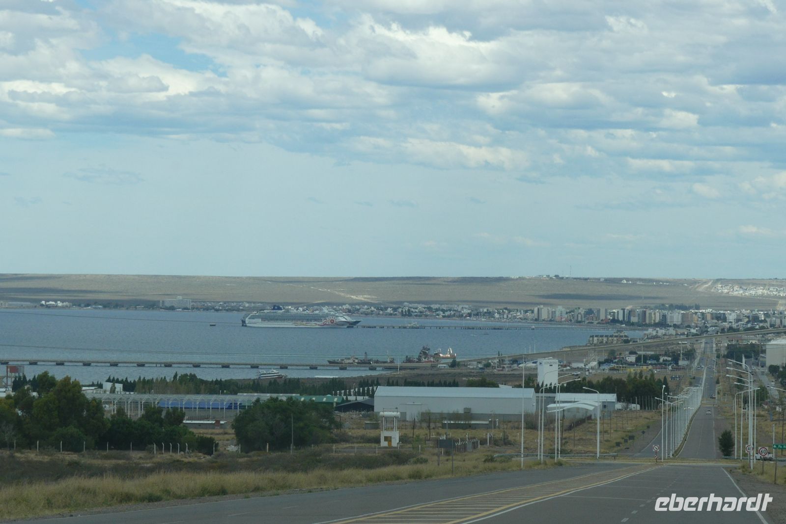 Wir liegen an der langen Pier von Puerto Madryn. Nach einem schönen Sonnaufgang gehen wir am frühen Morgen von Bord. Wir werden von Andreas und Roby empfangen, die örtlichen Reiseleiter für unseren Eberhardt-Exklusivausflug. Wir verteilen uns auf zwei Kleinbusse, welche für die Pisten der Halbinsel Valdes besser geeignet sind als ein großer Bus.