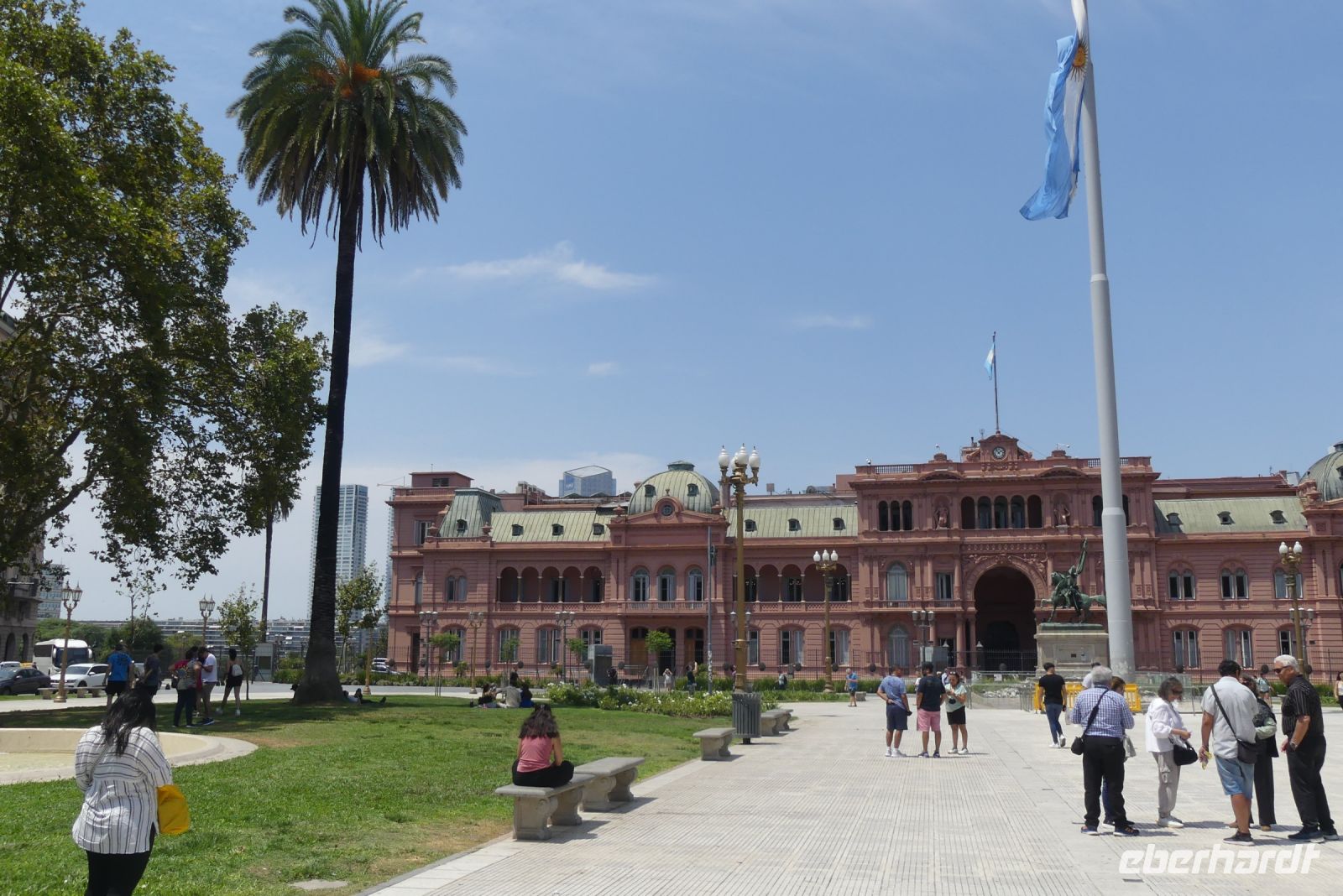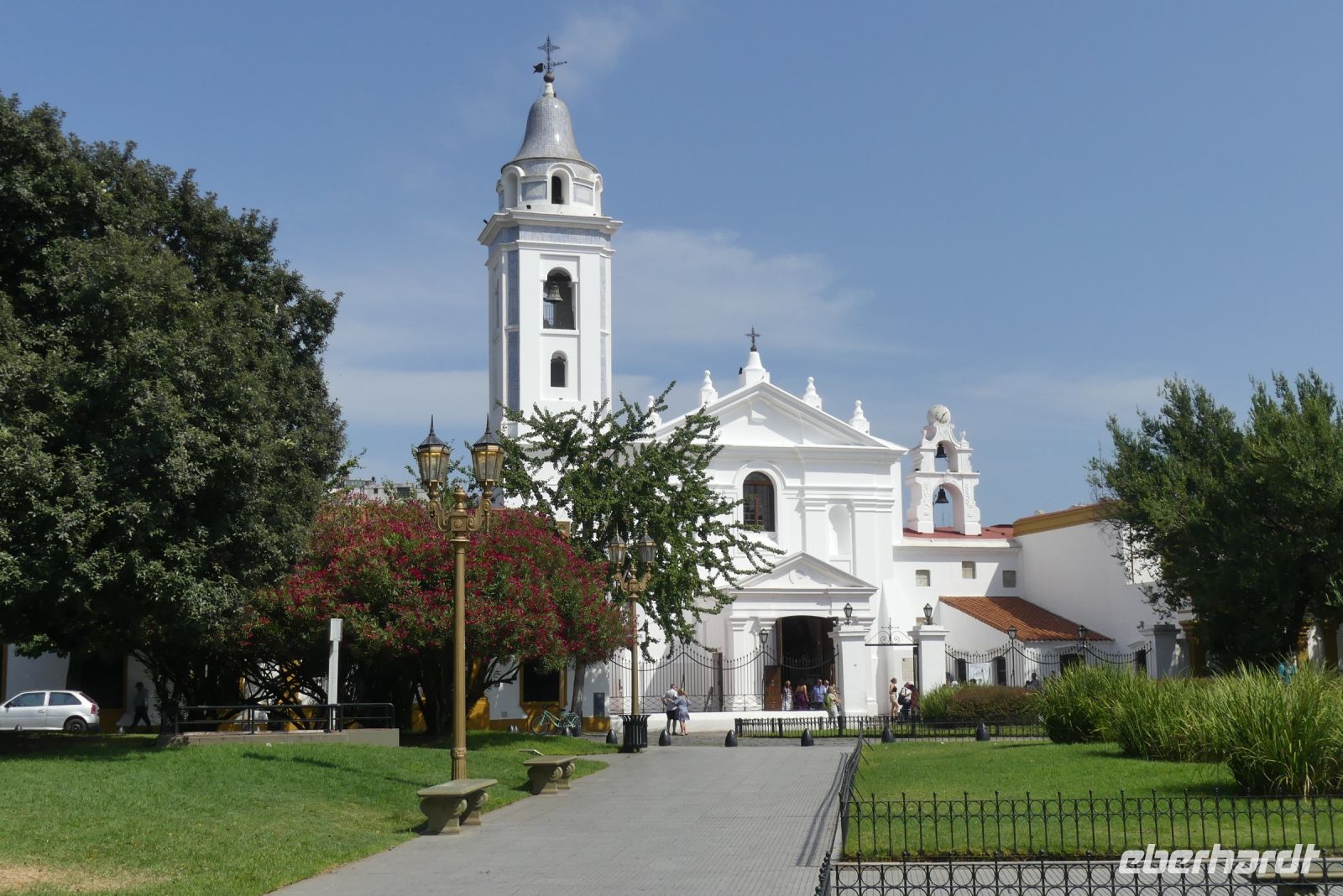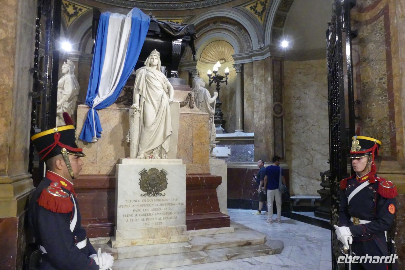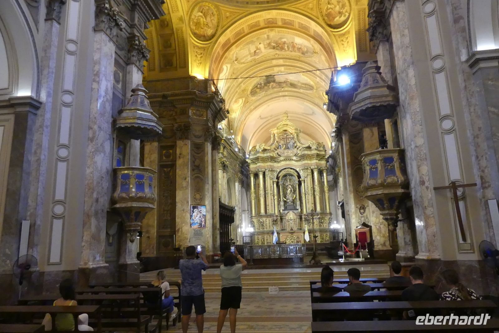 Schließlich kommen wir noch zum zentralen Platz Plaza de Mayo, mit dem Regierungssitz Casa Rosada, Zentralbank, Rathaus und der Kathedrale. Die Kathedrale ist als solche von außen nicht zu erkennen, da ihr Äußeres einem griechischen Tempel mit korinthischen Säulen gleicht. Innen hat der Nationalheld San Martin ein Mausoleum erhalten. Er hat neben Argentinien auch Peru und Chile die Unabhängigkeit von den Spaniern gebracht.