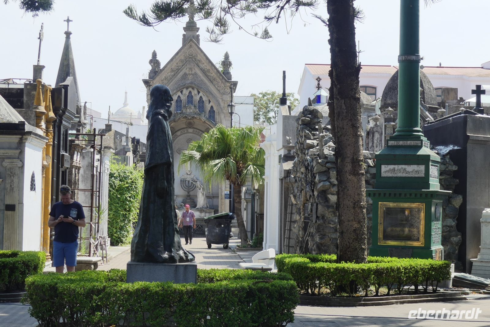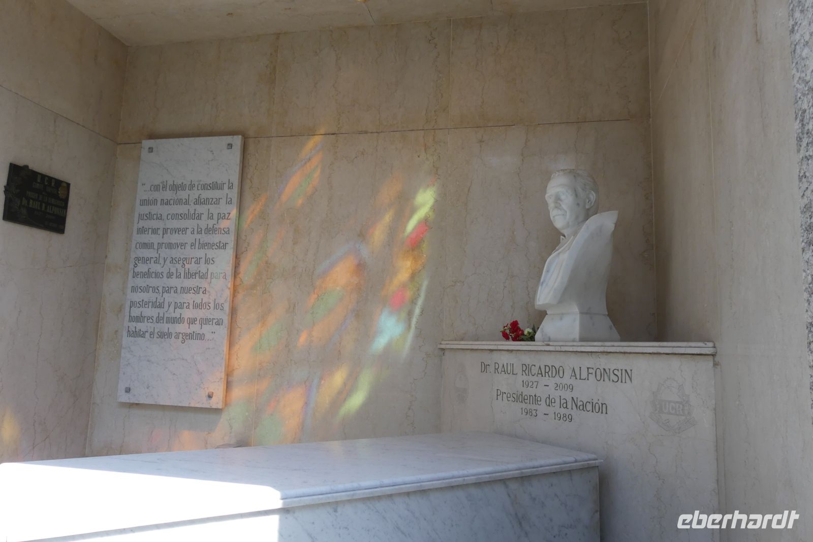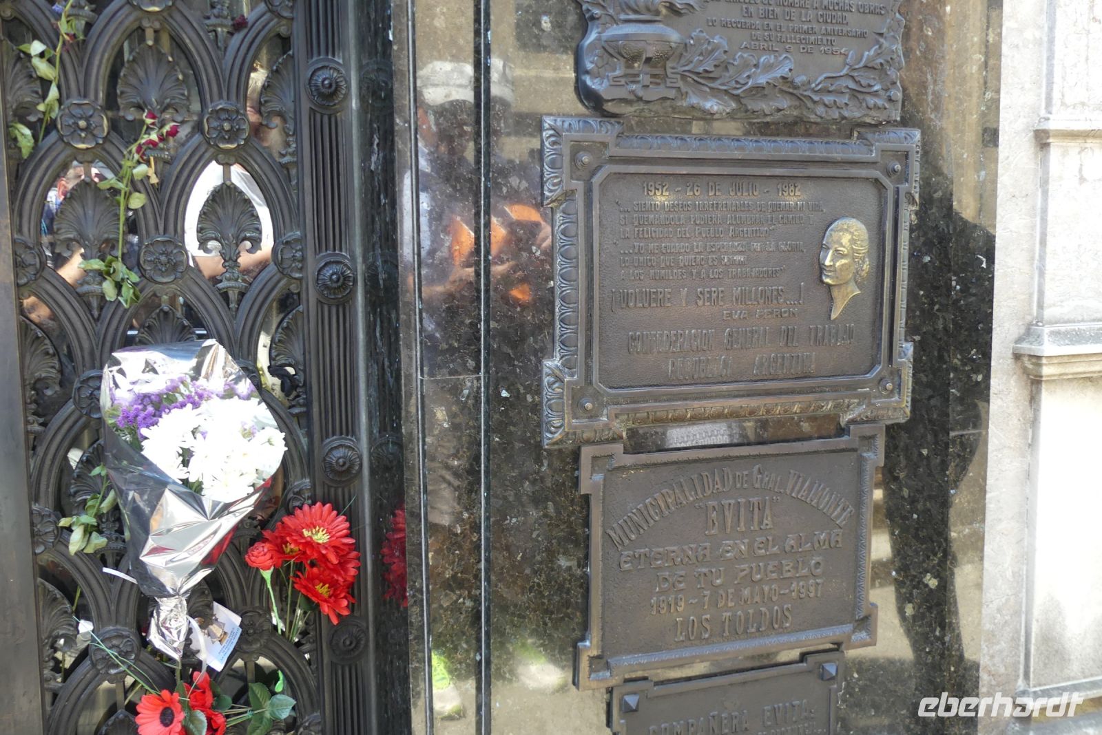 Wir fahren zunächst in den Stadtteil Recoletta. La Recoletta ist vor allem durch seinen bemerkenswerten Friedhof mit monumentalen Gräbern wichtiger Familien bekannt. Die Gräber wurden aus Naturstein wie zum Beispiel Marmor aus Italien gebaut. Zwei Gräbern mit bekannten Persönlichkeiten gilt unsere besondere Aufmerksamkeit: zunächst sind wir am Grab von Dr. Paul Raúl Alfonsín, argentinischer Präsident von 1983 bis 1989. Sylvia erzählt, wie beliebt er bei den Argentinien war. Dann kommen wir zum Grab von Eva Maria Duarte de Perón, genannt Evita. Sie war Schauspielerin und nach Heirat des späteren Präsidenten Juan Perón einflussreiche Politikerin, die sich für Frauenrechte und Rechte Bedürftiger einsetzte. Sie wurde deshalb von den unteren Schichten besonders verehrt. Evita wurde nur 33 Jahre alt.