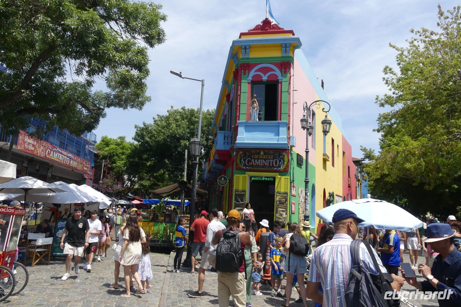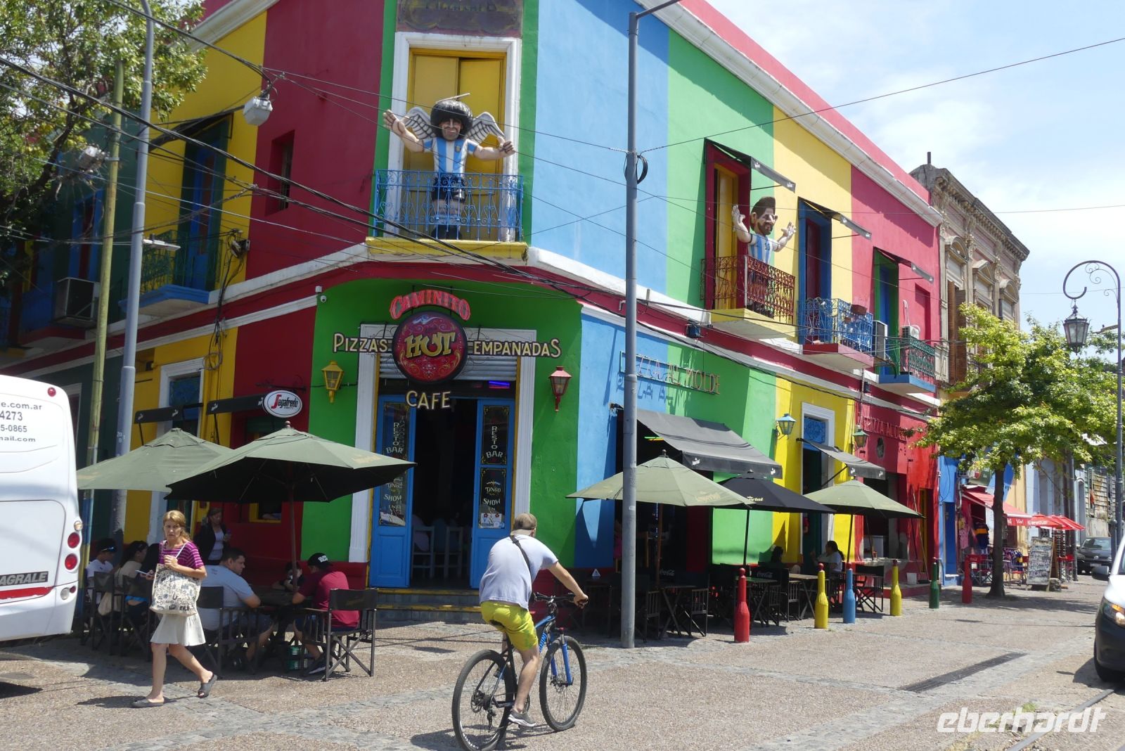 Wir fahren weiter durch die Millionenstadt über die Avenida de 9 Julio mit Obelisken, Justizpalast und Opernhaus. In der Nähe ziert Evitas Bild eine Hochhauswand. Über Mittag bleiben wir in La Boca, ein Viertel, welches durch italienischer Einwanderer gegründet wurde. Heute ist es bekannt für viele bunte Fassaden, Figuren auf Balkonen, vor Lokalen und an Fenstern. La Boca ist Heimat des Fußballclubs Boca Juniors. Die Fußballbegeisterung ist in den Gassen zu spüren, besonders Messi als WM-Held wird verehrt und ist als Figur allgegenwärtig.