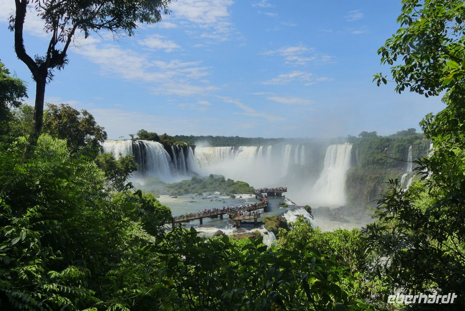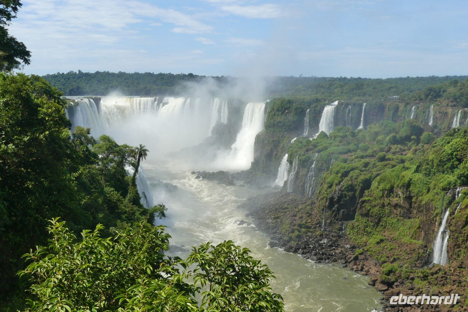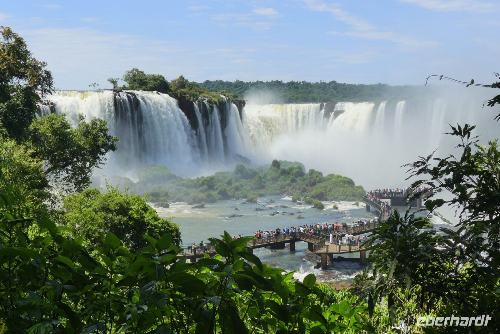 Bis Mittag haben wir ausreichend Zeit, um in aller Ruhe die brasilianischen Seite die Wasserfälle zu besichtigen. Die Temperaturen sind etwas verträglicher als gestern. Zwar hat Brasilien den kleineren Anteil an den Wasserfällen, aber dafür den Panoramablick auf die argentinischen Kaskaden und auf Garganta del Diablo, den Teufelsschlund. Deshalb empfinden wir die brasilianische Seite auch noch schöner. Auf dem ca. 1,5 km langen Wanderweg muss man einfach immer wieder die Kamera zücken, denn es sind einfach wunderschöne Motive aus sich ändernden Perspektiven. Wir erkennen sehr gut die Laufstege und Aussichtspunkte, welche wir gestern auf der argentinischen Seite besucht haben. Der spektakulärste Teil des Wanderweges führt in die Mitte des Flusstales heran an den Teufelsschlund. Spätestens hier wird wohl jedem klar, dass wir uns an einem der größten Naturwunder der Erde befinden.