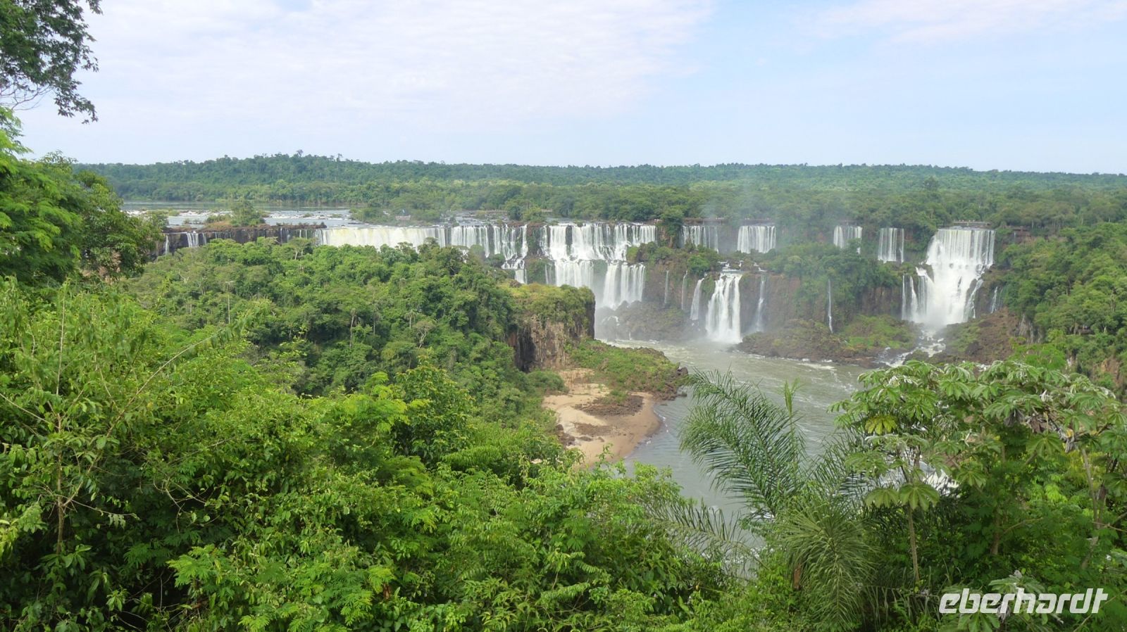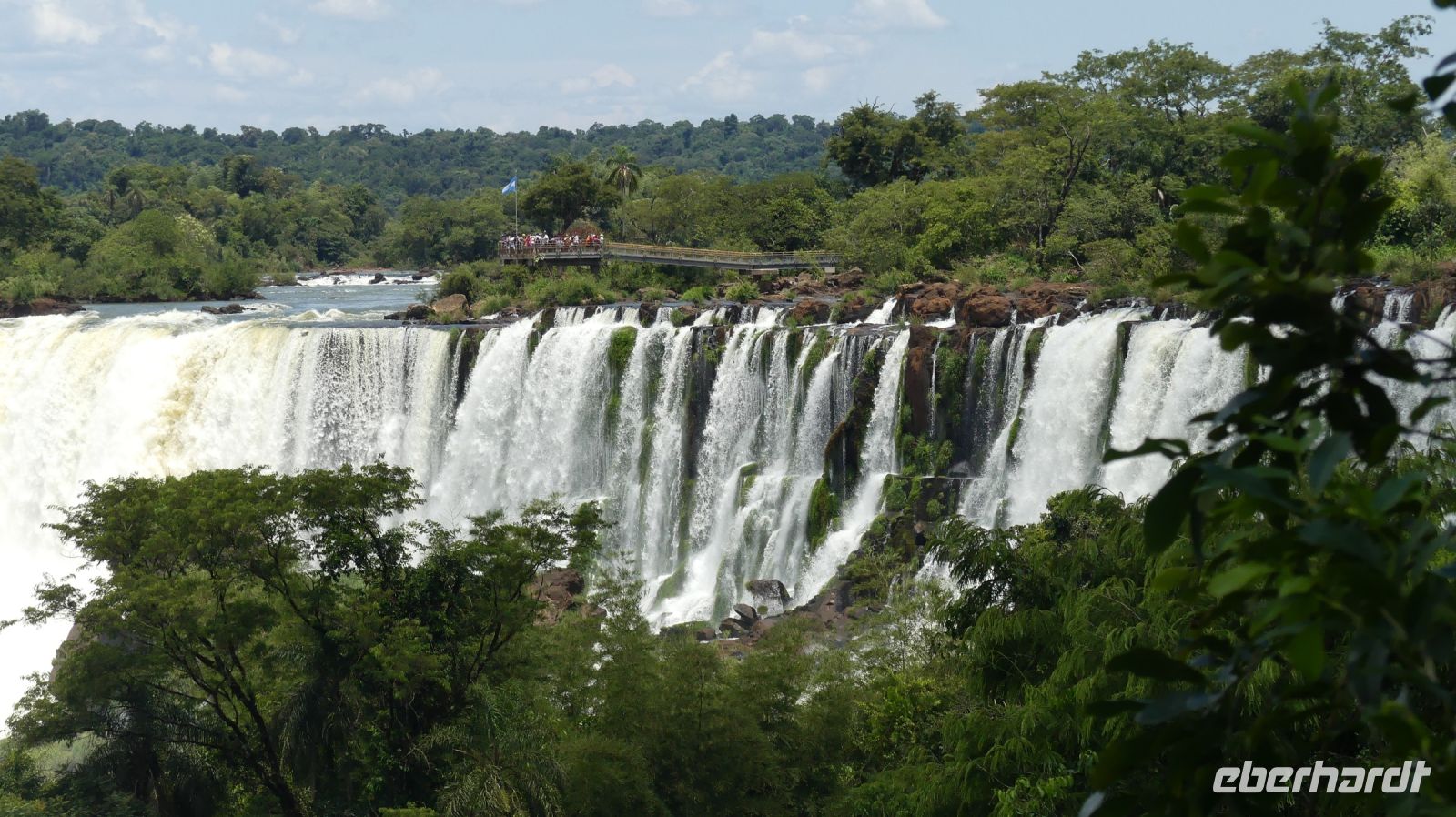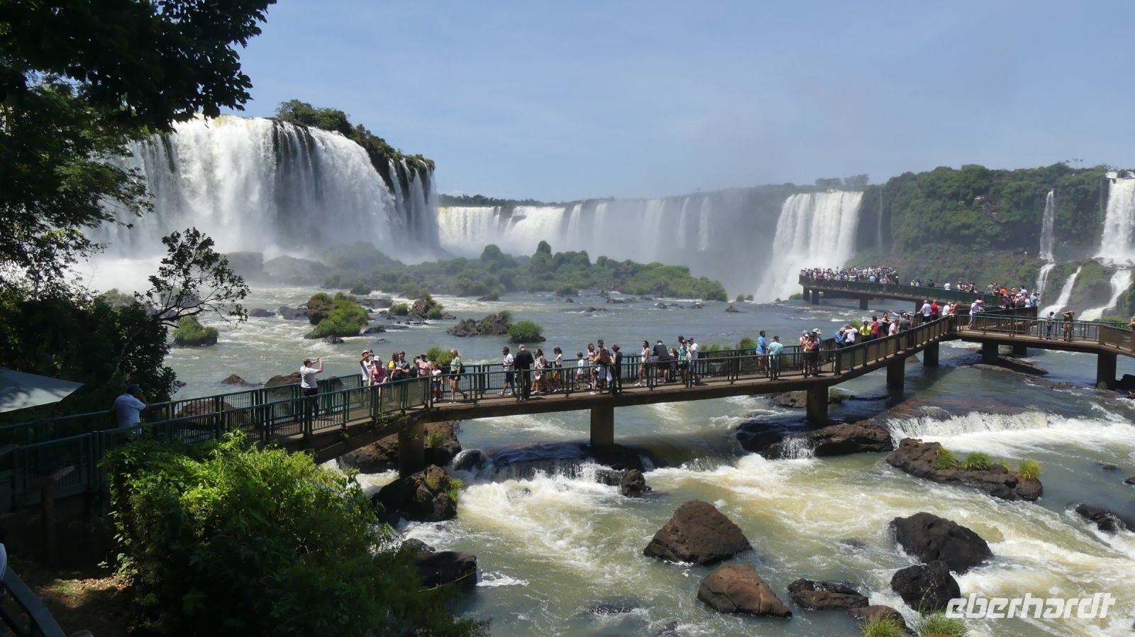 Bis Mittag haben wir ausreichend Zeit, um in aller Ruhe die brasilianischen Seite die Wasserfälle zu besichtigen. Die Temperaturen sind etwas verträglicher als gestern. Zwar hat Brasilien den kleineren Anteil an den Wasserfällen, aber dafür den Panoramablick auf die argentinischen Kaskaden und auf Garganta del Diablo, den Teufelsschlund. Deshalb empfinden wir die brasilianische Seite auch noch schöner. Auf dem ca. 1,5 km langen Wanderweg muss man einfach immer wieder die Kamera zücken, denn es sind einfach wunderschöne Motive aus sich ändernden Perspektiven. Wir erkennen sehr gut die Laufstege und Aussichtspunkte, welche wir gestern auf der argentinischen Seite besucht haben. Der spektakulärste Teil des Wanderweges führt in die Mitte des Flusstales heran an den Teufelsschlund. Spätestens hier wird wohl jedem klar, dass wir uns an einem der größten Naturwunder der Erde befinden.