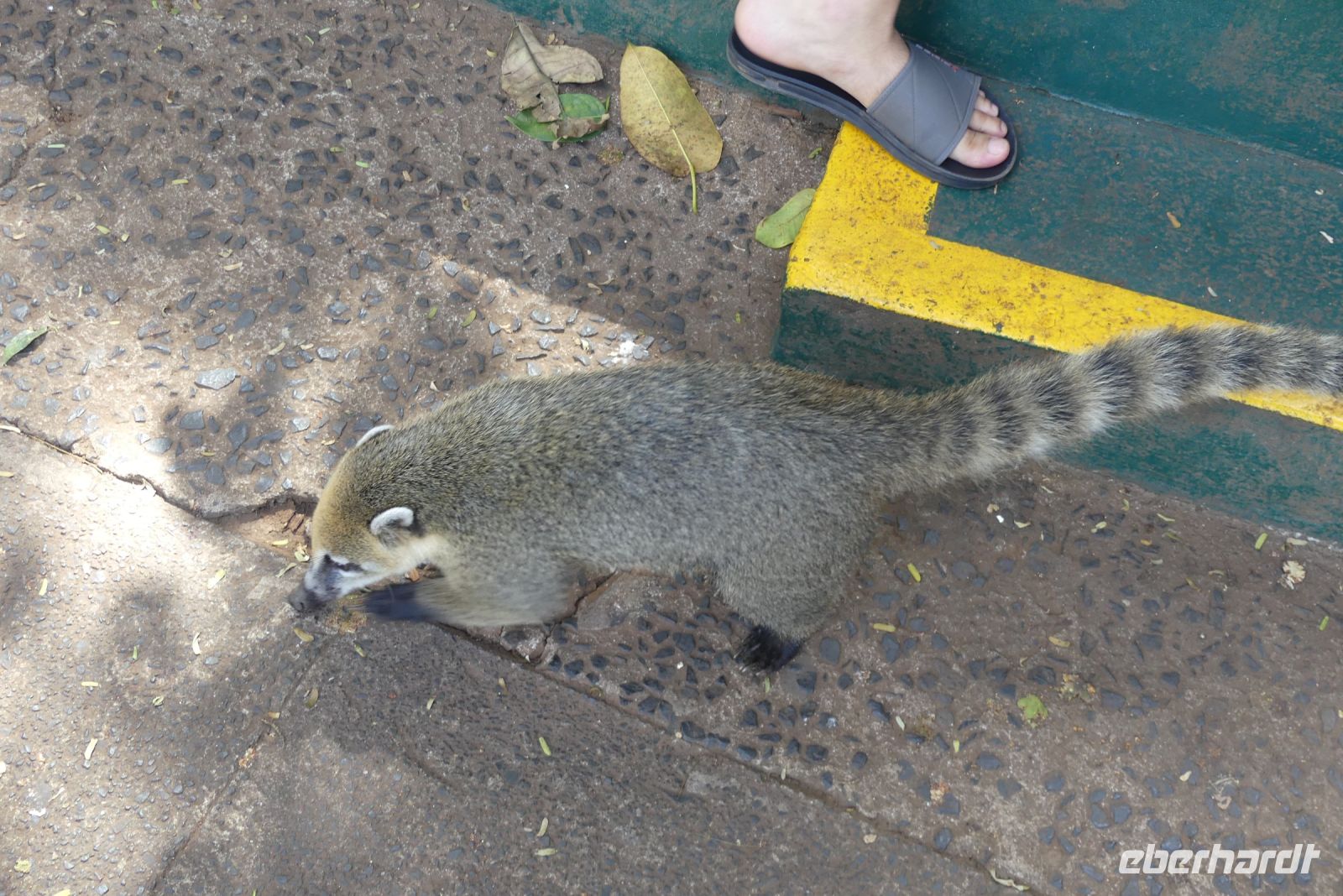 Im Nationalpark Iguazú fahren wir nach einer kleinen Stärkung mit der Parkeisenbahn zur Mittelstation. Diese ist Ausgangspunkt für zwei Wanderungen. Bei schweißtreibenden Temperaturen im Bereich von 33 bis 38 Grad laufen wir zunächst oberhalb der Wasserfälle durch ein bewaldetes Gebiet mit vielen Aussichtspunkten auf den Parana-Fluss und verschiedene Wasserfälle. Die Hitze fordert ihren Tribut: einige verzichten auf die zweite Wanderrunde. Ich begleite nach der ersten Runde erst P., der es nicht so gut geht und benötige dann selbst eine Pause, weil es nicht mehr anders geht.