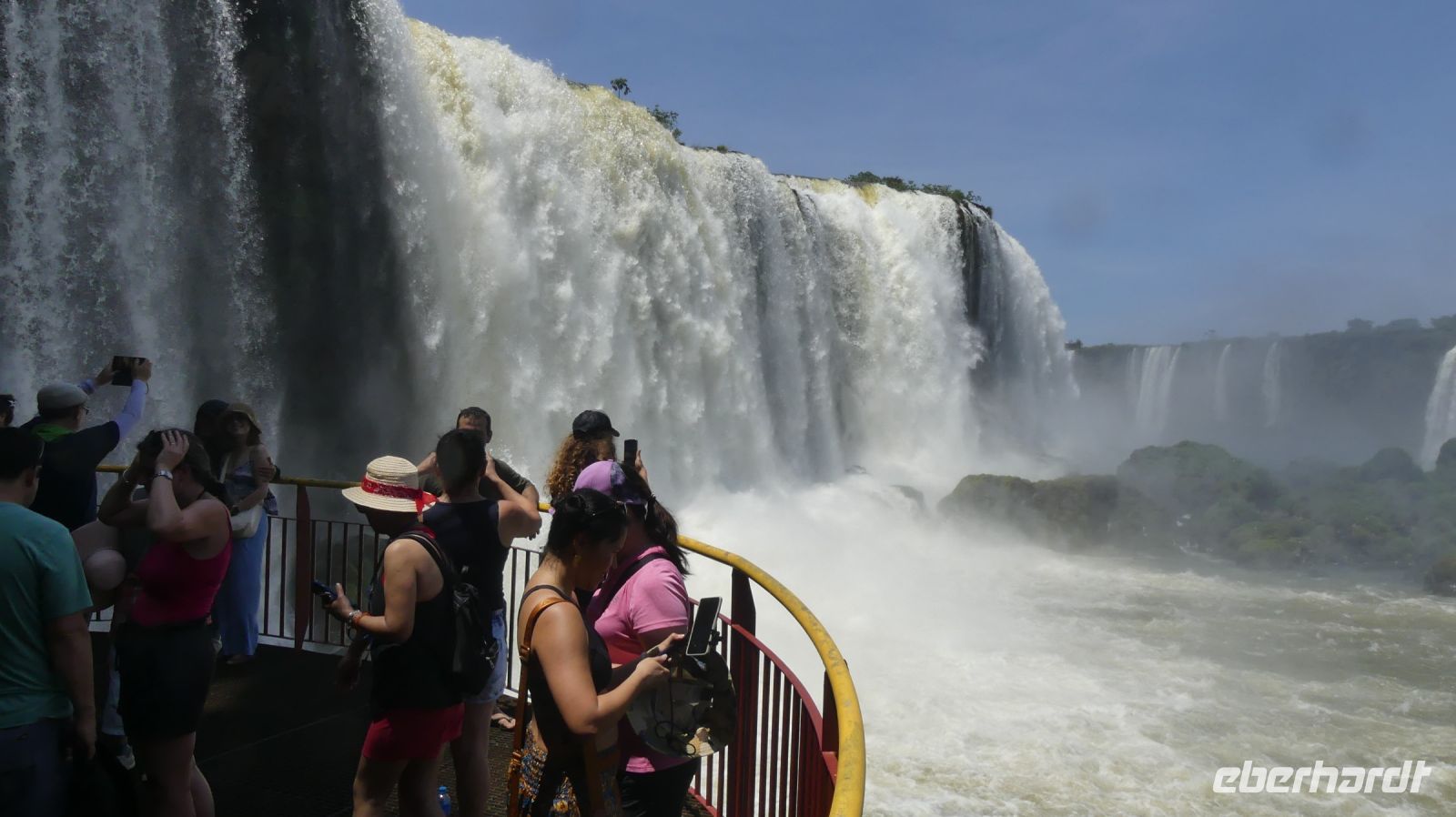 Nachdem es im Einzugsgebiet des Parana-Flusses starke Regenfälle gab, hat im Oktober 2023 ein schweres Hochwasser Schäden an Stegen verursacht. Insbesondere der ca. 1.000 Meter lange Steg zum Garganta del Diablo, dem Teufelsschlund wurde größtenteils zerstört. So können wir diesen Steg nicht nutzen, werden aber den Teufelsschlund morgen in voller Größe auf der brasilianischen Seite sehen können.