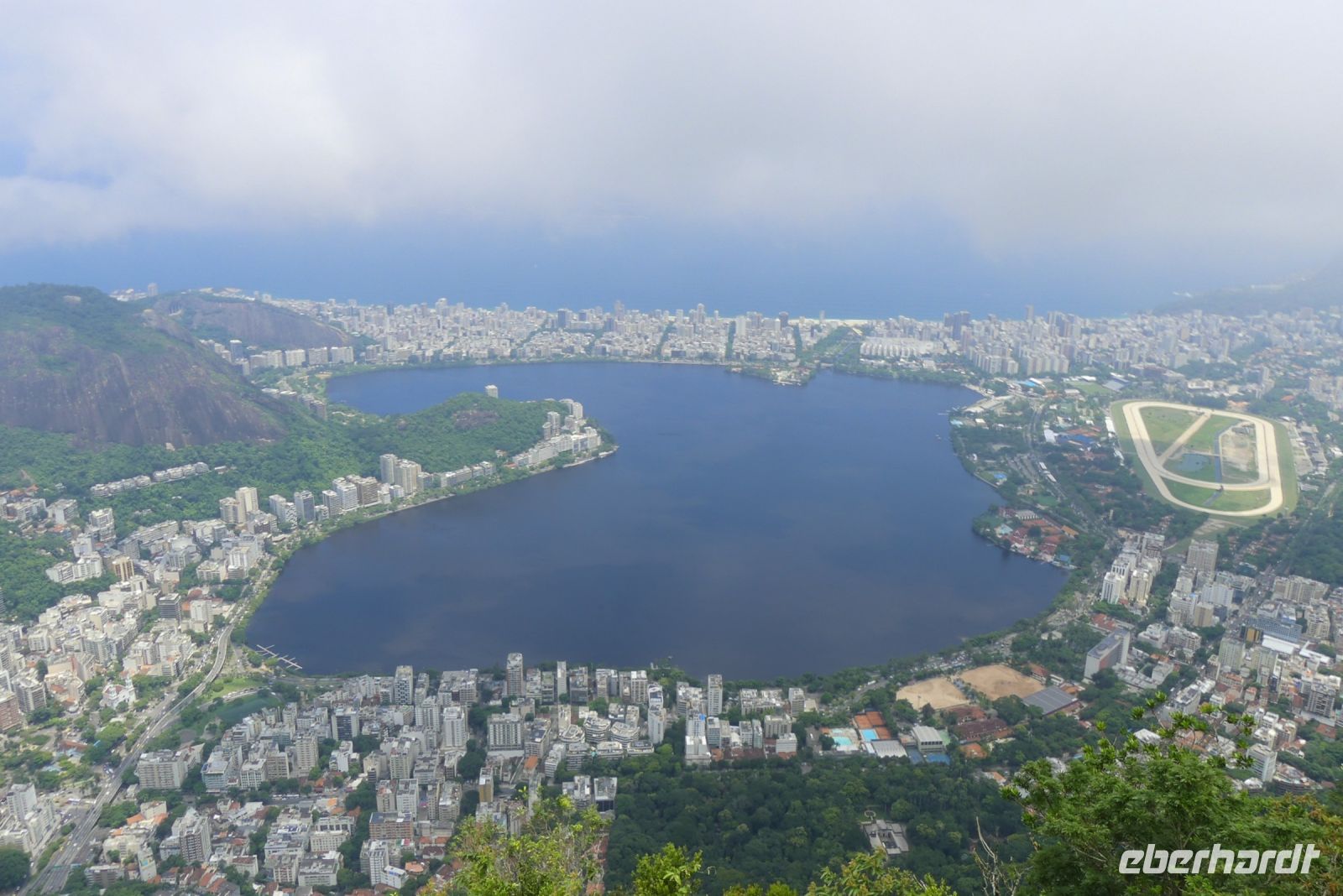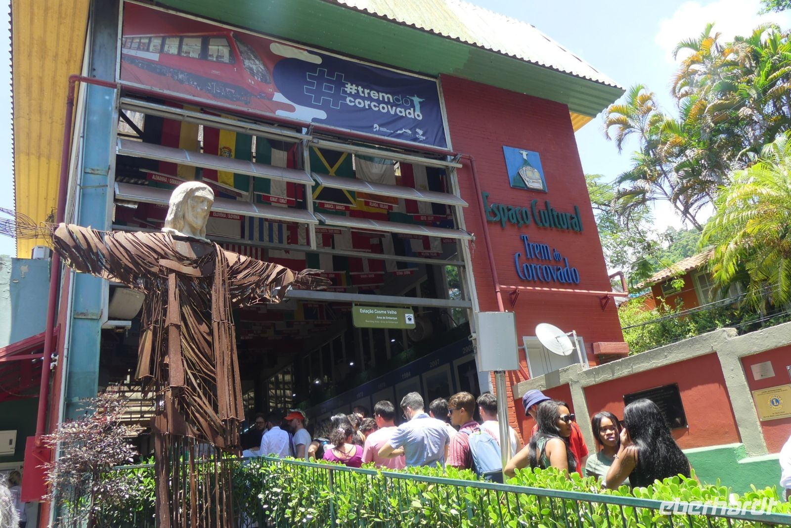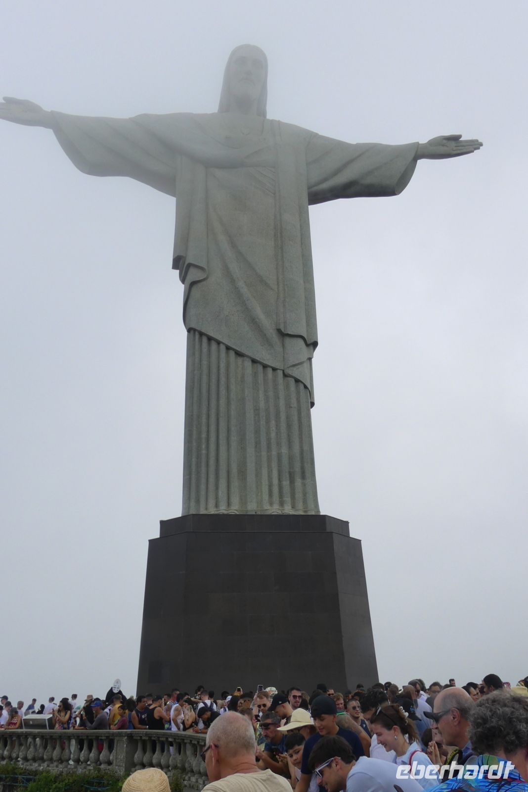 Zunächst besuchen wir den Corcovado, den „hohen Buckligen". Sein rund 700 Meter hoher Gipfel wird von der berühmten Christusstatue gekrönt. Christus umarmt mit den ausgestreckten Armen symbolisch die Stadt. Der Blick richtet sich auf den Zuckerhut, der rechte Arm deutet auf das Meer, der linke auf die Altstadt. Für die Auffahrt müssen wir erst einmal in der Warteschlange schwitzen. Eine Schweizer Zahnradbahn, welche 1884 erbaut wurde, fährt uns schließlich 3,5 Kilometer durch üppigen Regenwald nach oben. Nach der Morgensonne sind jetzt einige Wolken aufgezogen, welche die Sicht einschränken. Die Aussicht reicht bis nach Ipanema und zur großen Brücke, es ist aber diesig und der Zuckerhut versteckt sich in den Wolken.