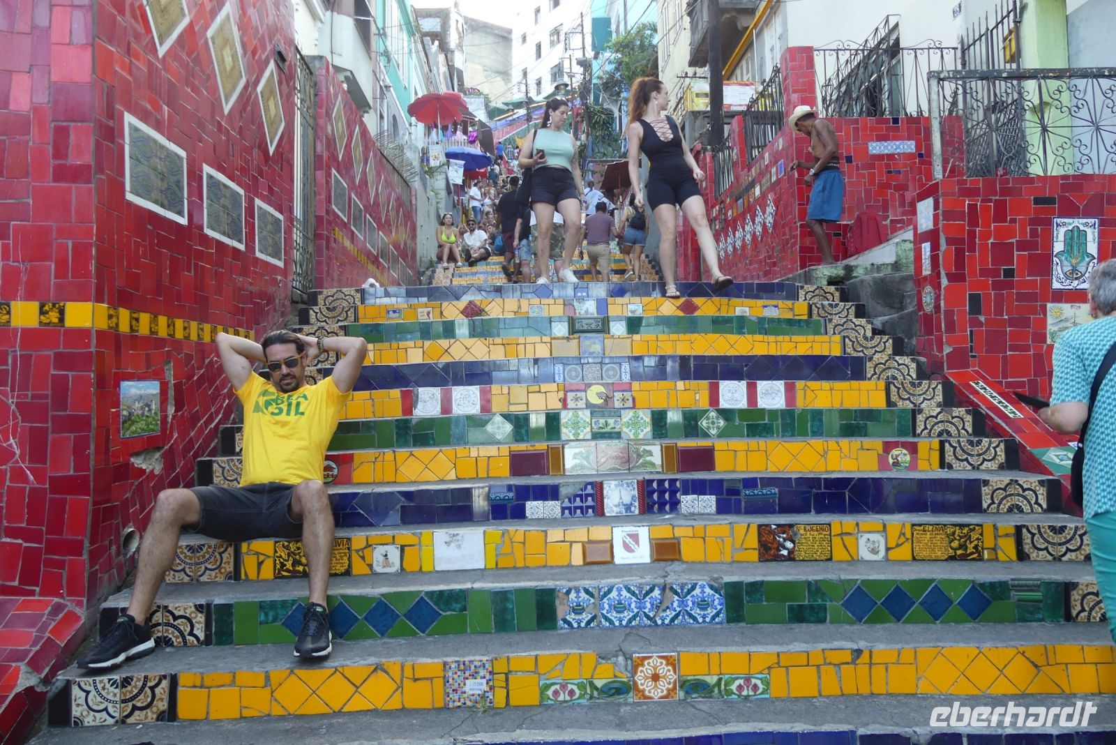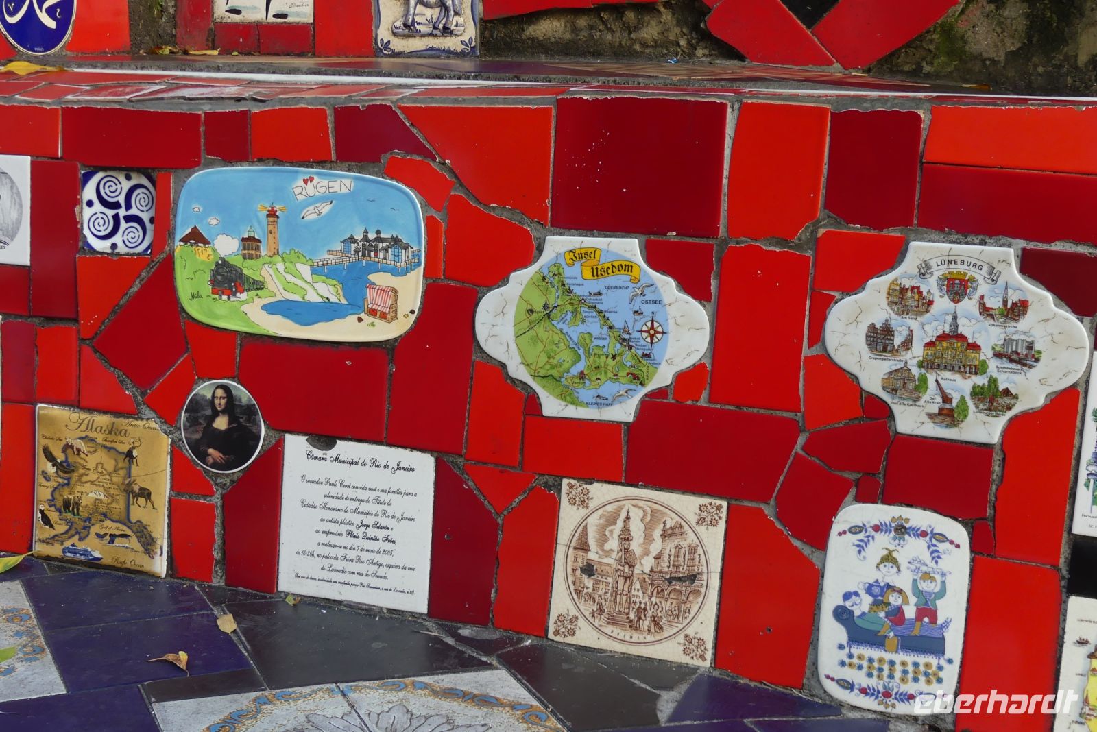 • den Stufen von Selarón. Es handelt sich um das Lebenswerk des chilenischen Künstlers Jorge Selarón. Über Jahre verzierte er die Stufen mit Fliesen aus verschiedenen Ländern. Auch Fliesen aus verschiedenen deutschen Städten entdecken wir.