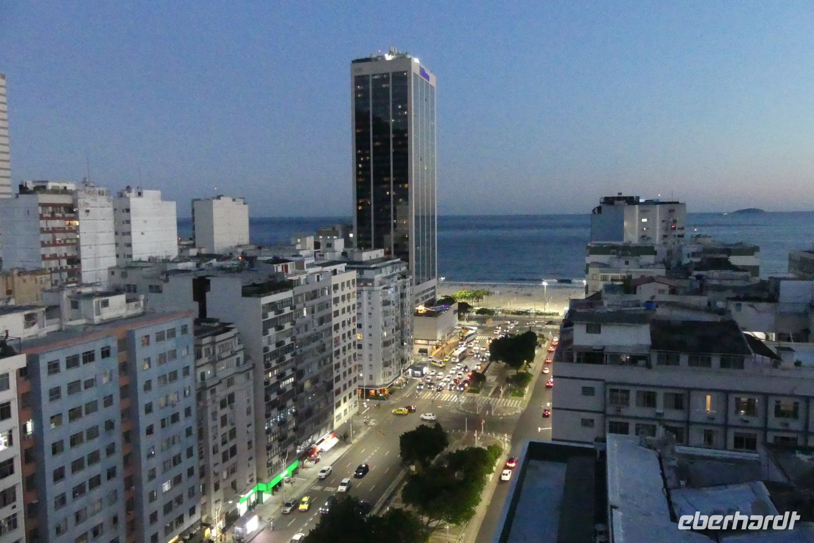 Am Ende des Weges gelangt man entweder zur Fuß oder mittels Fahrstuhl nach oben auf Straßenniveau, wo man den Parana-Fluss sehen kann, bevor er in die Tiefe stürzt. Nach einer Pause oder einem Imbiss geht es weiter zum Flughafen Foz do Iguaçu. Der liegt nur ca. drei Kilometer entfernt. Am frühen Abend landen wir in Rio de Janeiro. Mit unserer Reiseleiterin Heidi fahren wir zum Hotel im Stadtteil Copacabana. Nach einer kurzen Dusche im Hotel laufen wir weiter zum Abendessen im Restaurante Carretão Copacabana, einem typischen Restaurant, wo man von diversen Spießen mit Fleisch probieren kann.