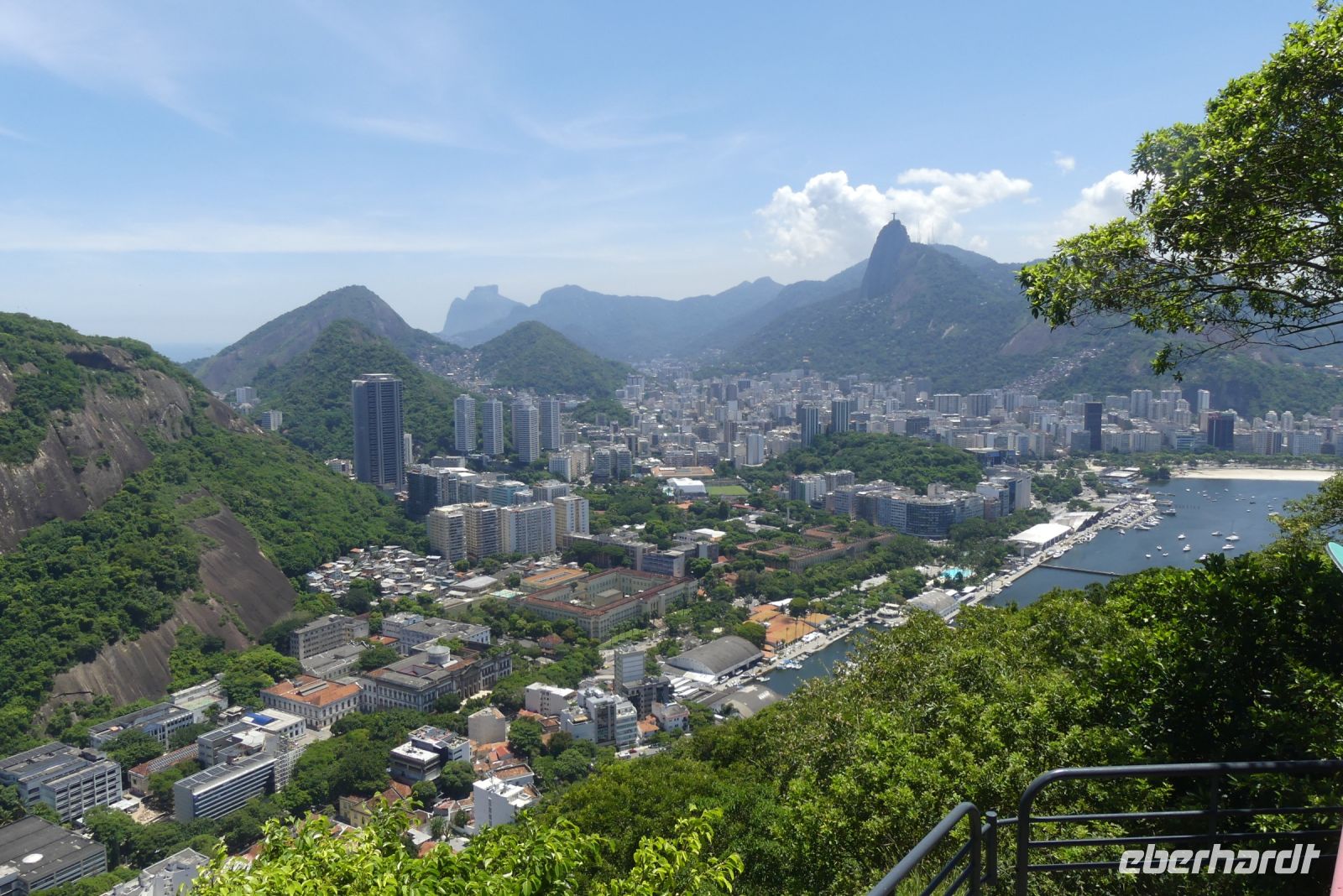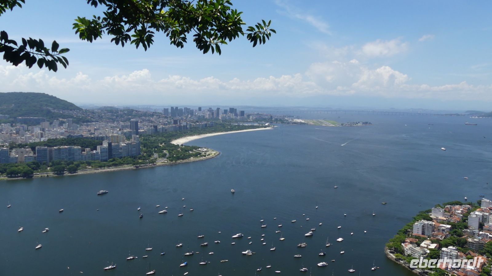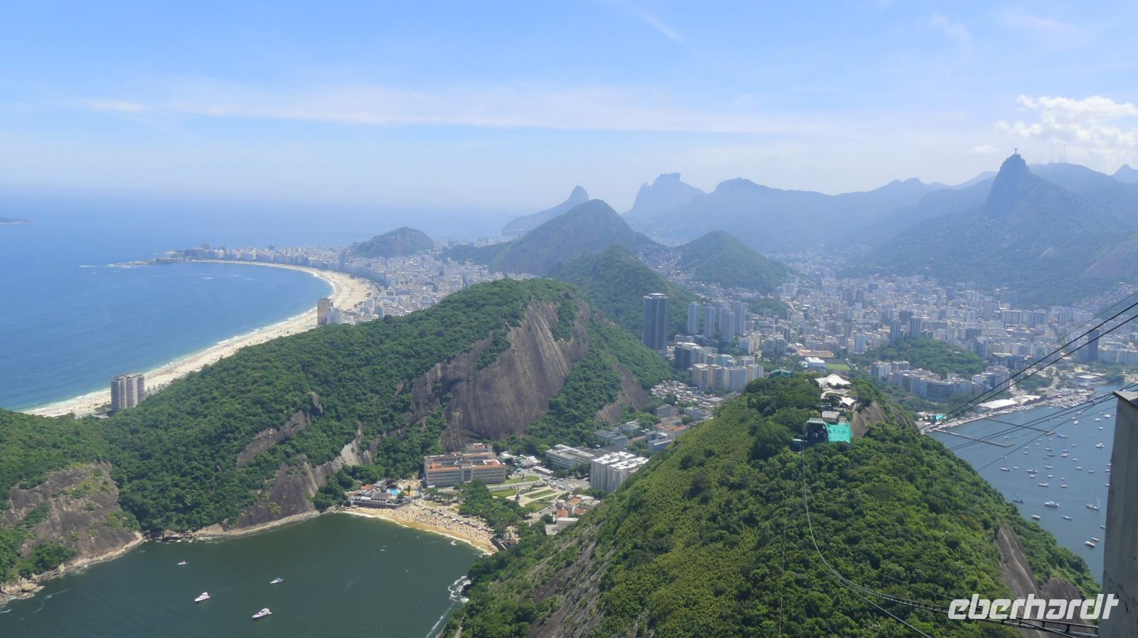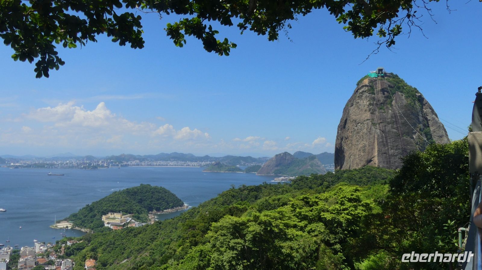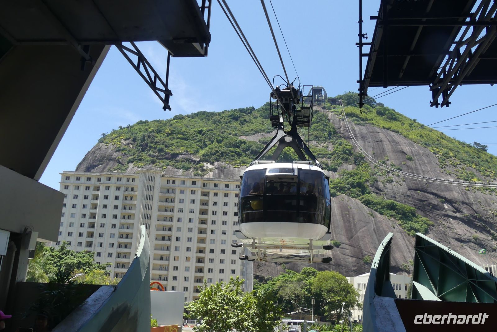 Ein Wahrzeichen von Rio fehlt uns noch – der Zuckerhut. Mit einer Seilbahn aus der Schweiz geht es hinauf zum 396 Meter hohen „Pao de Acucar". Der Zuckerhut markiert die Hafeneinfahrt in die riesige Lagune. Bereits die Zwischenstation „Morro da Urca" bietet schöne Ausblicke auf die Stadt wie den Flamenco Beach, Favelas und den kleinen Inlandsflughafen. Heute ist das Wetter ideal, keine tief hängenden Wolken stören die Aussicht.