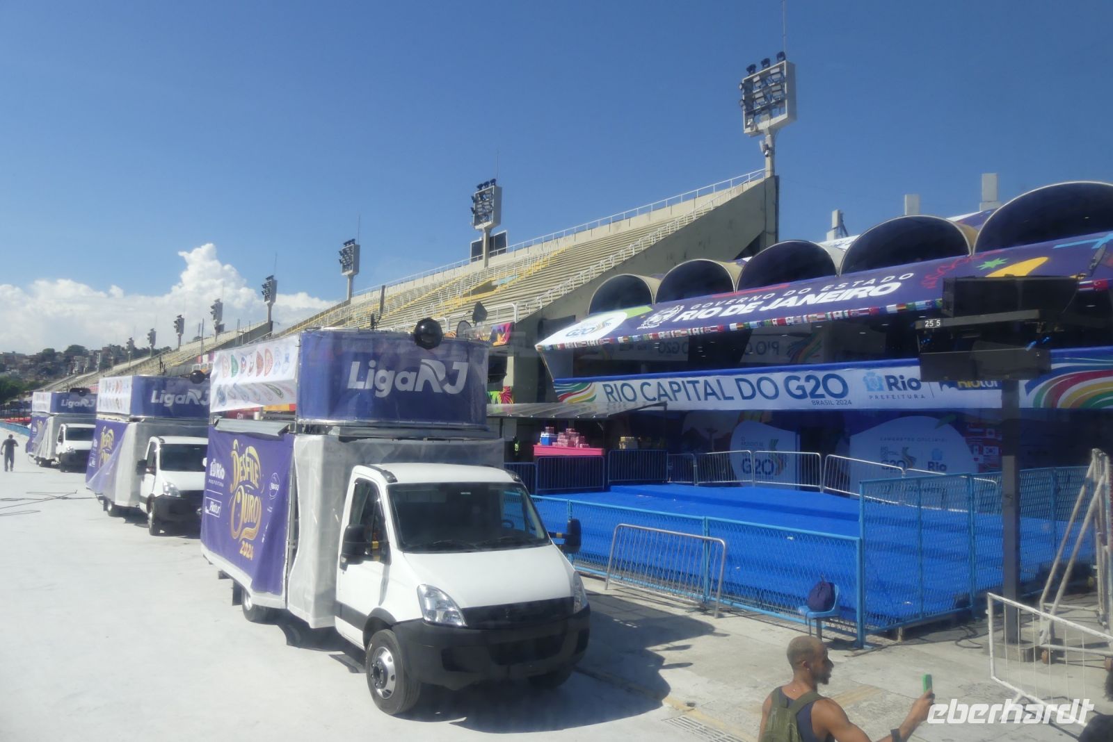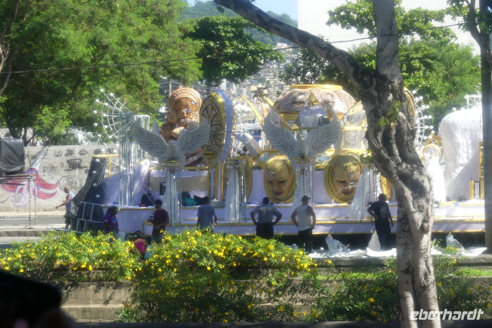 Nach dem Zuckerhut fahren wir zum Sambadrom. Hier laufen die Vorbereitungen für die anstehenden Carnevalsumzüge am Wochenende. Heute Abend wird die unterste Kategorie beginnen. Farbenfrohe fantasievolle Umzugswagen positionieren sich bereits im Umfeld des Sambadroms und es wird noch an den Wagen gebastelt.