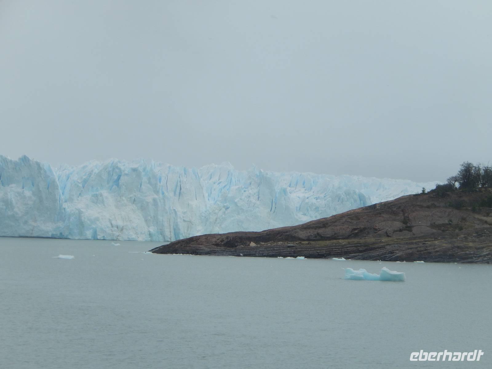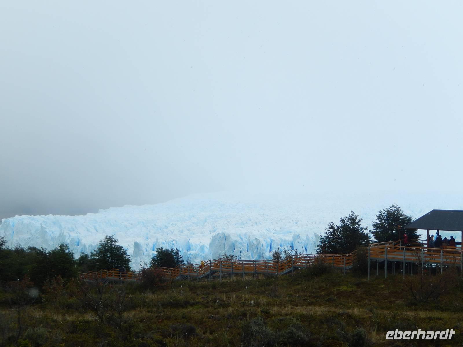 Nach dem Frühstück starten wir mit Magalie Richtung Magellan Halbinsel um den gewaltigen Gletscher Perito Moreno zu besichtigen. Je weiter wir auf der Halbinsel hervordringend, desto stärker schneit es. Alles um uns herum ist nebelig weiß. Da wir nichts sehen können, erklärt und Magalie mit Hilfe vieler Karten und Bildern die Flora, Fauna und geografischen Besonderheiten von Patagoniens Süden. Anschließend setzen wir mit einem Boot auf Argentiniens größten See, dem Lago Argentino, hinüber zum Perito Moreno. Der See wird von mehreren Gletschern gespeist und weist daher eine eisblaue, milchig-trübe Farbe auf. Es ist eiskalt, mit Winter haben wir hier in Argentinien nun doch nicht gerechnet! Laut Reiseleiterin Magalie ist dies auch sehr ungewöhnlich für diese Jahreszeit, hat es doch das letzte Mal vergangenes Jahr zu Weihnachten geschneit. Doch hält uns das Wetter nich davon ab an Deck Erinnerungsfotos von den vorbeitreibenden blauen Gletscherbruckstücken zu schiessen. Kurze Zeit später erblicken wir den Perito Moreno, eine 4 Meter hohe Gletscherwand baut sich vor uns auf Der Perito Moreno ist nicht der größte Gletscher der Gegend, jedoch der meist besuchte. Er gehört zu den wenigen Gletschern auf der Welt die immer noch wachsen. Und kann man an ihm ein bewegendes Naturschauspiel beobachten: dieser Gletscher "kalbt" des Öfteren, das heißt es lösen sich Gletscherbrocken ab und krachen mit gewaltigem Getöse in den See und lösen eine mächtige Flutwelle aus. Aus diesem Grund nähern wir uns dem Gletscher auch nur mit ausreichenden Sicherheitsabstand. Selbst beim heutigen grauen Himmel ist der Gletscher ein Traum, kommt der Kontrast zur Umgebung doch besonders gut zur Geltung. Mit vielen tollen Fotos im Gepäck legen wir an einer nahegelegenen Snackbar an. An diese schließt ein ausgeklügeltes System von Wegen und Stegen an, die uns Besuchern strategische günstige Aussichtspunkte bieten. Nun können wir den Gletscher aus der Höhe sehen und bekommen einen Eindruck von seiner enormen Weite. Einige von uns verweilen noch und beobachten den Gletscher beim kalben, der Rest begibt sich in die Snackbar und wärmt sich bei Tee und leckeren Empanadas auf. Zurück im Hotel begeben wir uns nochmal auf einen Bummel in die Stadt und essen danach im Hotel zu Abend.