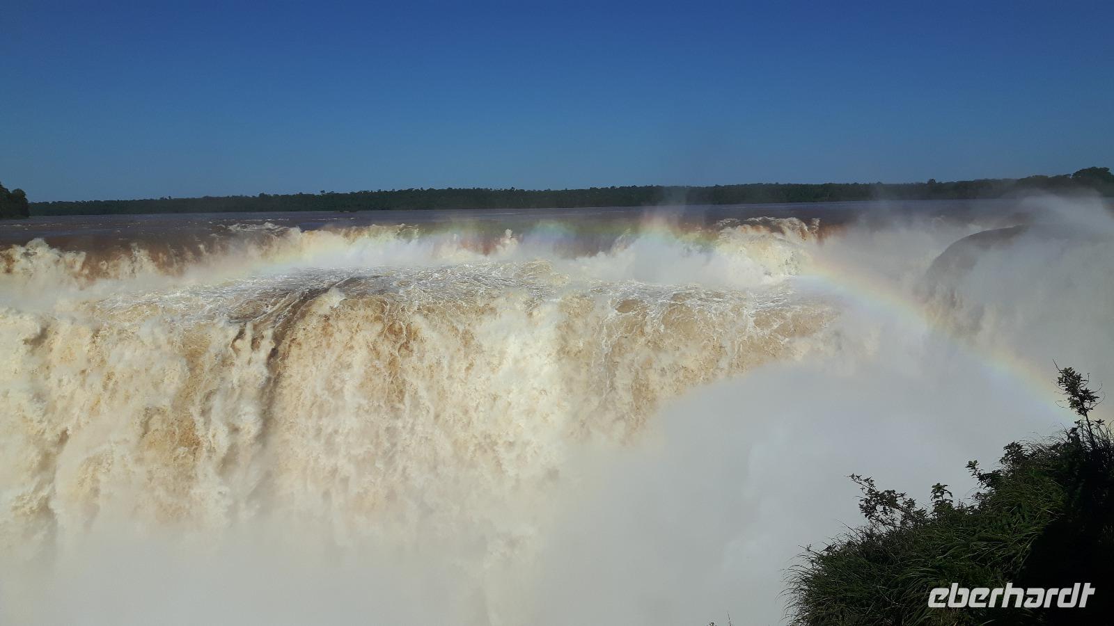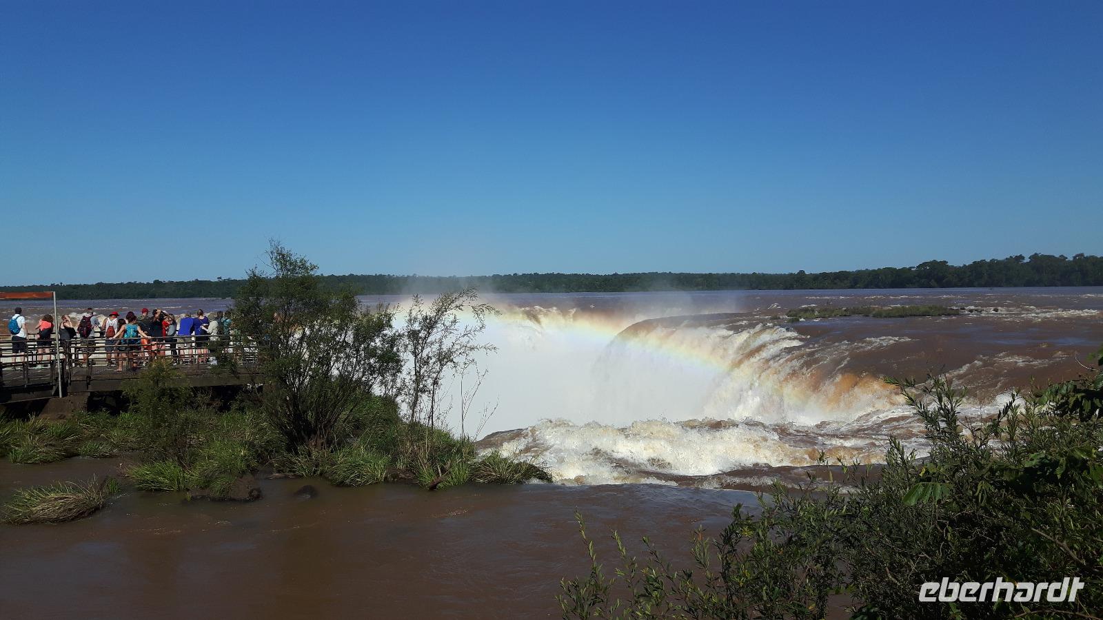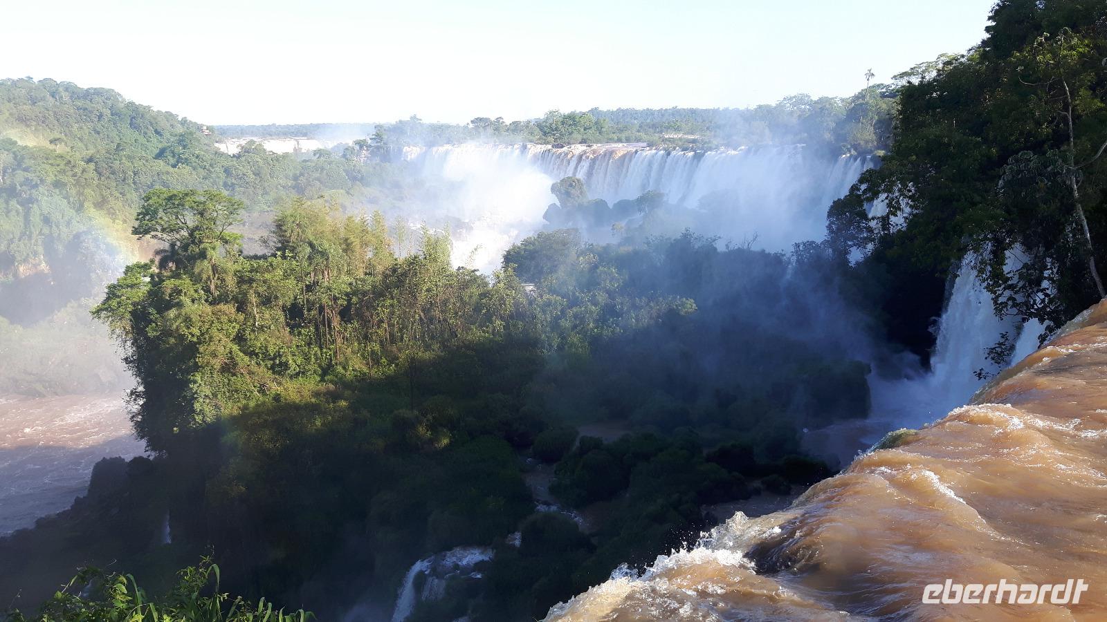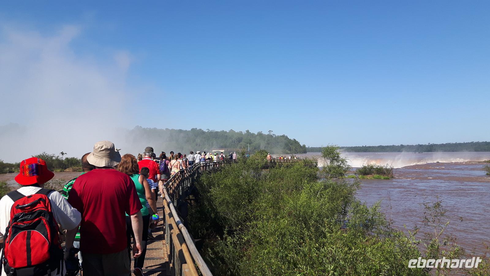 Das nächste Abenteuer ließ nicht lange auf sich warten...! Aber der Reihe nach... Am Vormittag fuhren wir erst einmal zum Regionalflughafen von Buenos Aires - viele Straßen der Stadt waren allerdings derart verstopft mit Fahrzeugen, dass ich sogar für einen Moment dachte, wir würden unseren Flieger nach Iguazú niemals erreichen! Die Aufregung war glücklicherweise umsonst, denn alles verlief dennoch reibungslos... Unser erster inner-argentinischer Flug stand an - weitere fünf Flüge innerhalb des Landes sollten die nächsten Tage folgen! Ich hatte im vorab so einiges gehört - Verspätungen, Streiks usw. und somit war auch ich etwas aufgeregt, aber es fügte sich alles zusammen und die Fluggesellschaft Aerolineas Argentinas wird mir im Nachhinein in sehr angenehmer Erinnerung bleiben! Mit leichter Verspätung kamen wir in Iguazú an und in der Empfangshalle des wahrhaft sehr übersichtlichen Flughafens (mit nur 2 Gates!) entdeckten wir sofort unsere temperamentvolle örtliche Reiseleiterin Sara. Im Bus lagen dann Lunch-Pakete inkl. Wasser bereit, so dass wir keine Zeit verloren und uns sofort zum Iguazú-Nationalpark auf argentinischer Seite aufmachen konnten. Am Eingang des Parks angekommen, unternahmen wir eine kurze Fahrt mit einer Schmalspurbahn, um schließlich weiter entlang von bequemen vergitterten Laufstegen die verschieden Perspektiven dieses großartigen Wasserfalls zu erleben!